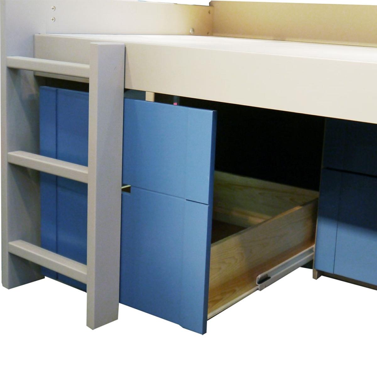 The Dominique Mid Sleeper Bed with desk and drawers is the perfect answer to keeping your kids happy, and you happy, with a tidy room! Part of a collection of Luxury Kids Beds from Mathy By Bols, this bed is ideal for every day use and a practical storage solution, featuring 5 stroage drawers under the bed and a pull out desk creating a great spot to do homework or arts and crafts. Then when work is done it can be easily stored away under the bed. With 26 colour choices available, there's something for every boy and girl. Handmade in Belgium, the bed is made from solid pine and requires two person self assembly.