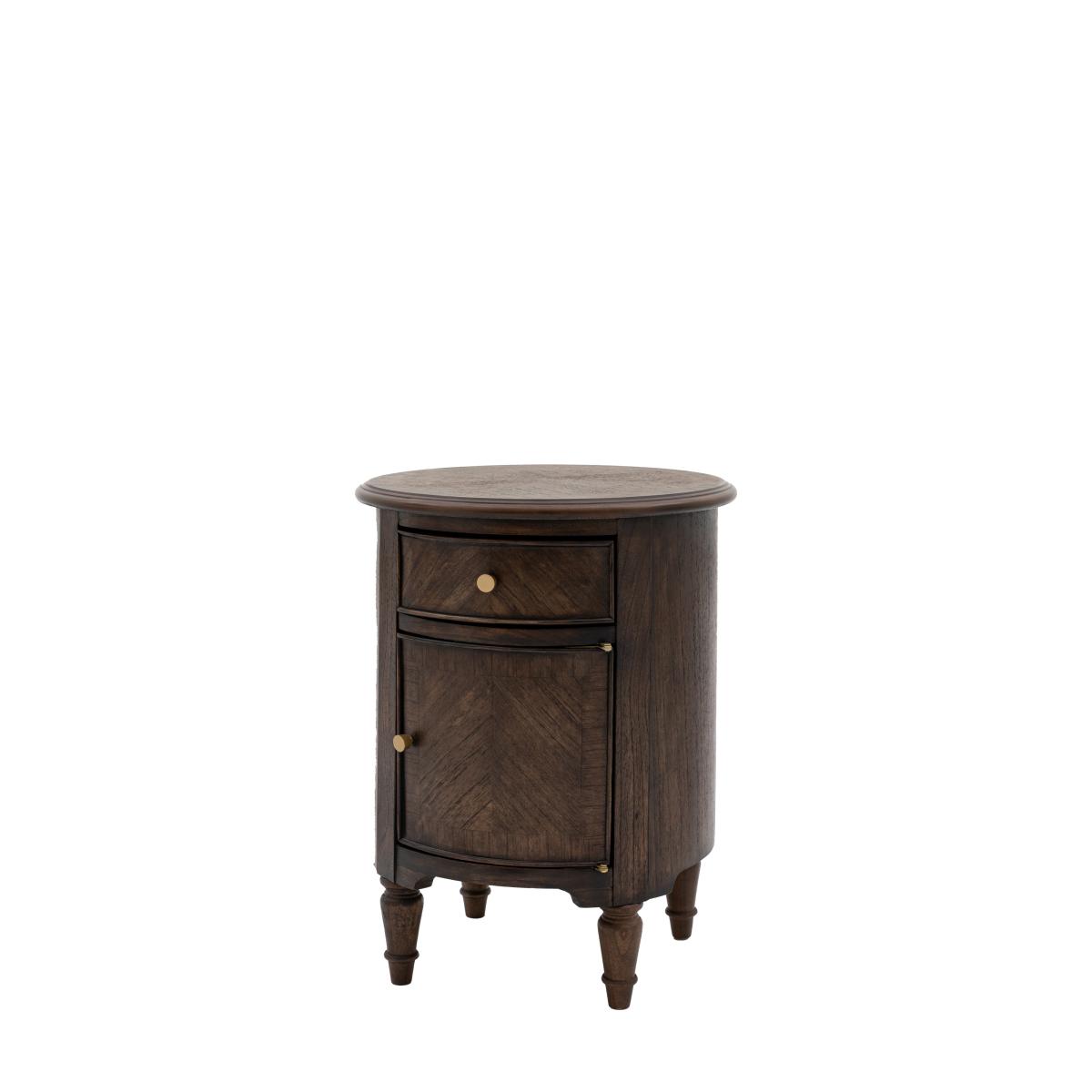 Offering a new take on a traditional look with a timeless elegant style and a modern touch. In dark salvaged coffee coloured Mindy wood solids and veneers and featuring marquetry details this drum side table is elegantly sophisticated. The satin brass handles and turned spindle feet add the finishing touch. A small drawer and cupboard make this side table a stylish storage solution, perfect for the bedroom or living spaces alike.