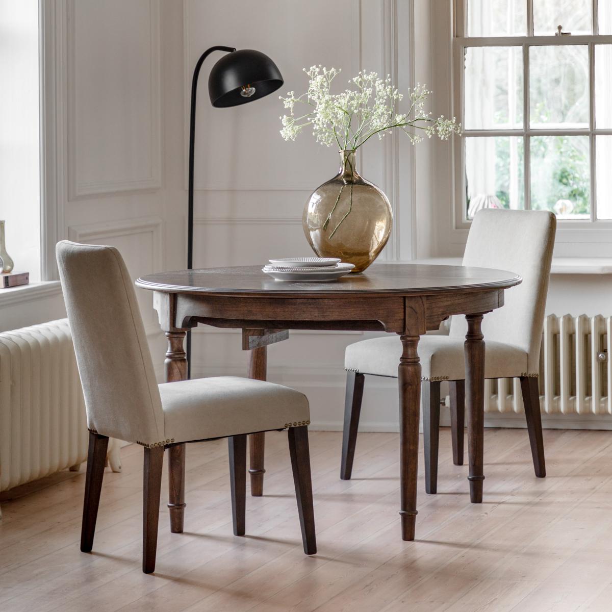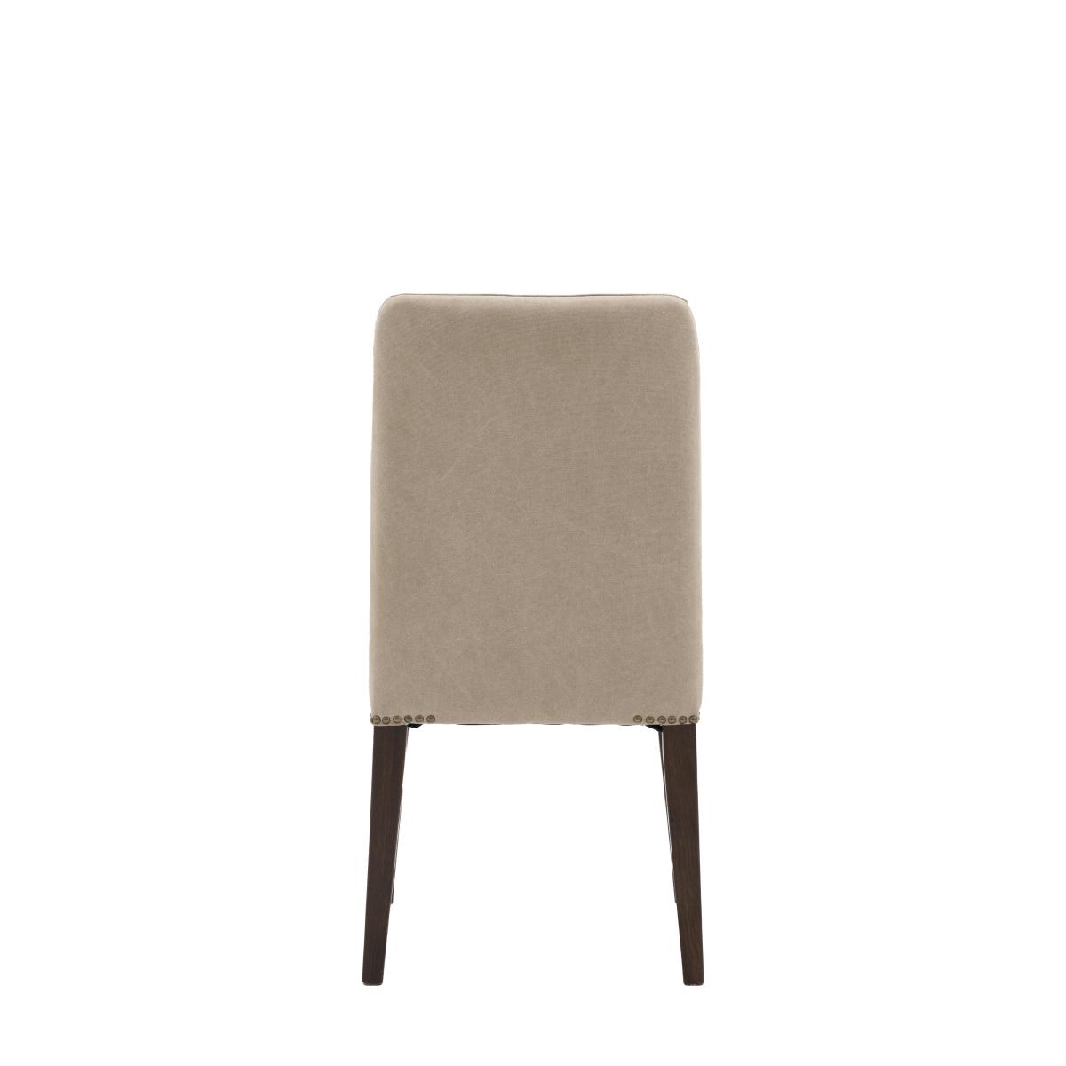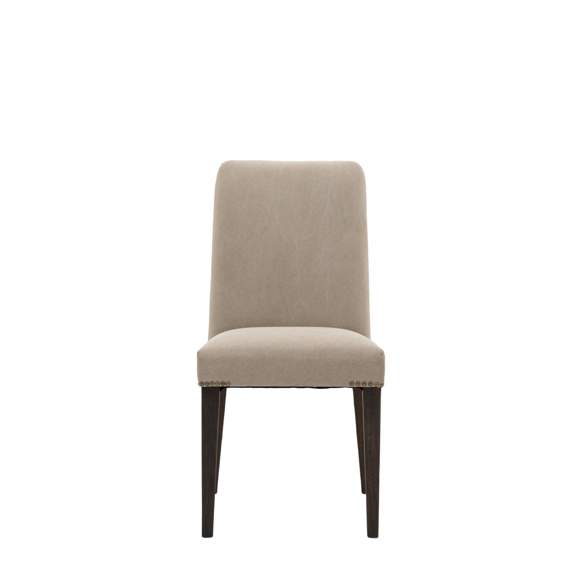 * Includes 2 x dining chairs* Upholstered* Metal detailing* Timber legs Whether you have a modern interior or a more traditional style, these dining chairs will look great in your dining space. The seat and back have an upholstered neutral grey linen finish with metal detailing. The chair remains sturdy thanks to the coffee reminiscent timber legs.