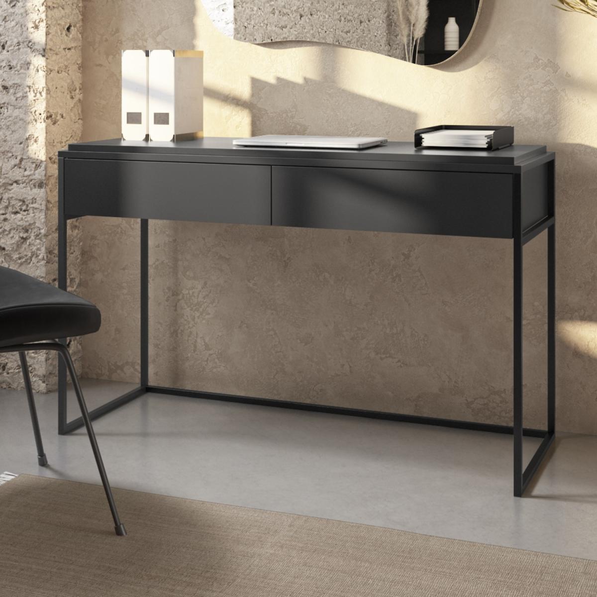 Industrial-inspired office desk in matt black With a handleless drawer with push open mechanism Office chair provides comfort with backrest 360-degree swivel and adjustable seating height ensures practicality while you work or study Generous workspace with a drawer for extra storage Need to know Office Desk Information Product weight: 34kg Total number drawers: 1 on metal runners Colour: Black Finish: Matt veneered wood Material: Strong MDF board and iron (leg base/frame) For use: Indoors Assembly required: Yes Office Chair Information Weight: 8.4kg Colour: Black, gold (base and frame) and black (castors) Finish: Upholstered and polished (base and frame) Material: Velvet fabric, foam and metal For use: Indoors Assembly required: Yes