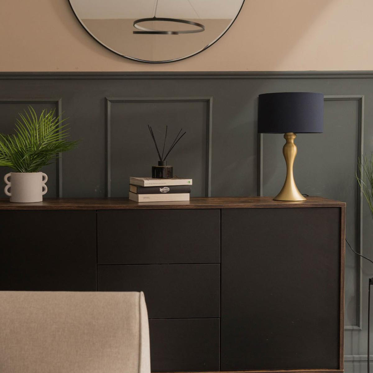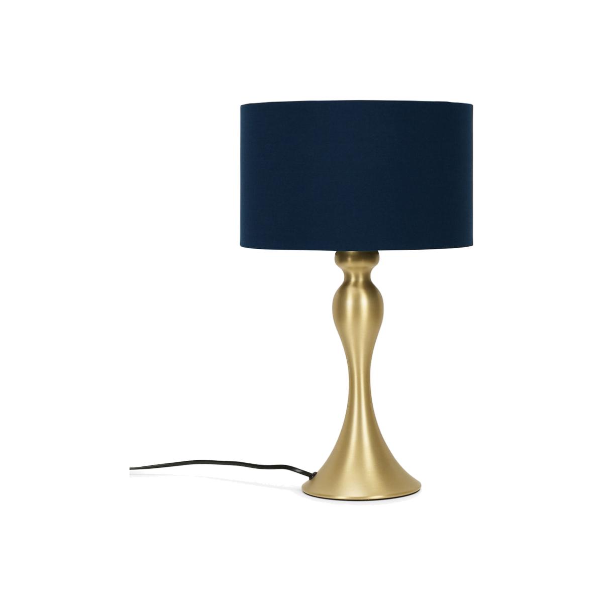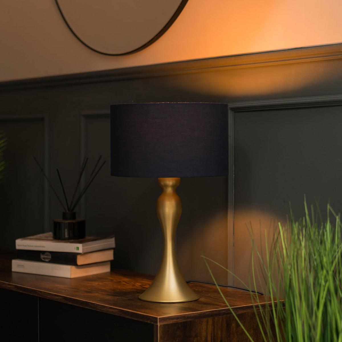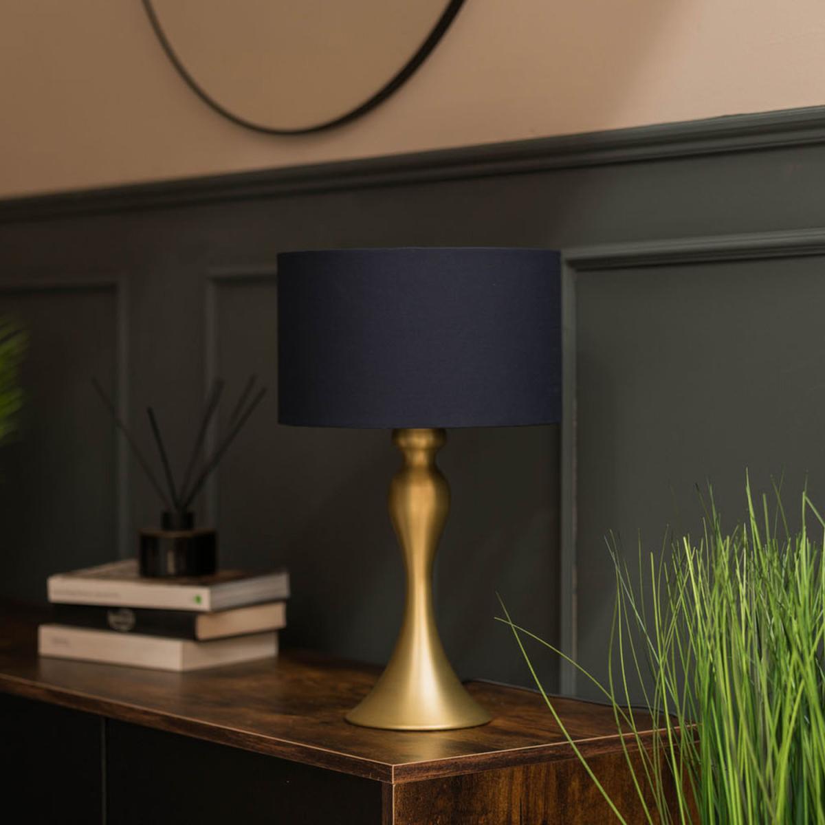 This beautiful and sumptuous Faulkner table lamp is magnificent Its shapely design evokes a curvy style of impressive grand richness It holds a fully assembled navy blue Reni shade and comes in a stunning matt gold finish For a bright and positive modern taste, it works amazingly in both a bedroom or lounge Requires a 40W ESE27 LED bulb or equivalent