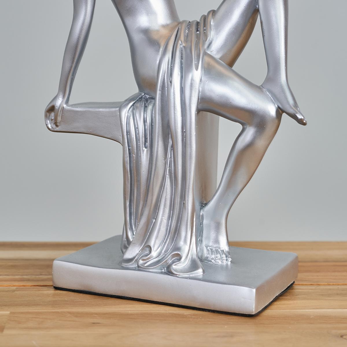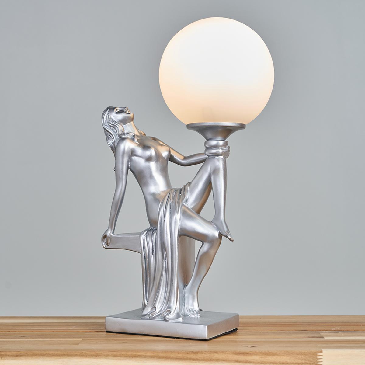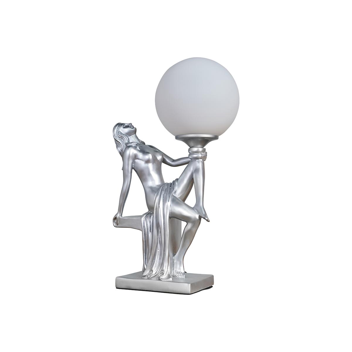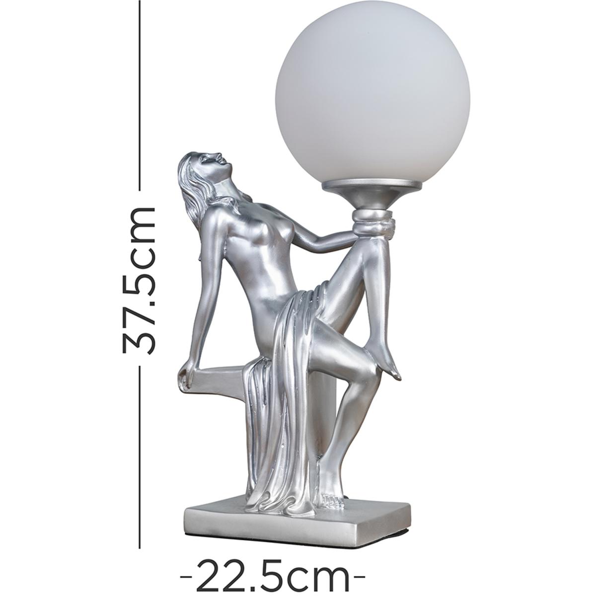 Modern sculptured lady table lamp in heavy matt silver polyresin finish. The lady on the lamp is holding the white frosted glass bulb holder in a classic art deco style. Features an in-line switch for easy use. This table lamp is fantastic in any room to add subtle mood lighting or to compliment other lighting.