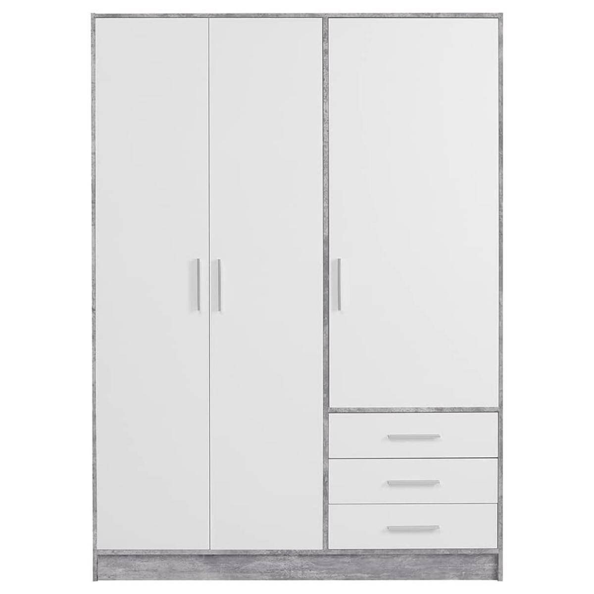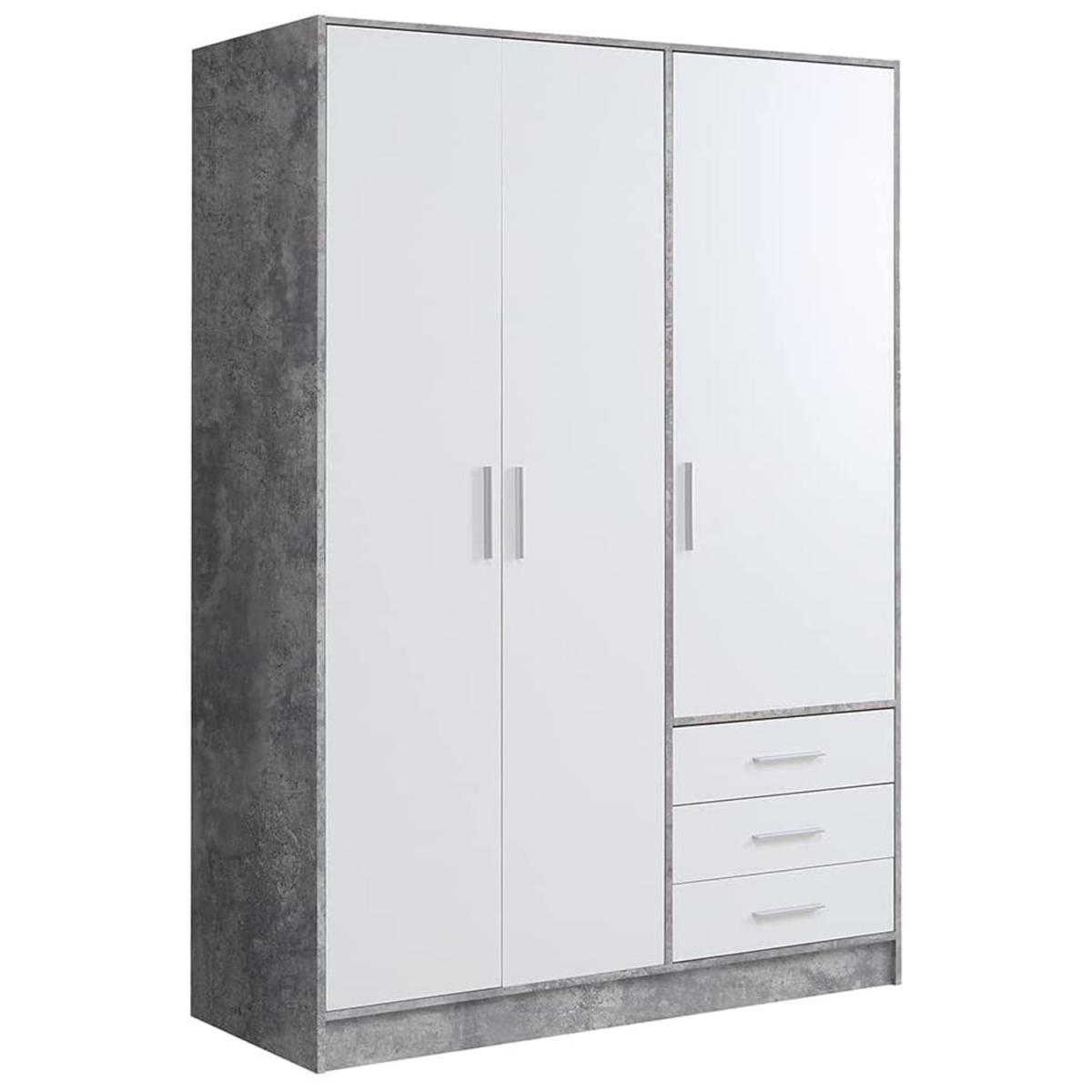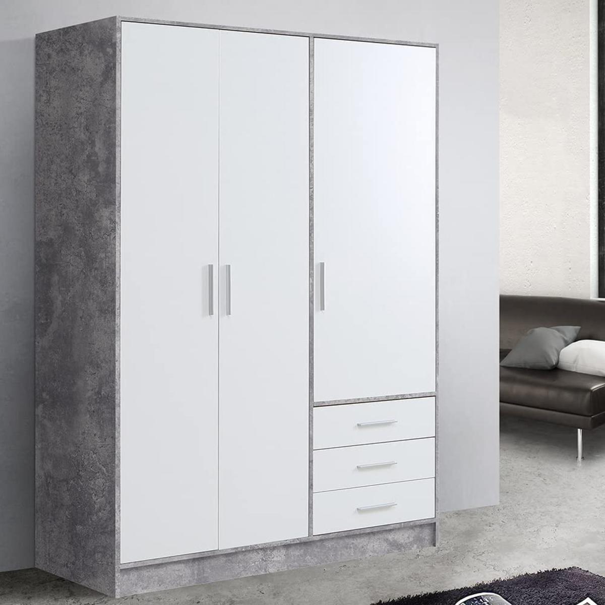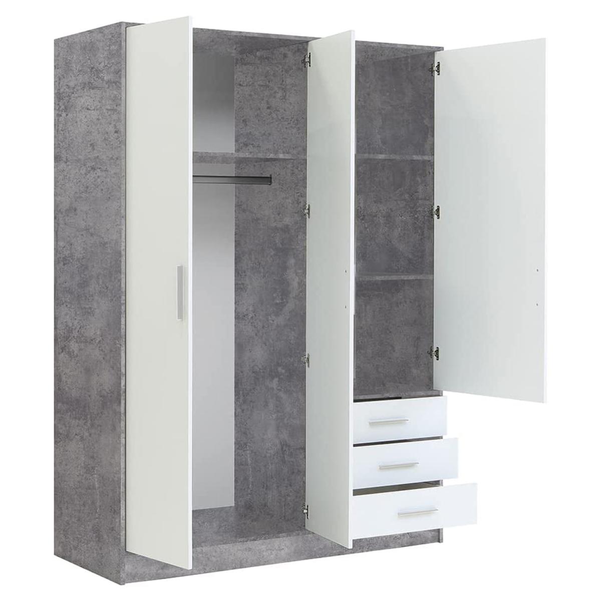 This 3 door 3 drawer wardrobe is a stylish and functional addition to any bedroom. The exterior of the wardrobe features a modern combination of matt white and concrete grey finishes that complement each other perfectly, giving the wardrobe a sleek and contemporary look. The wardrobe is divided into two sections, each with its own door. Inside each section, there is tons of storage space, allowing you to easily organize your clothing items. Additionally, there are three large drawers at the bottom of the wardrobe, providing ample storage space for folded clothes, linens, or any other items you want to keep out of sight. The wardrobe is constructed from high-quality materials, ensuring its durability and longevity. The doors and drawers provide a smooth and quiet operation, while the metal handles add a touch of sophistication to the overall design. Overall, this 3 door 3 drawer matt white and grey combination wardrobe is a practical and stylish solution for your bedroom storage needs.