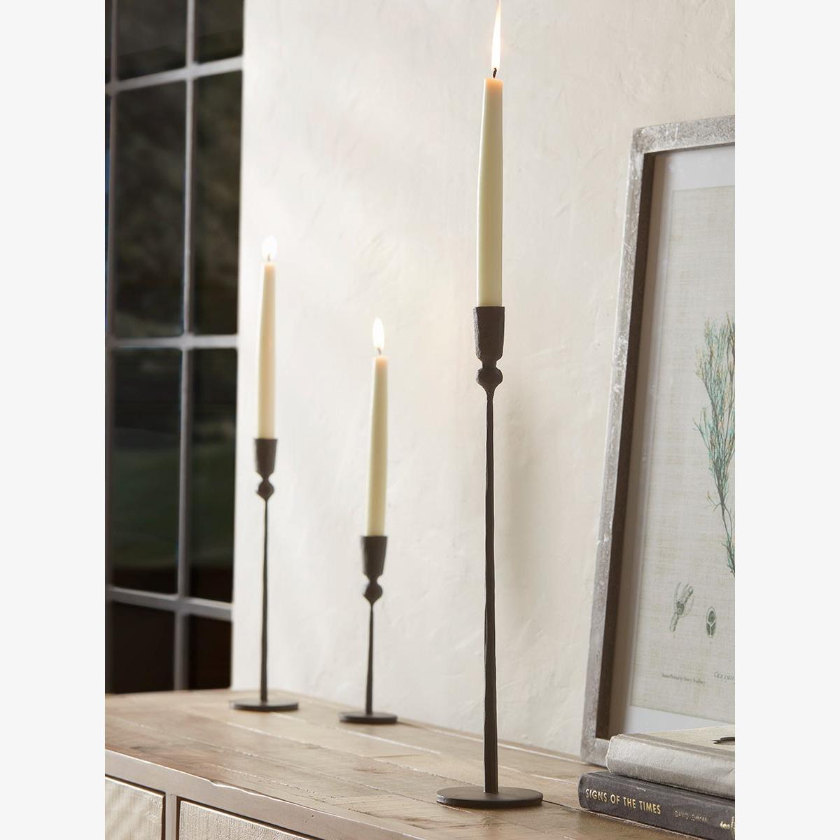 So simple and yet so enduringly stylish, our matte black dinner candle holders will make a timeless addition to your dining table, mantelpiece or indeed any position you fancy. Tall and elegant in stature, the rustic matte black highlights the hand forged markings which gives each candlestick its character. Available in three sizes, they look sophisticated in matched pairs or arrange a few of different heights for a more fluid look. Also available in medium and small.