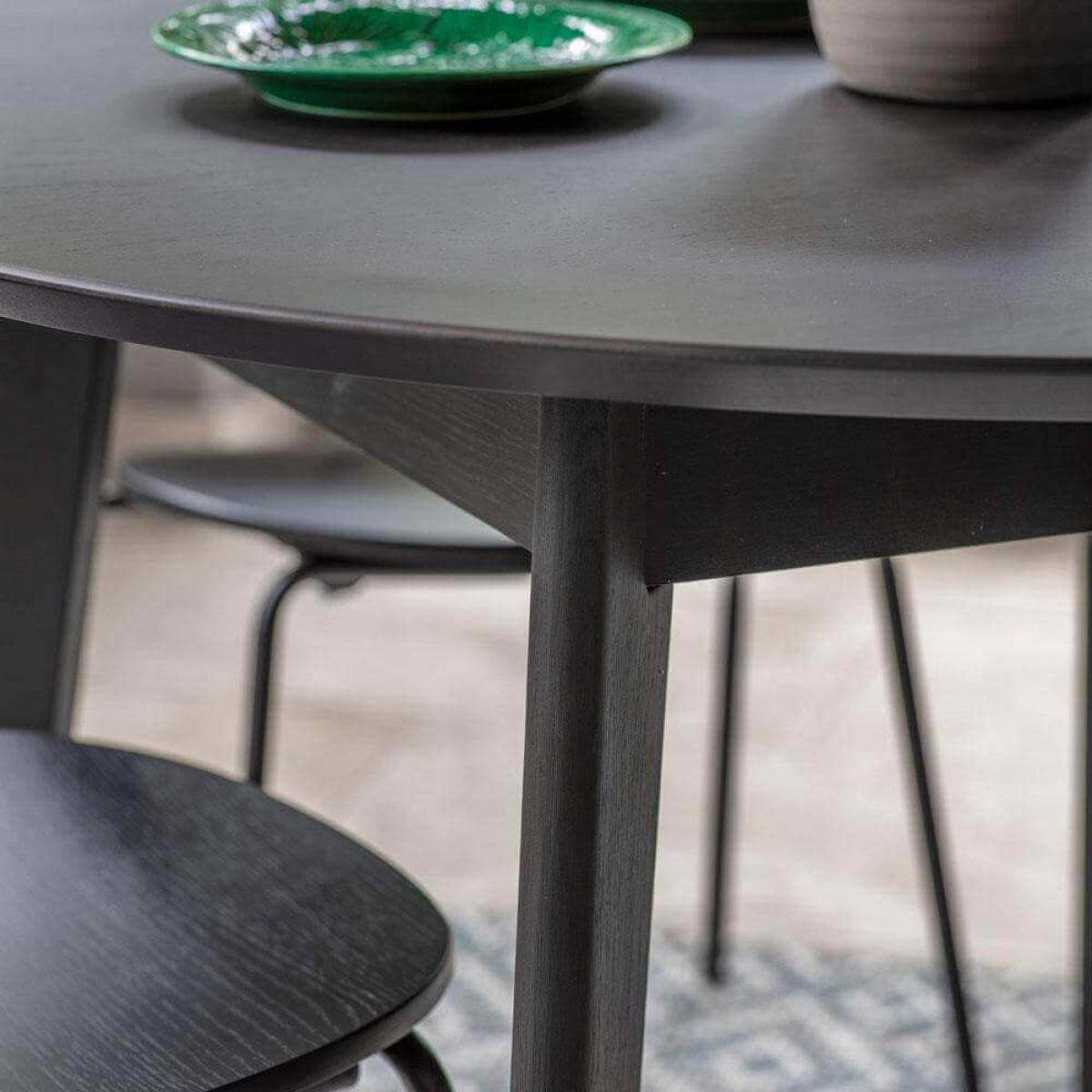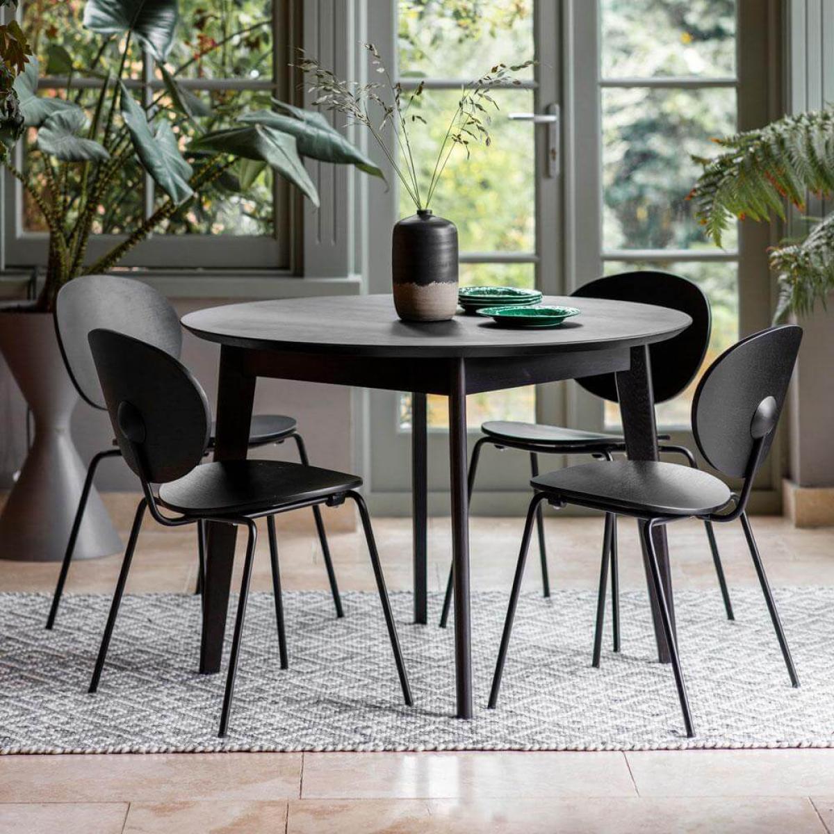 The Matte Oak Round Dining Table marries sophistication and function. The round dining table is an enduring design for the home, and here it is given a clean and fresh update. This round oak table displays all the hallmarks of compact modern living and still shines with its functionality. A solid disc of thick oak wood sits tightly atop of robust slightly splayed table legs and has a generous surface space of 1. 1 metres diameter. A black matte finish presents the oak nicely for the modern home interior, it also allows the natural oak grain to subtly emerge through the coat. This table’s size and shape works in tighter spaces but also offers ample dining space as any 4 seat dining table should. Recommended pairing with the Dalby chair.