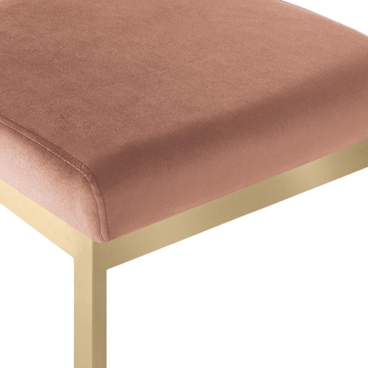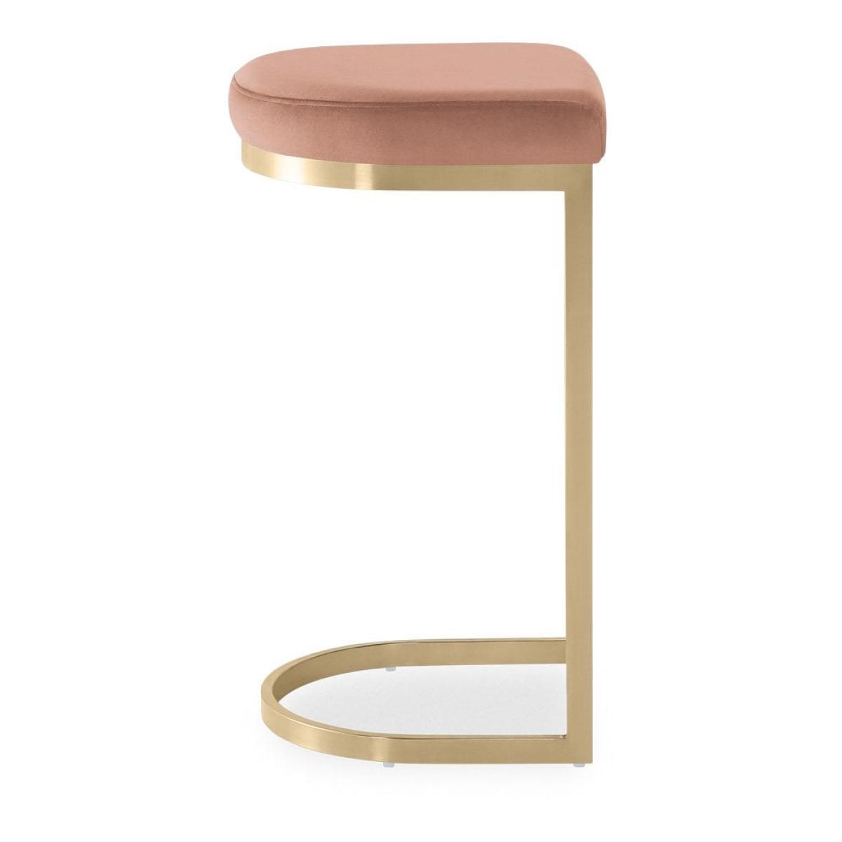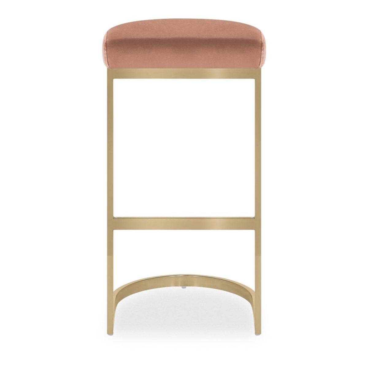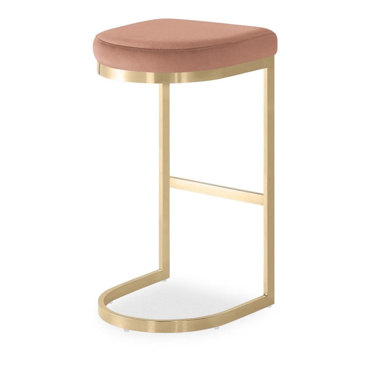 The Matteo metal bar stool in pink brings Art Deco-inspired furniture into your home. The thick brushed metal base of the stool is in a curved design with built-in footrest, perfect for perching at the breakfast island or bar. The Matteo range features a comfortable padded seat, along with our premium sustainable velvet upholstery, created with sustainability in mind. The result is a contemporary style that adds luxe design without compromising on comfort. For a rich depth of colour and unique softness, our velvet used in this product is not only of the highest quality but it is made from 100% recycled PET yarns so it is kinder to the environment too. View The Matteo Range