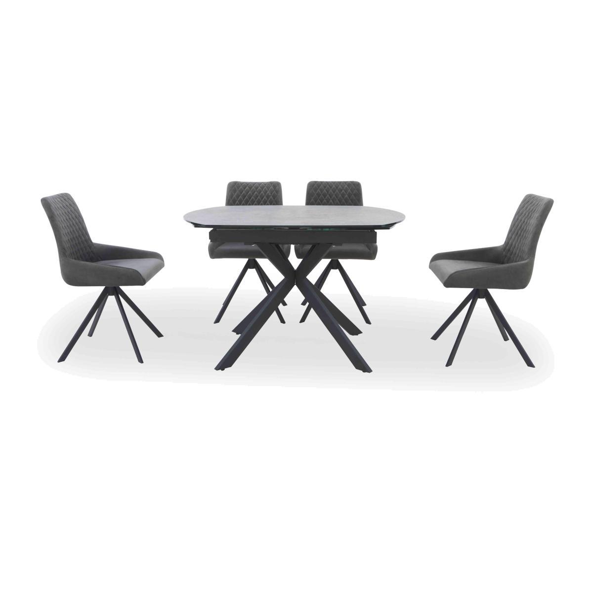 Cool industrial style is yours at a really appealing price with our extensive Matteo range of living room and dining room furniture. And with its super-durable finish, it’s every bit at home in family spaces as it is in chic urban rooms. Choose from a wide range of dining tables, occasional tables and storage pieces with striking stone-effect tops and black metal bases, or create your dream dining set by combining one of Matteo’s four dining tables and extending dining tables with your favourite style of dining chair. Too much choice? We’ve already created a selection of Matteo dining tables which we think you’ll love. Online only at Furniture Village. The table in this modern industrial dining set has a very stylish stone-effect top that swivels to extend and seat eight. We’ve paired it with a set of four dining chairs. Why you'll love it Modern urban design at an incredible price. Dining table extends to seat 8 with a smooth swivel mechanism. The top rotates and 2 extension leaves slide into place. Stone-effect table top is striking and stylish. It’s also very hardwearing – it's heat-resistant, scratch-resistant and chip-resistant. The black metal base completes this table’s industrial-style look. Easy on the eye for entertaining, easy-clean finish for everyday dining. Dining set includes 4 dining chairs. Chairs have comfortably curved and cushioned seats. Upholstered in velvet with quilted stitching detail. An online only exclusive. This dining set is part of the Matteo range. What you need to know Chairs have metal frames and legs, and foam cushioning. The dining table seats 6 closed and extends to seat 8. Please note that the table top is not 100% heatproof. We recommend using coasters and placemats at all times. For the very best in industrial furniture, browse our extensive Matteo collection.