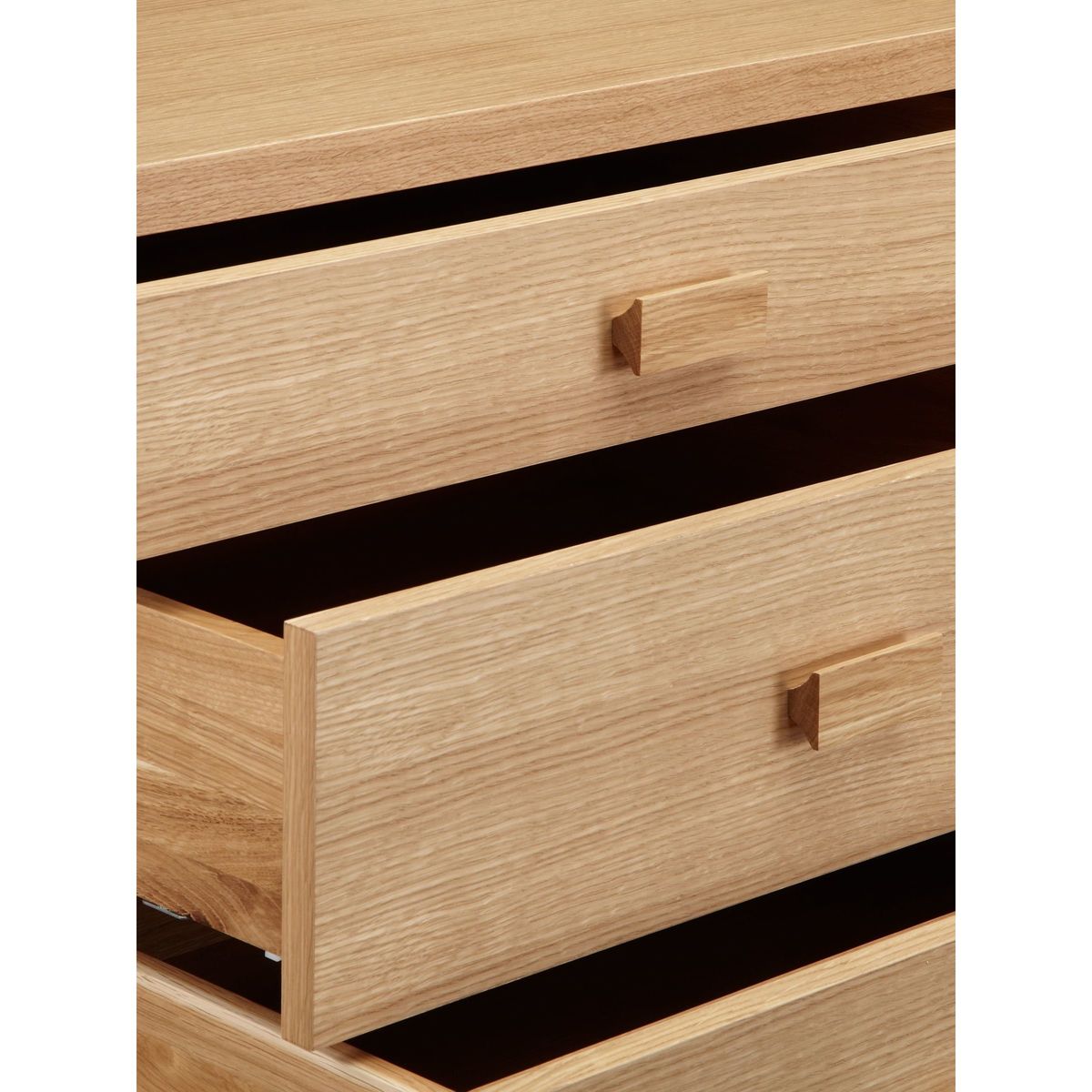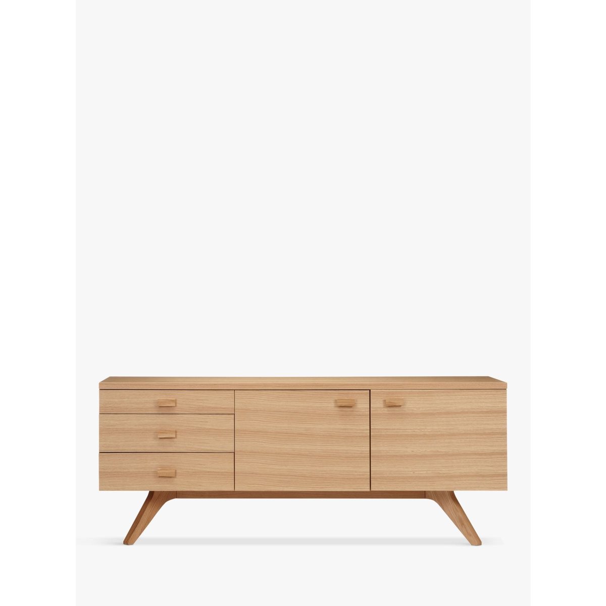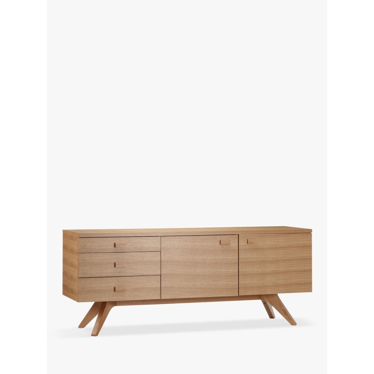Part of Design Icons The simple lines of the Cross Sideboard by Matthew Hilton are distinctively modern. The functional design is sturdy, handsome and has a solid base frame and legs, while its body is made of veneered oak. It is configured with three drawers on the left side and two doors on the right which lead to two compartments, one of which features two adjustable shelves. All the sideboard’s handles are made of rectangular solid wood. This is a relatively high sideboard that appears to almost glide on its distinctively angled legs. It is a robust piece, ideal for dining and living areas. Matthew Hilton worked as an industrial designer and model maker until 1984 when he set up his own design studio/workshop. Two years later he launched a series of shelves at the Milan Furniture Fair, and in 1991 he designed the Balzac Armchair, which was embraced as a modern classic. Since then, Hilton's work has taken on a less stylistic, more functional approach. Please note: not all our ranges are on display in our shops.