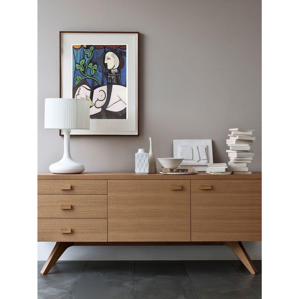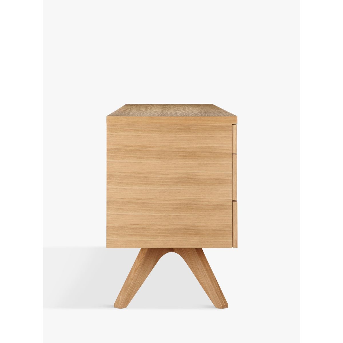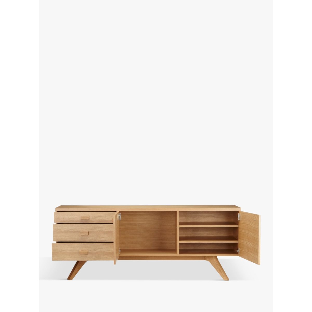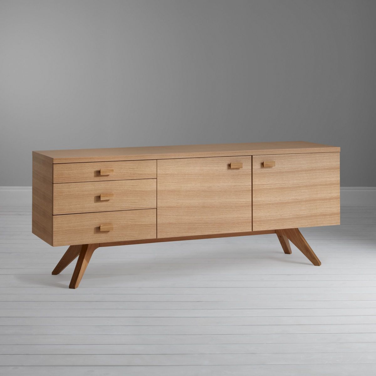 Part of Design Icons The simple lines of the Cross Sideboard by Matthew Hilton are distinctively modern. The functional design is sturdy, handsome and has a solid base frame and legs, while its body is made of veneered oak. It is configured with three drawers on the left side and two doors on the right which lead to two compartments, one of which features two adjustable shelves. All the sideboard’s handles are made of rectangular solid wood. This is a relatively high sideboard that appears to almost glide on its distinctively angled legs. It is a robust piece, ideal for dining and living areas. Matthew Hilton worked as an industrial designer and model maker until 1984 when he set up his own design studio/workshop. Two years later he launched a series of shelves at the Milan Furniture Fair, and in 1991 he designed the Balzac Armchair, which was embraced as a modern classic. Since then, Hilton's work has taken on a less stylistic, more functional approach. Please note: not all our ranges are on display in our shops.