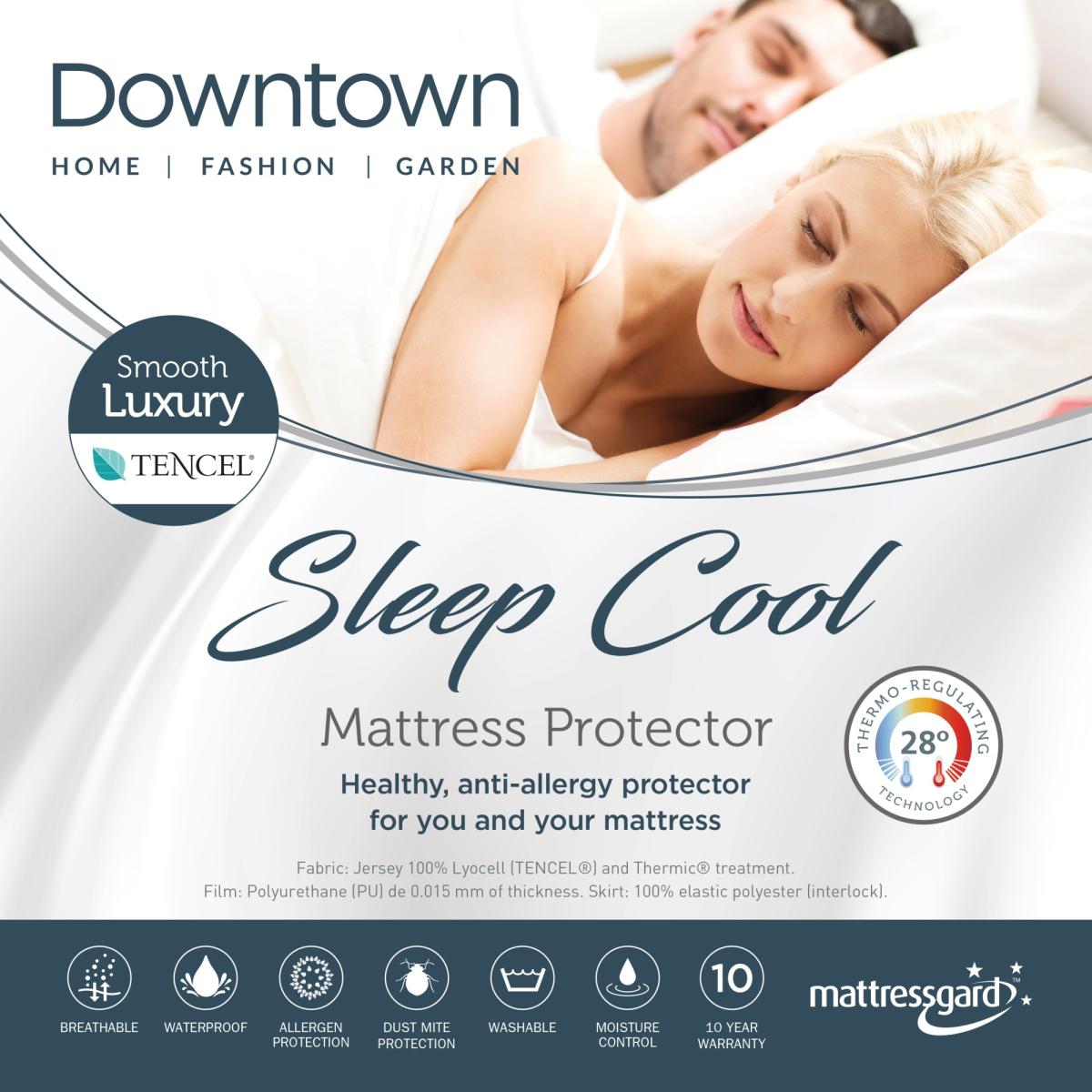 Tthe Downtown Sleep Cool Mattress Protector, an essential addition to every bed. Each protector features a cutting-edge polyurethane membrane film that provides instant waterproof protection while remaining luxuriously softno crunchy feel here. Sleep soundly knowing your mattress is fully protected. All Downtown mattress protectors come with a 10-year warranty, ensuring long-lasting performance and peace of mind. The Sleep Cool Mattress Protector takes comfort to the next level with the latest Interactive Phase Change Technology. Combined with Tencel fibers, this protector adapts to your bodys temperature, maintaining the perfect level of comfort throughout the night. *Luxury smooth Tencel fabric: Experience the softness and breathability of premium Tencel. *Temperature regulating: Advanced technology ensures an optimal sleep climate. Stay cool, comfortable, and protected with the Downtown Sleep Cool Mattress Protector. Features. *Polyurethane PU membrane film *100 jersey cotton top *100 polyester skirt *Fits mattresses up to 32 cm deep *Machine washable at 60. C *10-year warranty *Hypoallergenic *Anti-dust mite *Moisture control Dimensions. *Small Single - 75 x 200cm *Single - 90 x 190cm *EU Single - 90 x 200cm *Small Double - 120 x 190cm *EU Small Double - 120 x 200cm *Double - 135 x 190cm *EU Double - 125 x 200cm *King - 150 x 200cm *Super King - 180 x 200cm