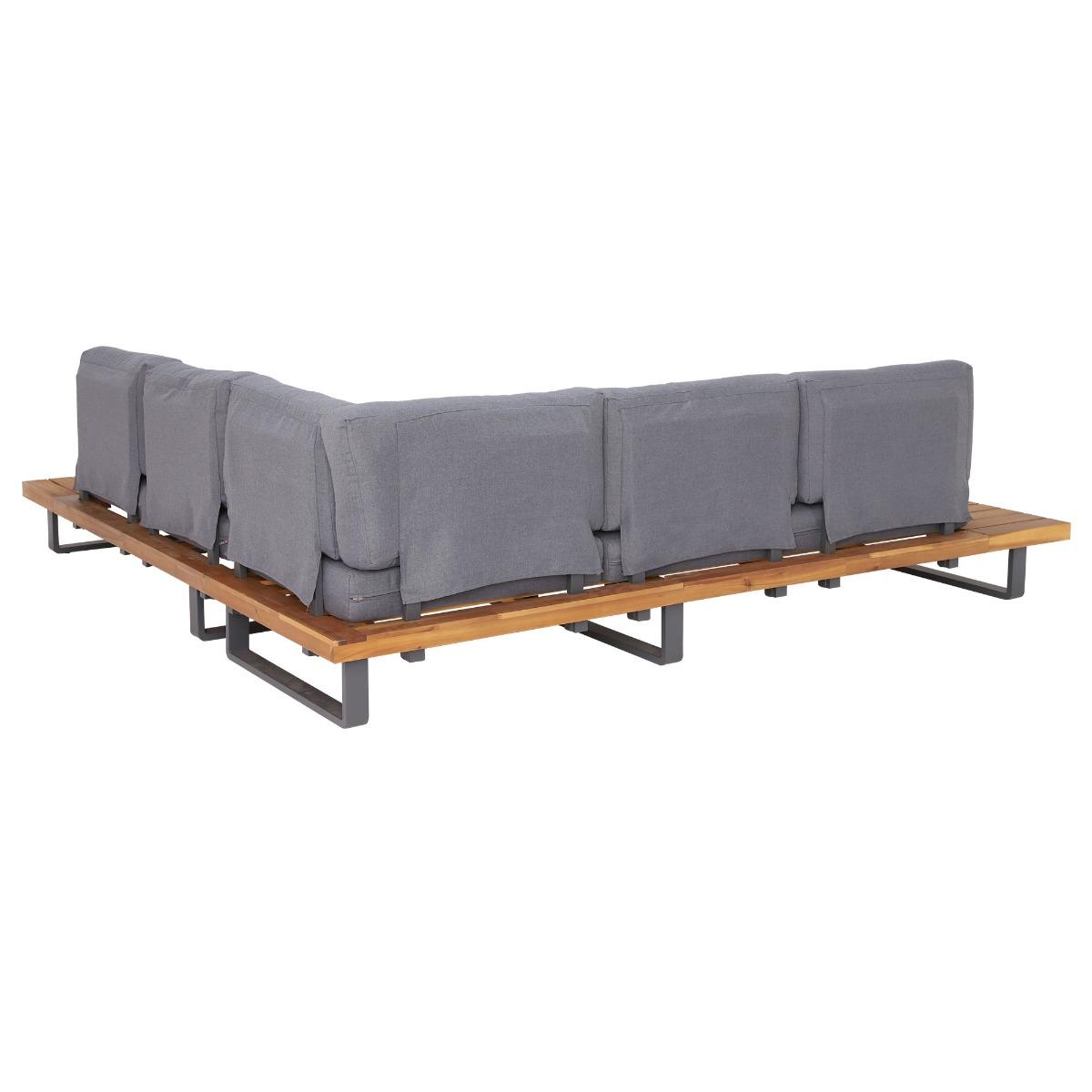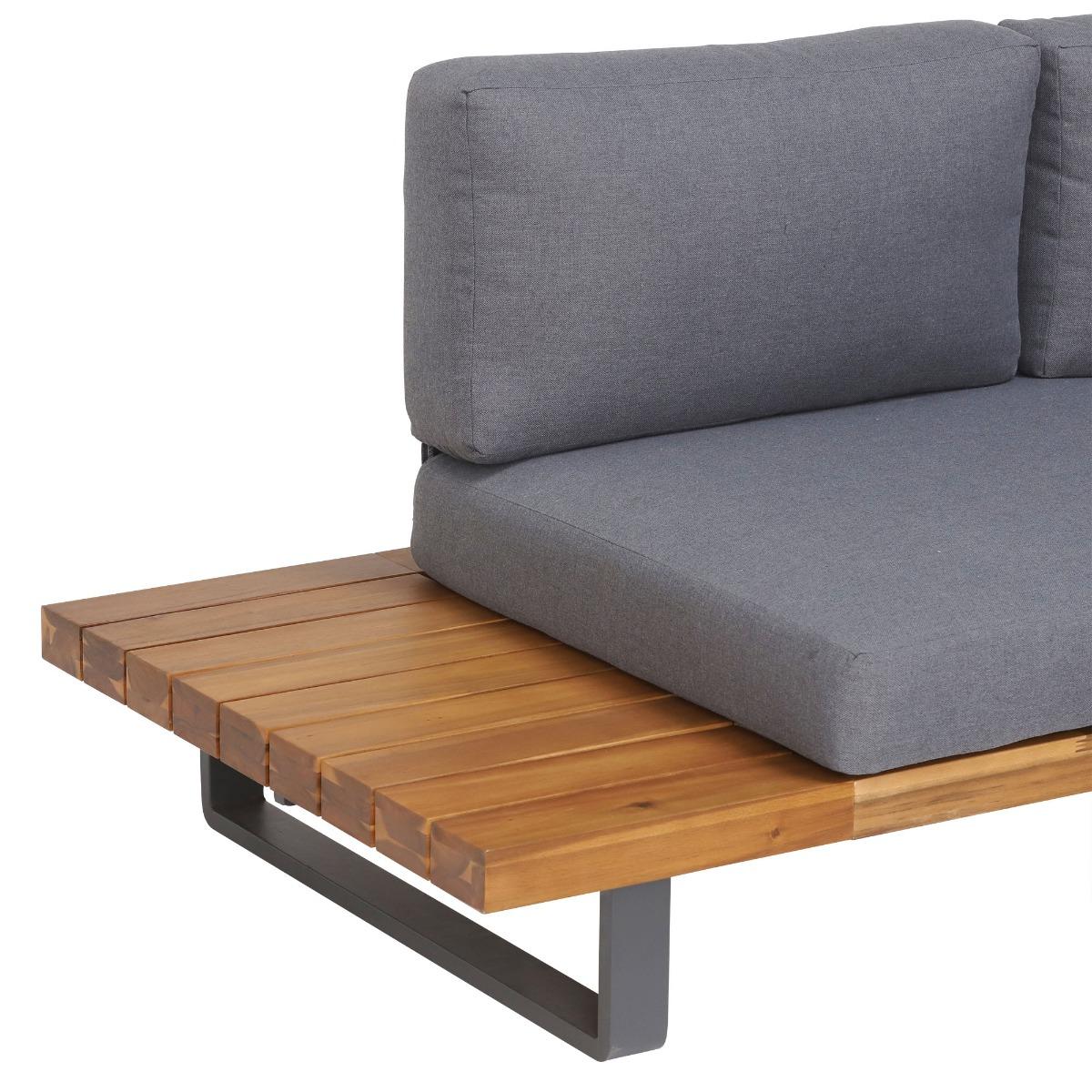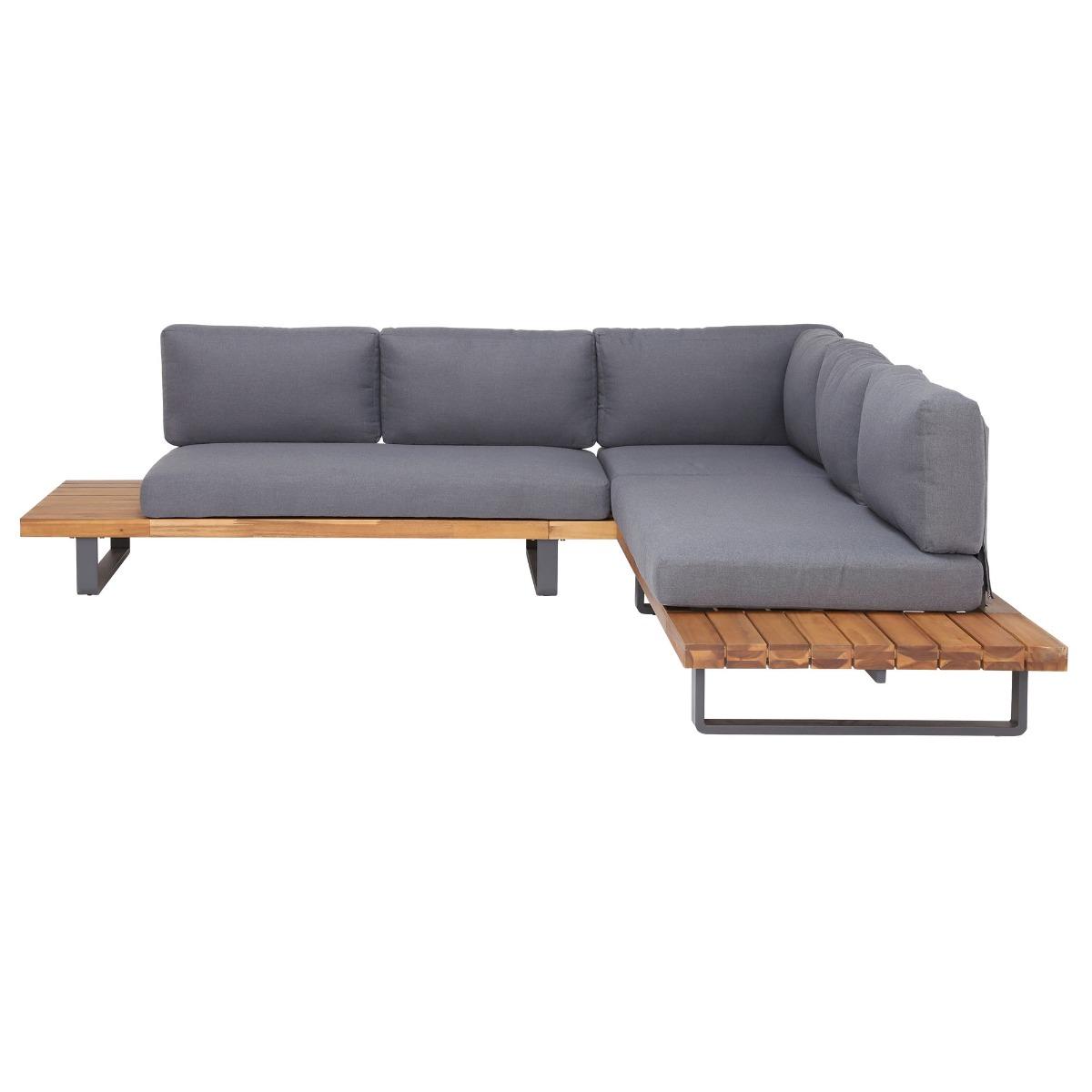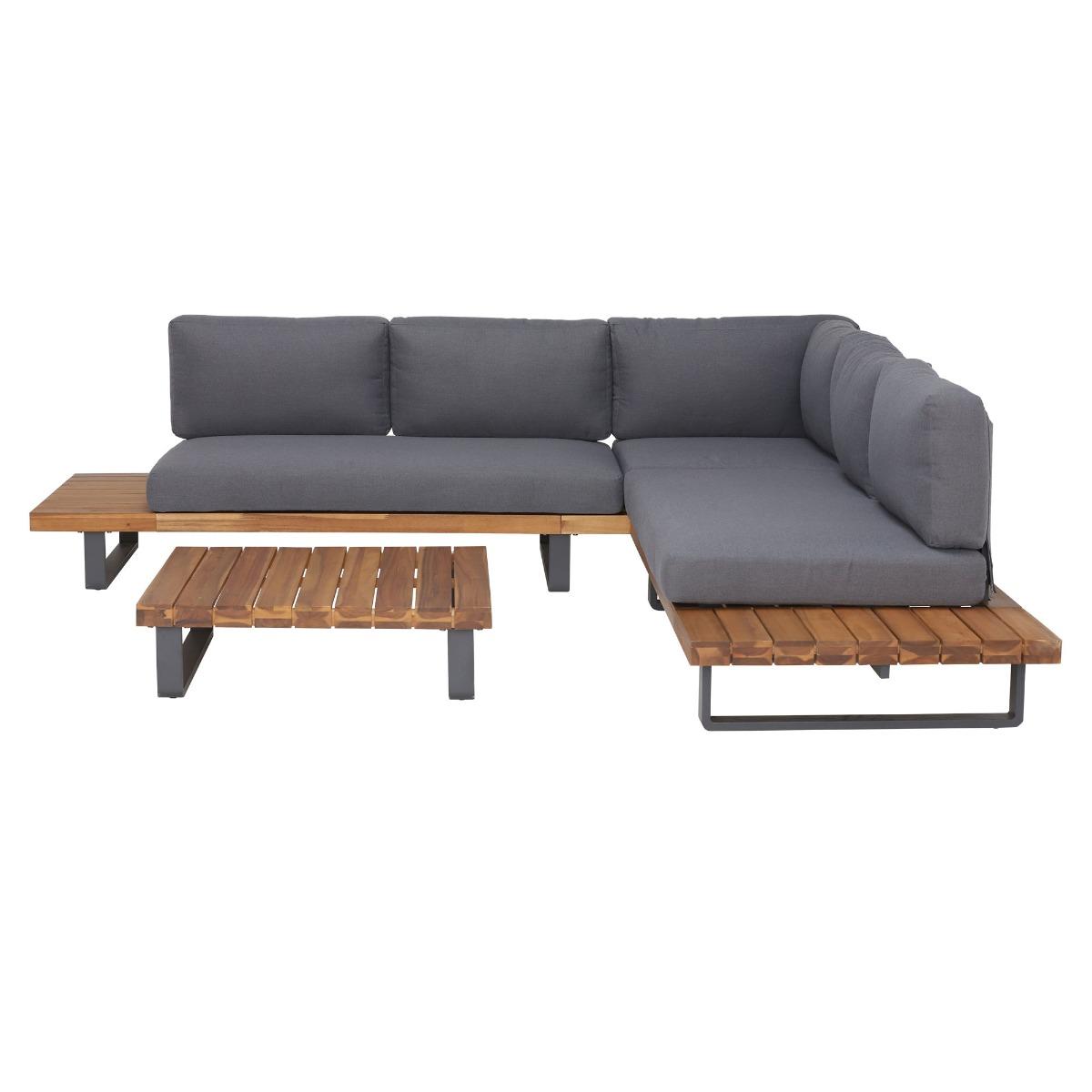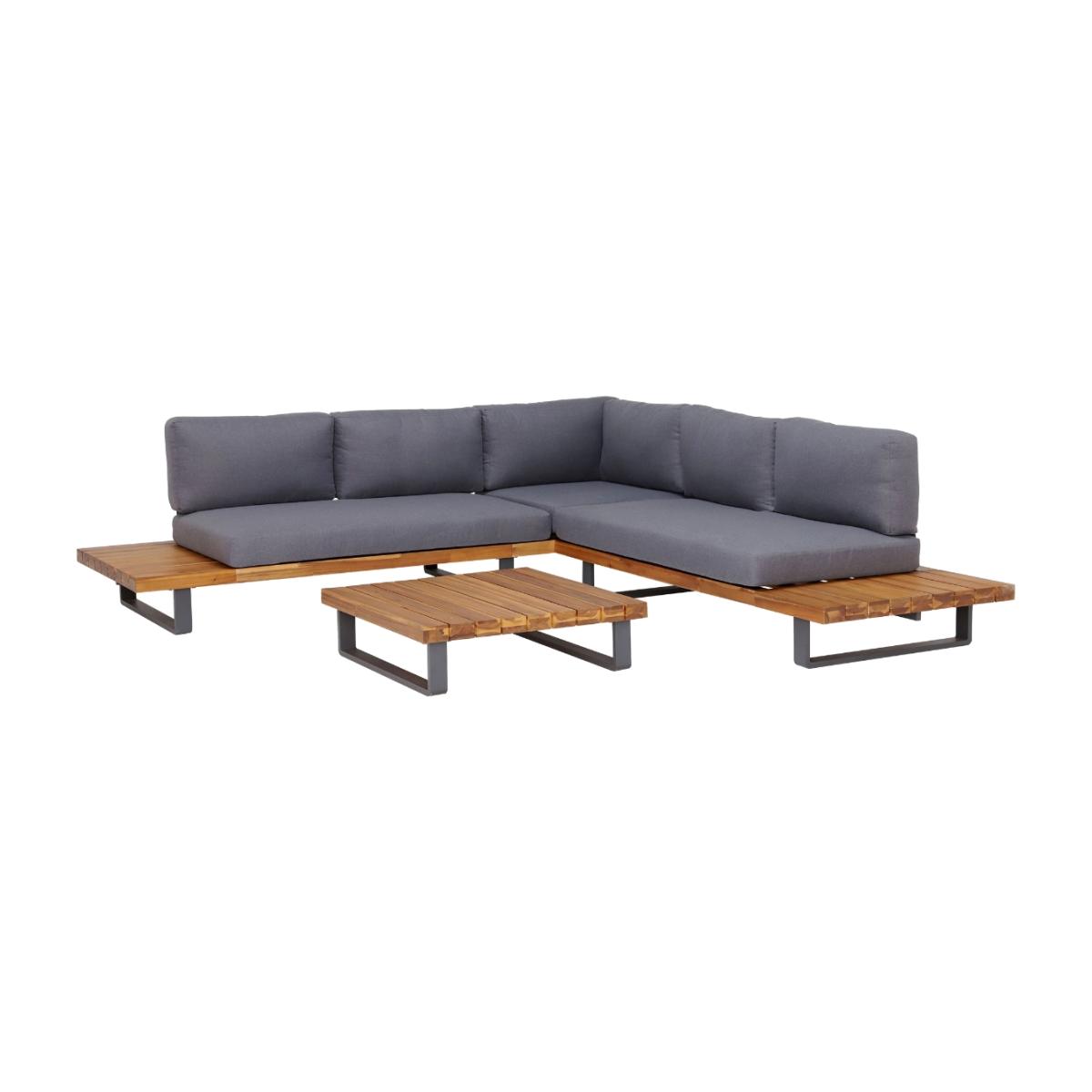 Give an exotic holiday feel to your outdoor space with the Maui garden corner sofa set. Complete with comfortable cushioning and a wooden coffee table for drinks or decorative accessories, its perfect for long days under the sun. The luxurious corner sofa features wooden end panels that offer additional surface space and unique contrast against the grey fabric. Distinctively designed, this corner garden sofa set will transport you to a faraway place.