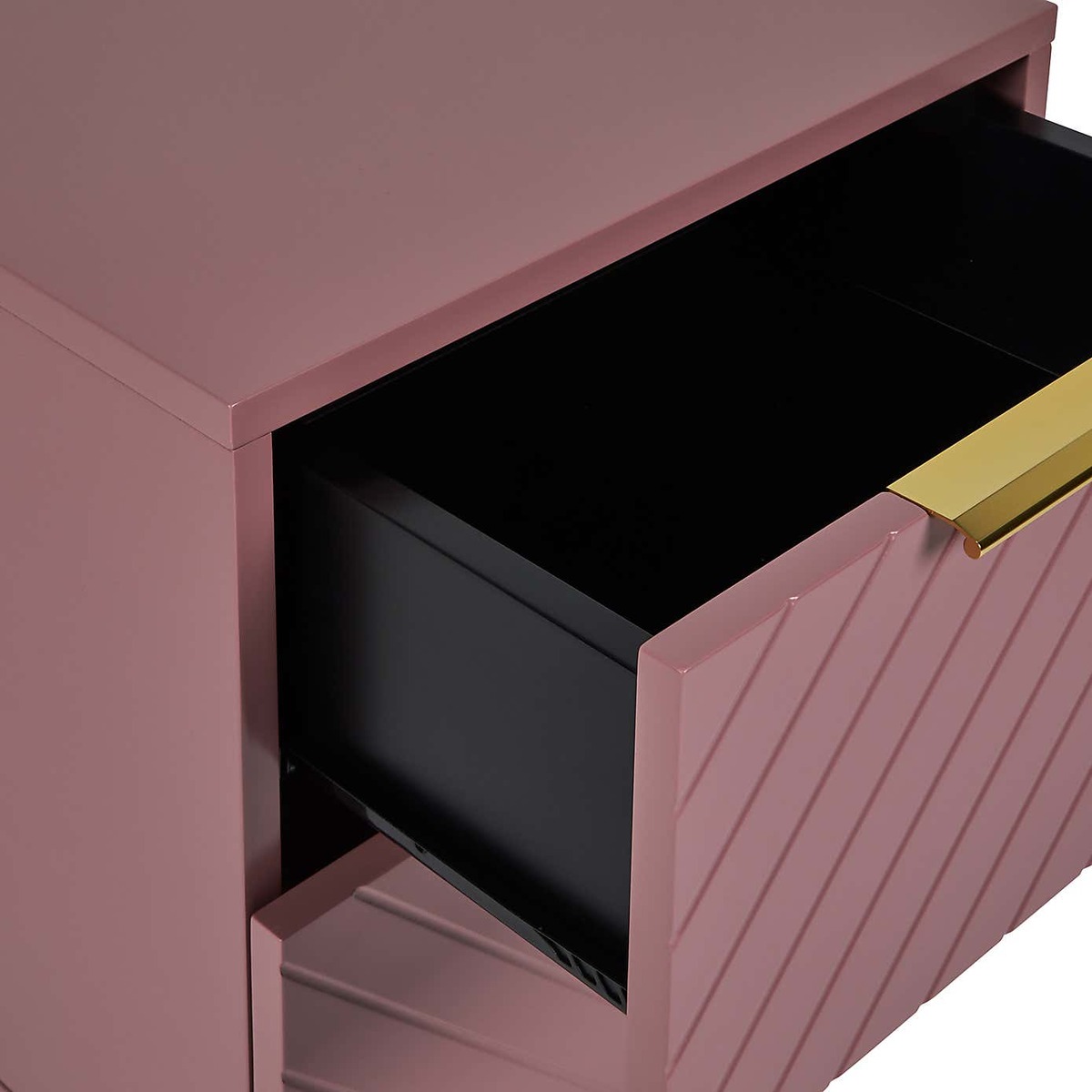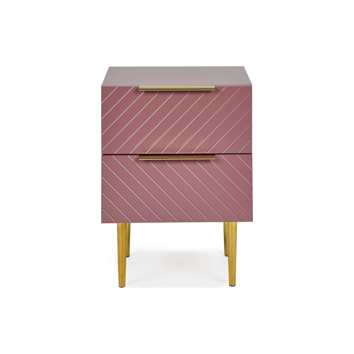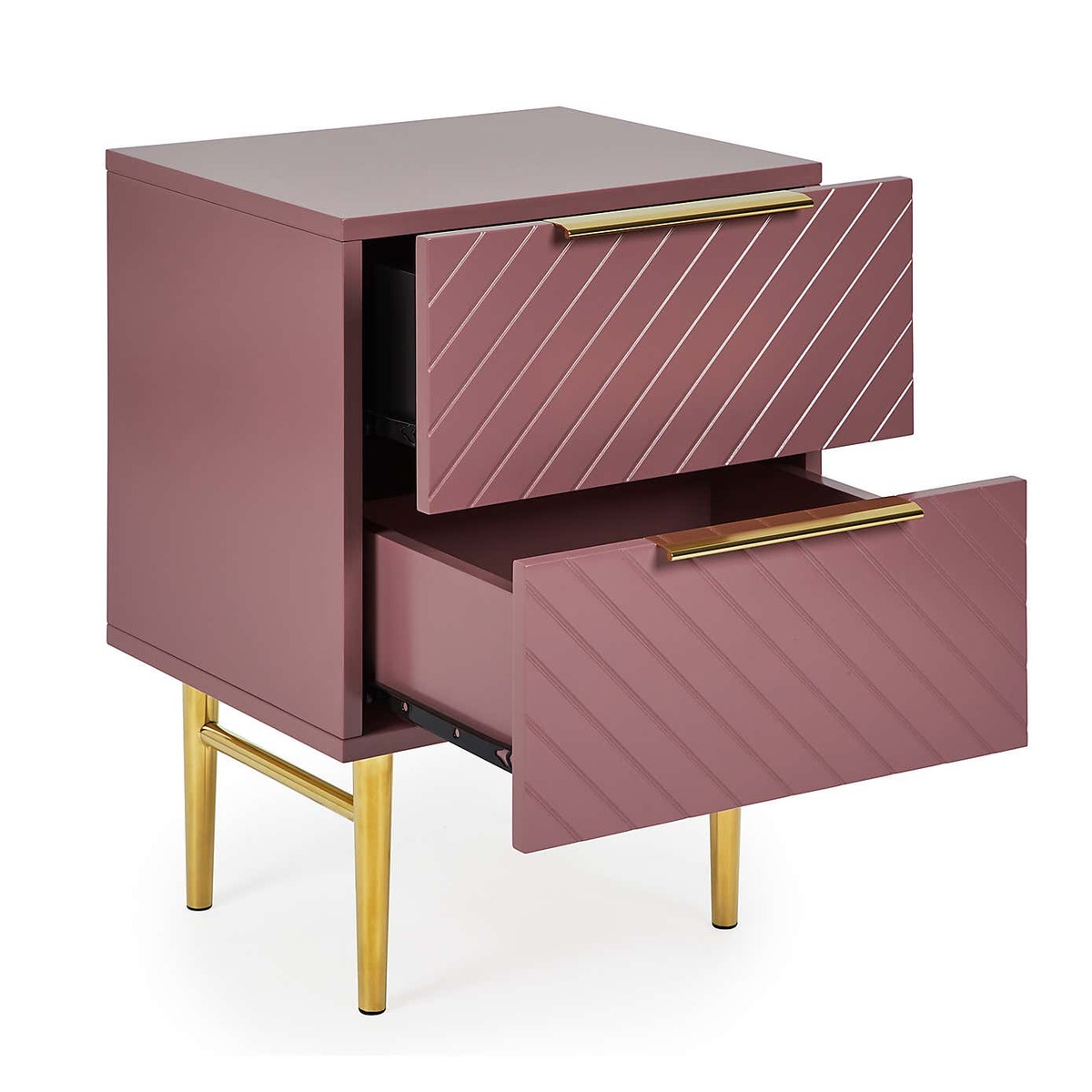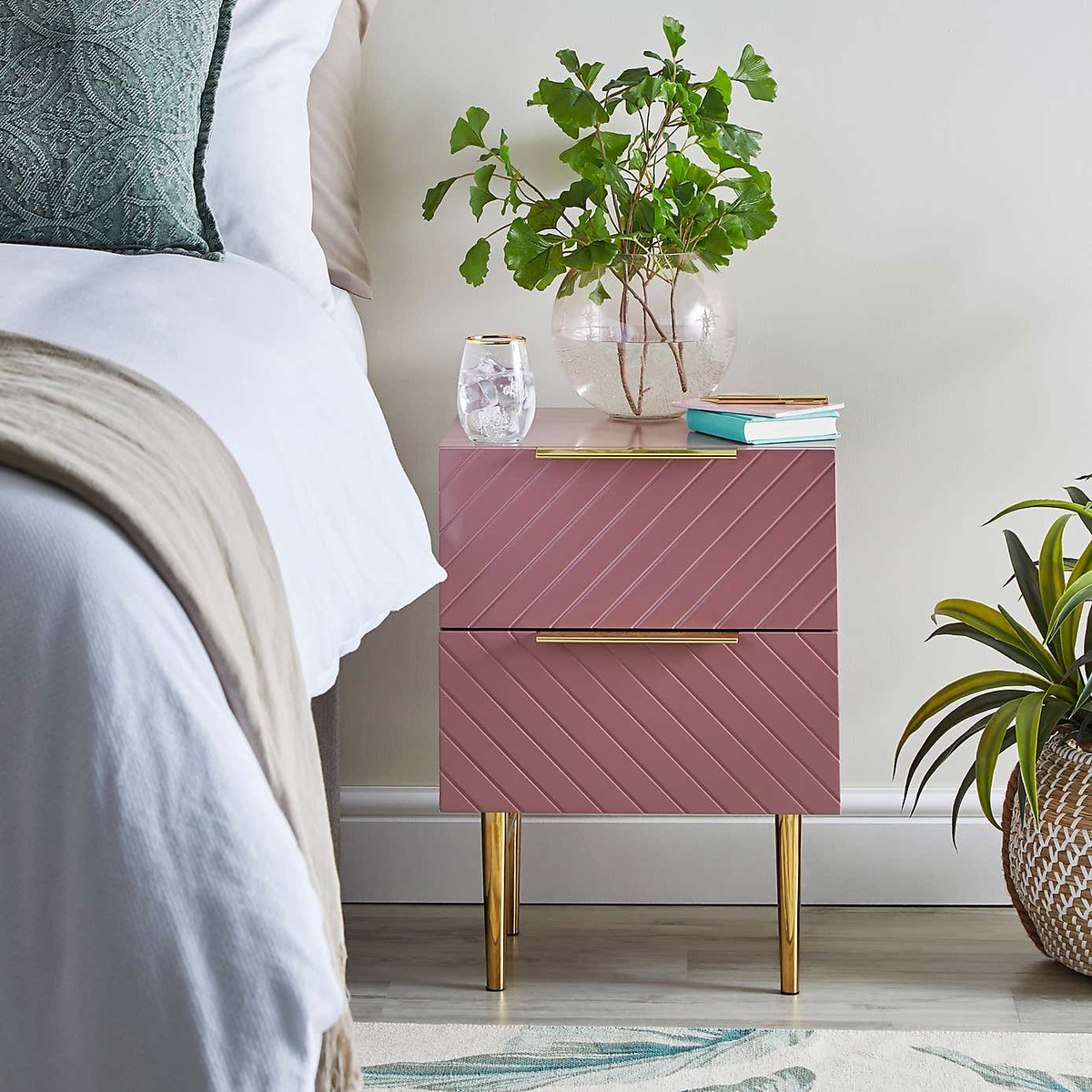 Dunelm Exclusive - Designed and Developed by Dunelm With its stunning modern design, the Maurice bedside table is perfect for adding a glamourous feel to any bedroom space. Finished in a blush colourway, this gorgeous range is characterised by the diagonal striped drawer fronts, coupled with the beautiful gold-effect metal handles and legs. Offering ample storage space, this self-assembly bedside table features two spacious drawers and would be a fabulous addition to any modern bedroom.