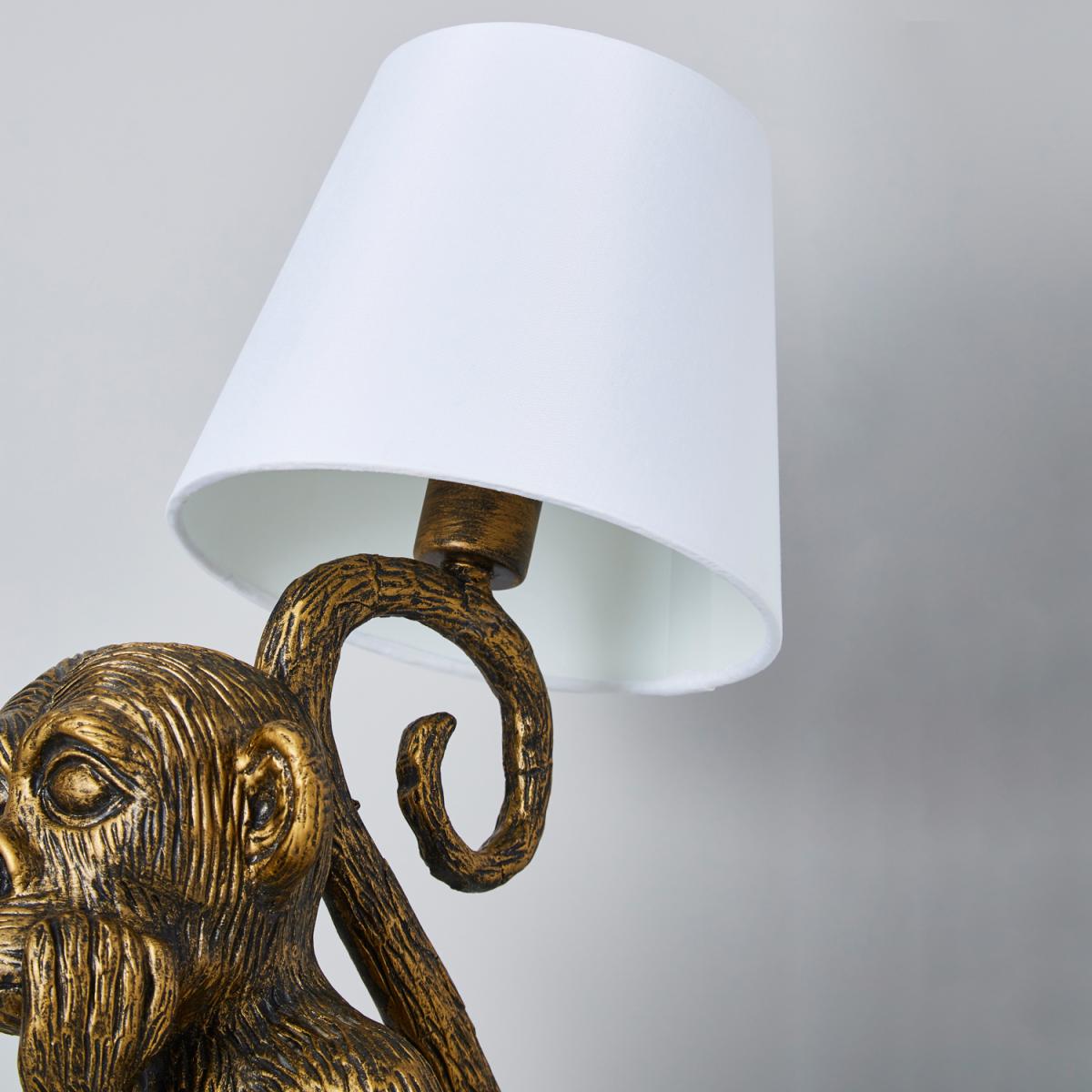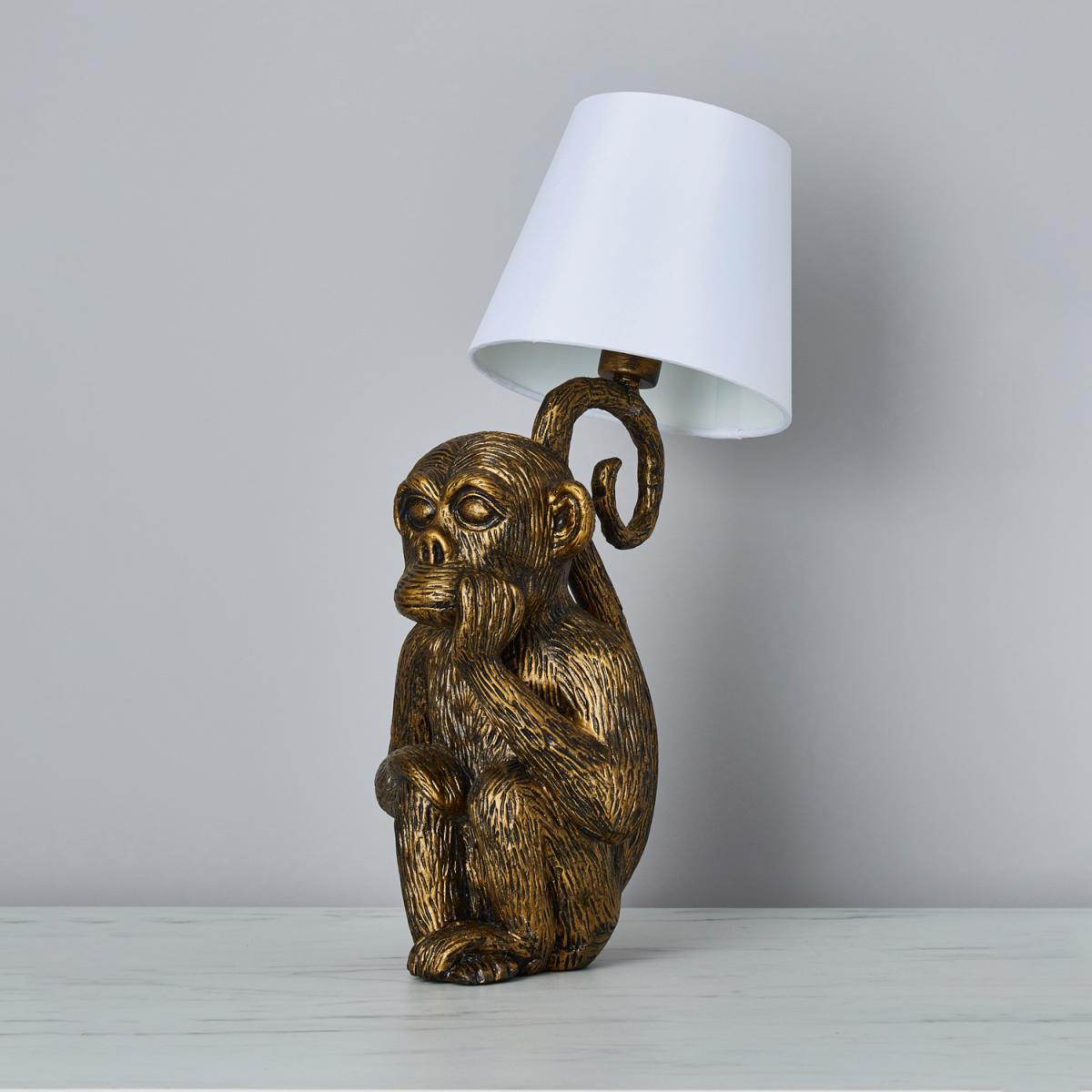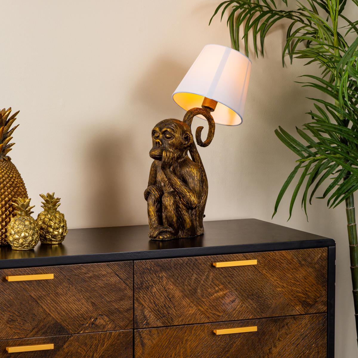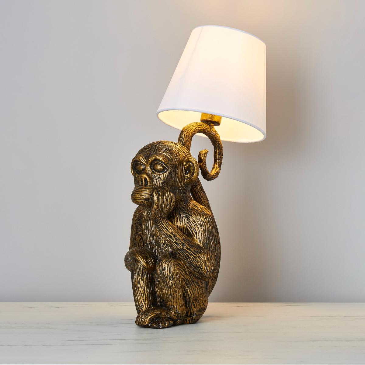 Add a quirky accent to your home with the Maurice Monkey Table Lamp in Gold. The cheeky monkey shape of this gold table lamp is perfect for those who love animals or are looking to have a safari themed room in their home. The aged finish of this accent light adds a vintage feel to your bedside table or living room side table.