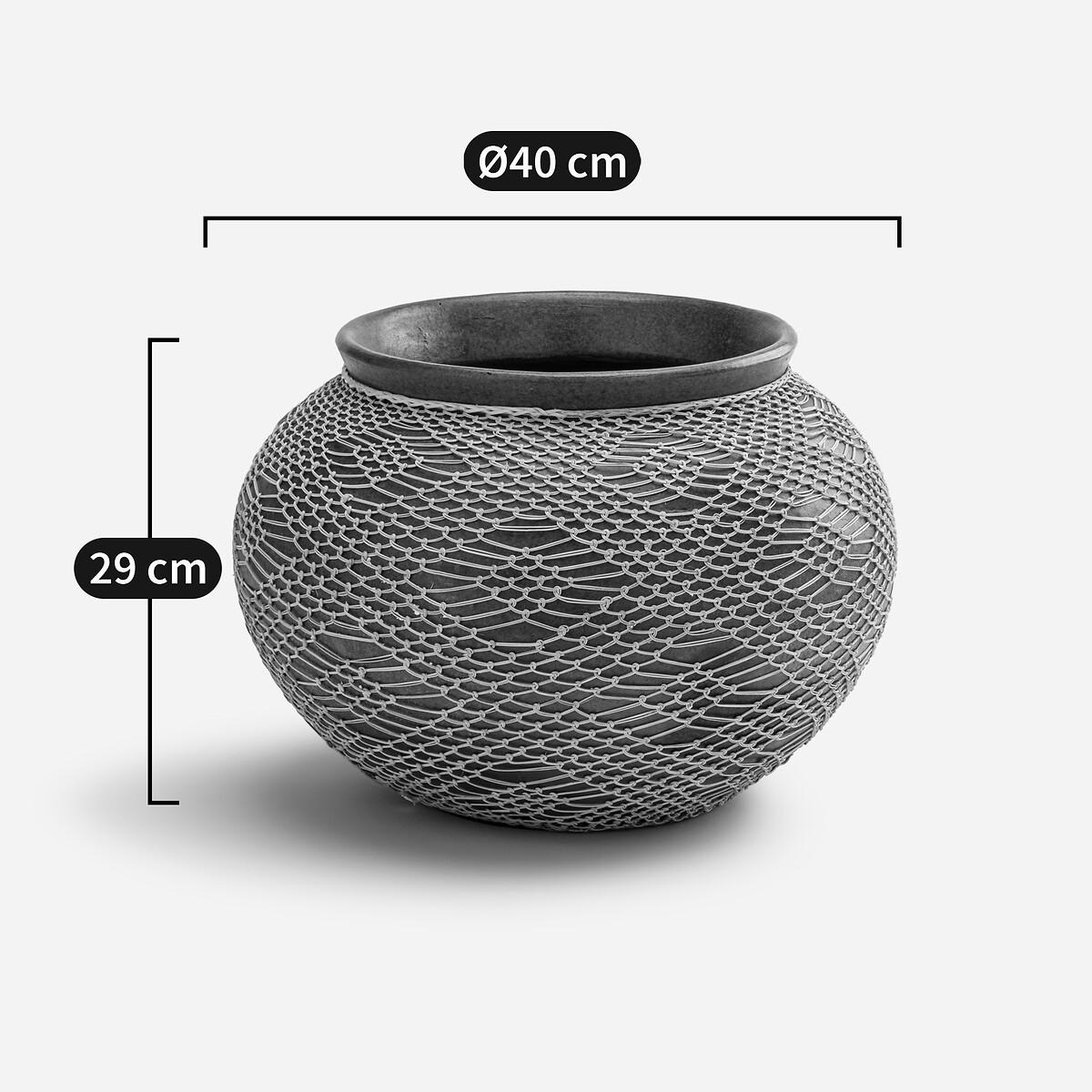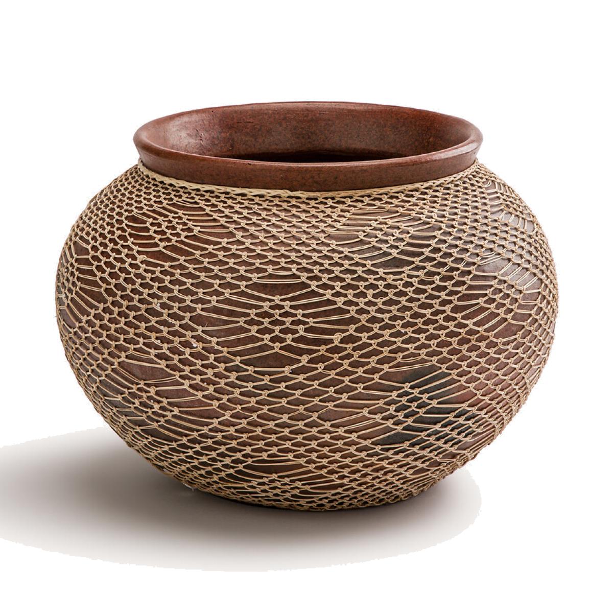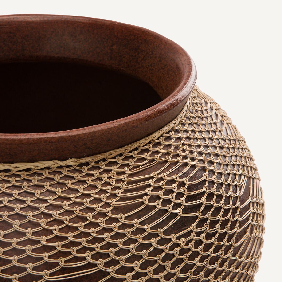 This handmade terracotta vase, with its fine rattan weave, was inspired by traditional African pottery. Its curved sides and irregular shape make Mavazi a unique decorative object. Product Details • In terracotta with satin finish • Rattan weave • Hand crafted: Each piece is unique. Dimensions • Diameter: 40cm • Height: 29cm. Dimensions and weight of parcel • 1 parcel • L62 x H50 x D62cm. 1.9kg