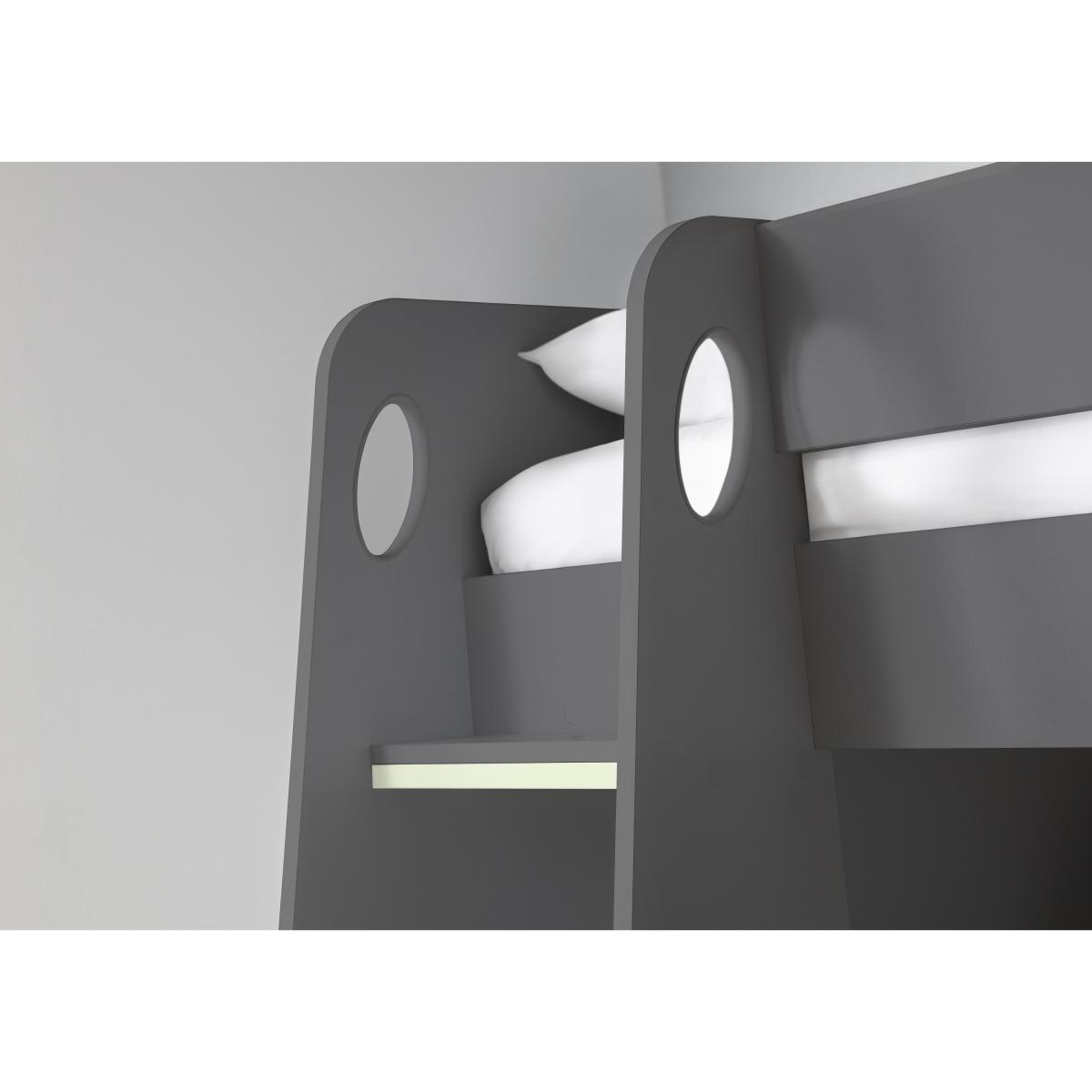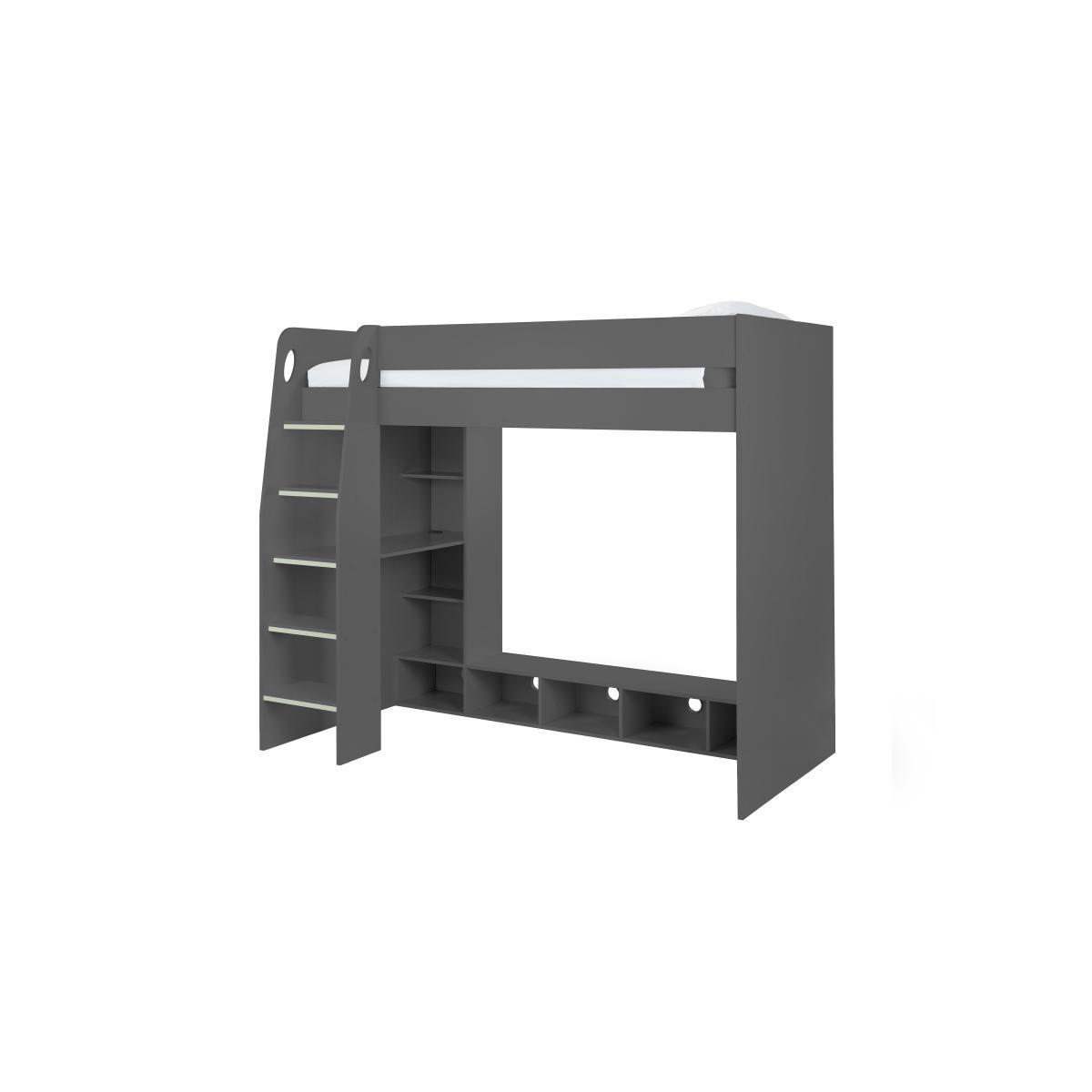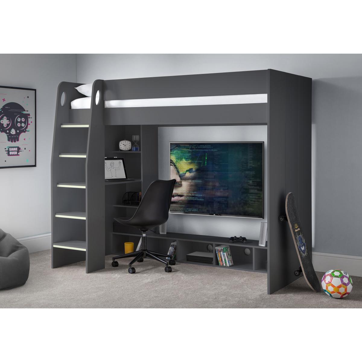 The Maverick gaming high sleeper bed is the perfect choice for gamers. Below the bed is a leisure and study space with inbuilt desk, storage and room for a large screen. This item is flat packed and will require self assembly. Mattress available separately. Why you'll love it. Sleep space, study space and leisure space in one. Ideal for teenage gamers. With an inbuilt desk and bookshelves. Hardwearing laminate finish in anthracite, white or grey oak. A large wall space for a screen or TV. And shelving for storing games, with cable management. Meets British safety standards for children’s furniture. Great value for money. What you need to know. Fits a standard UK single mattress, not included. Chipboard frame. Solid construction. Safety barrier, with a sturdy ladder. Strong wooden bed slats, the bunk can support the weight of an adult. The laminate finish is water and scratch resistant and safe for children. Foil or laminate finishes, whilst durable, are not completely resistant to water damage or scratches, so treat with care. Avoid abrasive cleaners. Refrain from using silicon based furniture polishes and dust with a lint-free cloth. Periodically check fittings have not become loose, legs must always be vertical and properly adjusted to support the mattresses.