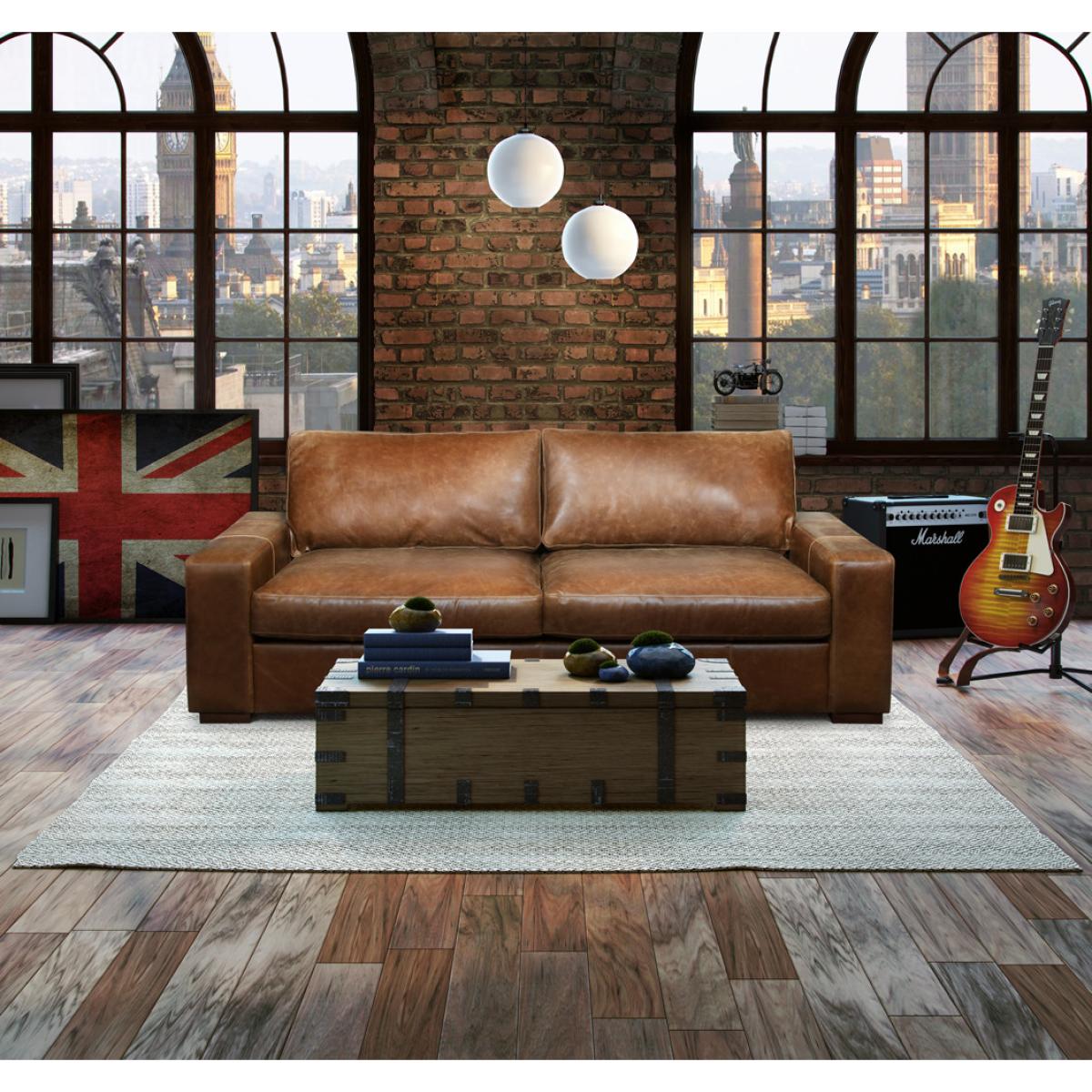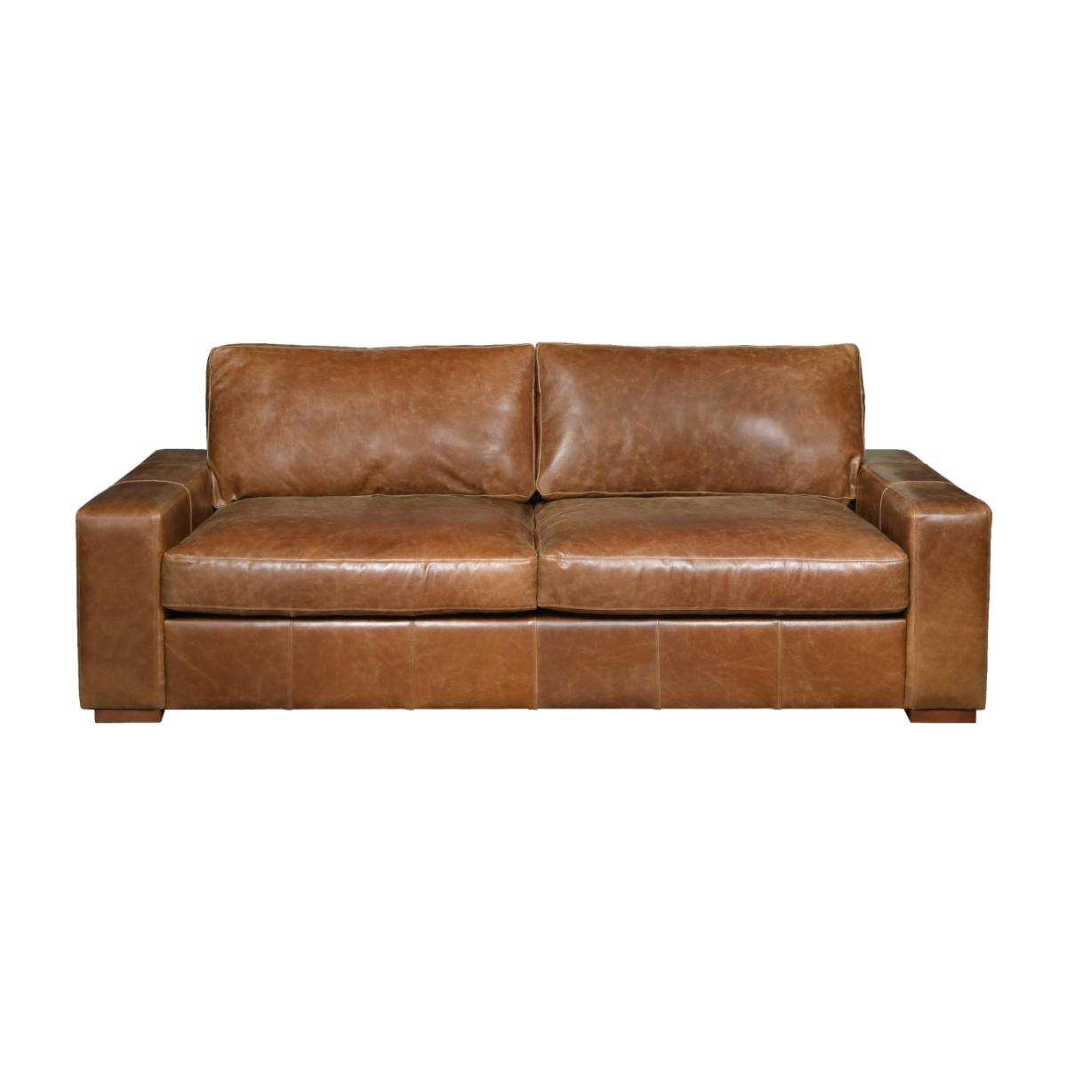 Meticulously made to the highest standard, this luxurious sofa oozes comfort. Deliciously soft leather encourages hours of leisurely lounging, watching films as a couple or relaxing solo with a drink. A clever combination of slightly distressed leather and filling gives a desirable lived-in look, helping the sofa to suit contemporary or vintage décor. Expertly upholstered in tobacco Aniline leather. Exquisite seams and piping. Traditional square arms Robust block feet. Seats three people comfortably