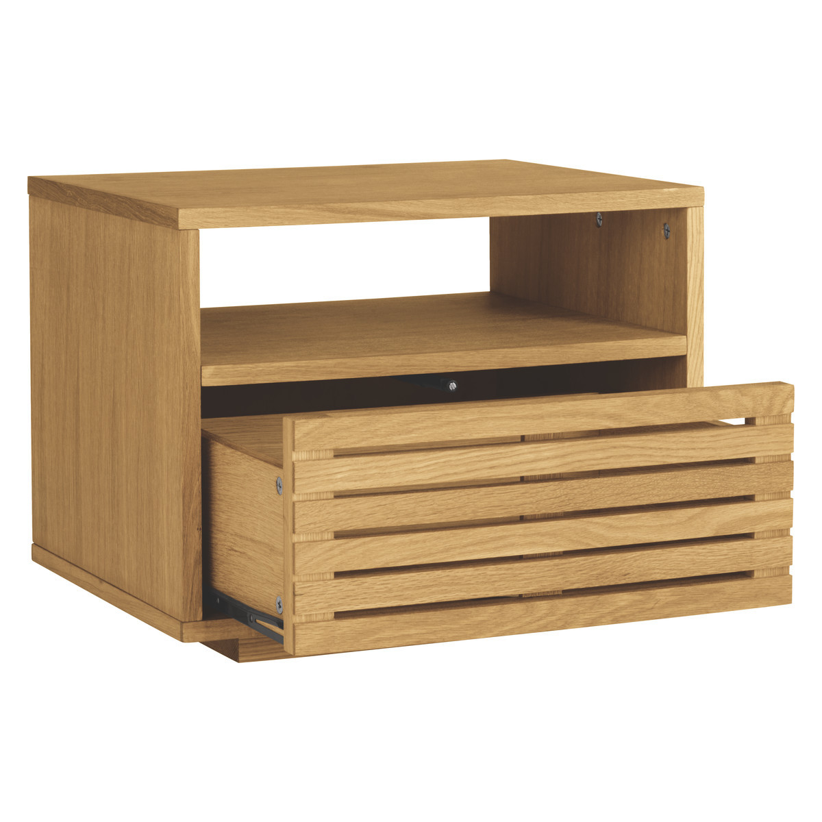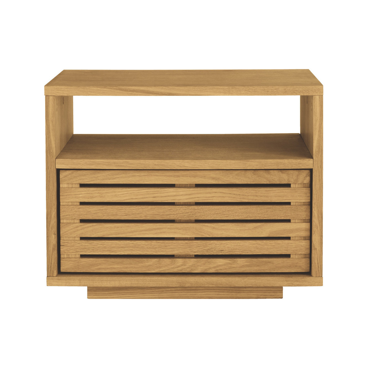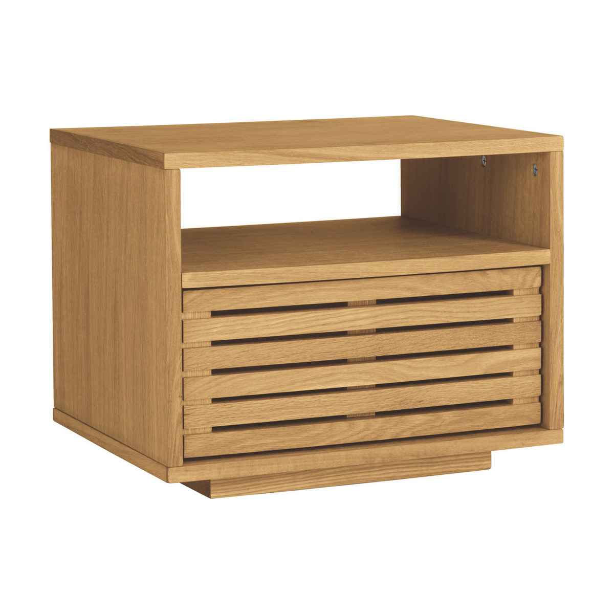 Crafted from beautiful, solid durable oak and oak veneer, this striking Max oak 1 drawer bedside unit will effortlessly add character to your rooms and sits on a hidden plinth, giving it a light appearance. With a warm, oiled finish, the deep drawer has a slatted front and features a push close mechanism for easy use;Part of the extensive Max furniture range, designed in house by Matt Long, who was inspired by traditional louvred doors.