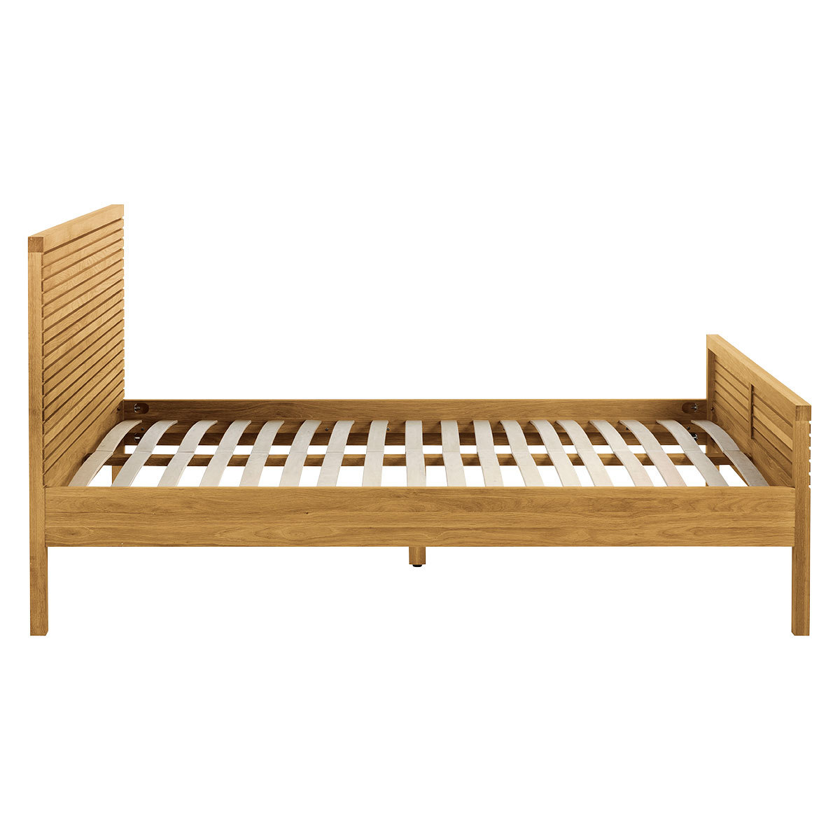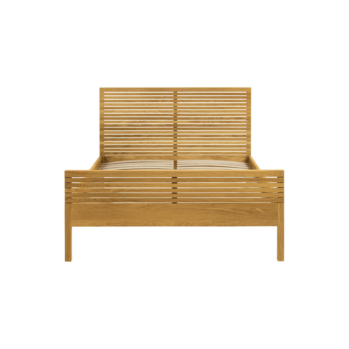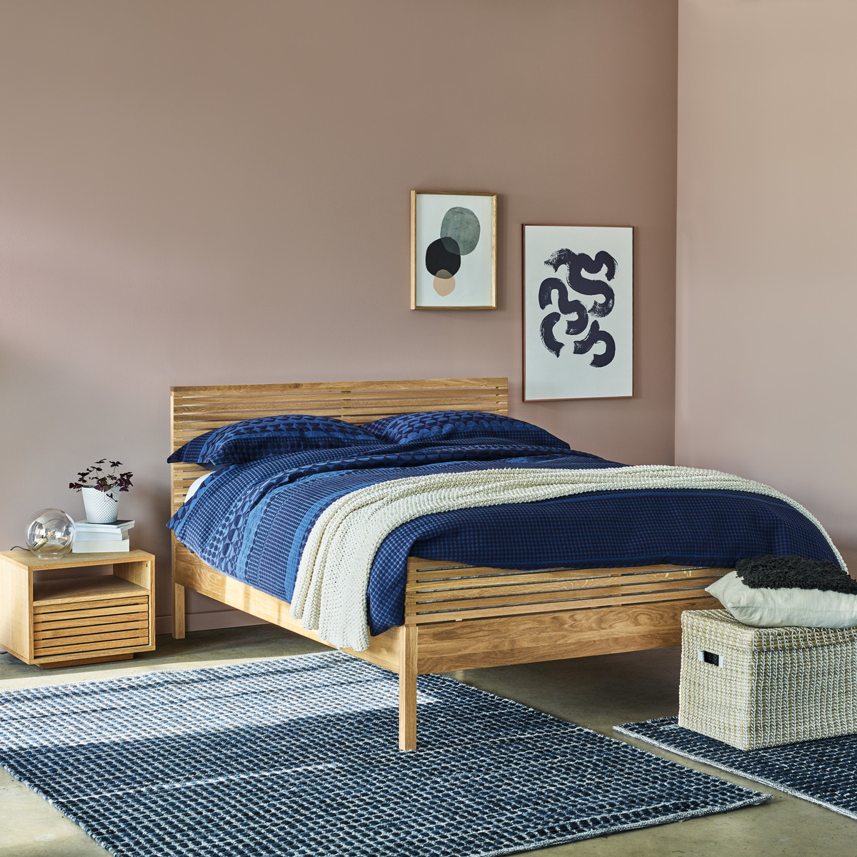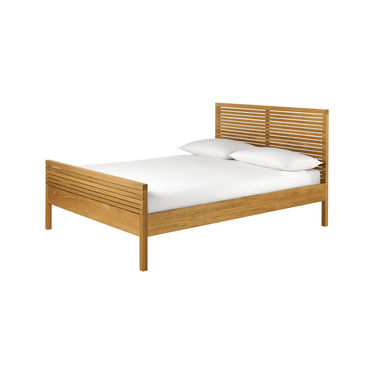 Crafted from beautiful and durable solid oak and veneer, with a distinctive slatted design, the Max oak 150cm kingsize bed adds character to a bedroom. Designed in house by Matt Long and exclusive to Habitat, the bed has an oiled finish, which gives it a warm colour. The Max bed will fit a standard UK 150cm kingsize mattress, shop our mattress collection to find a mattress that suits the way you sleep. The Max bed comes with beech sprung slats which flex with movement to support your weight and provide a more comfortable sleeping experience as well as helping to extend the life of your mattress.