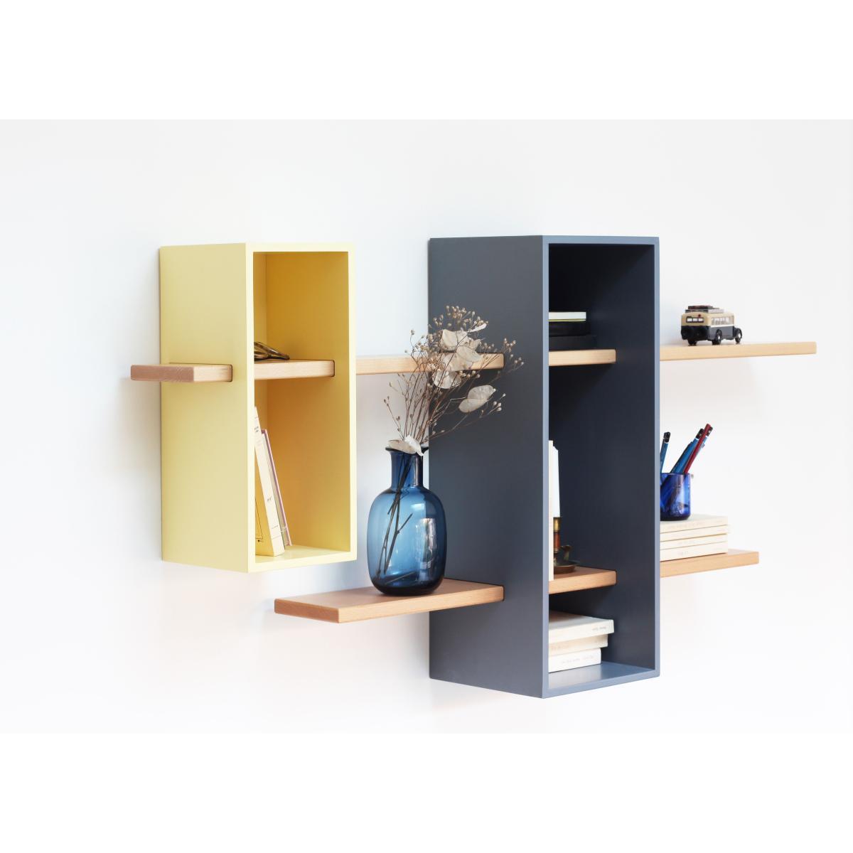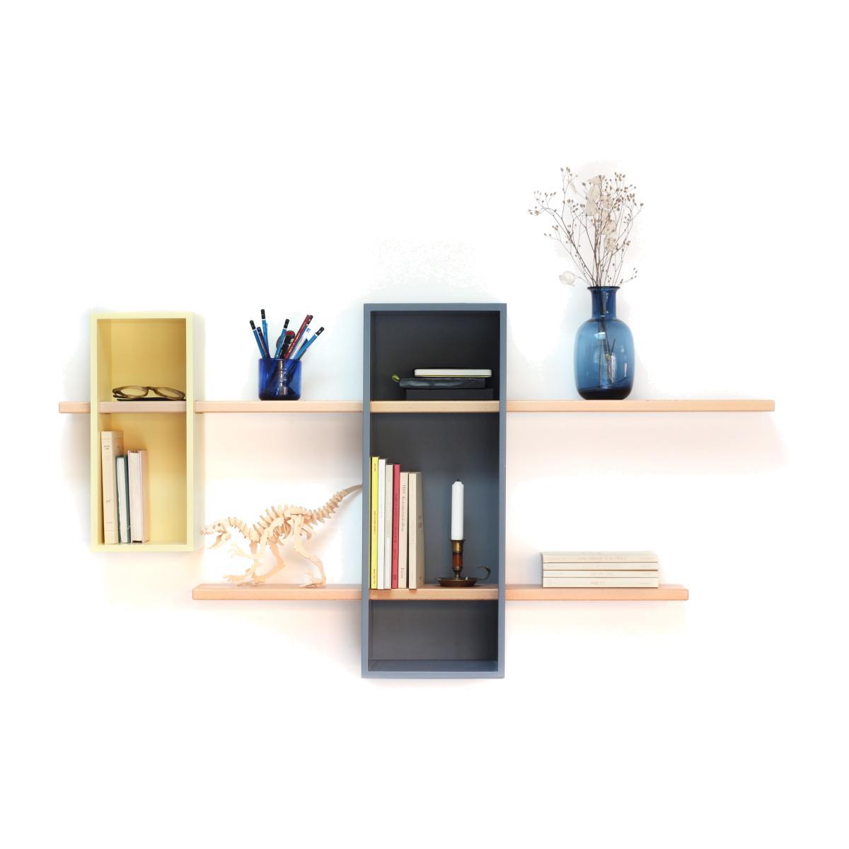 It's in the box! Lots of fun, these destructured shelves feature the interlocking of two elements: a natural solid beech board that slides into a coloured MDF compartment. Designer Olivier Chabaud saw the MAX shelves as pixels of colourful landscapes to place on a wall. The shelf is not fixed: it slides and can be pulled out from both sides of the compartment. This simple and intelligent construction lets you vary the shape of your MAX, giving it a more or less destructured shape. These shelves, based on a subtle play between fantasy and sobriety, are perfect for storing, displaying, exposing. They fit in anywhere: kitchen, bathroom, living room, bedroom or entrance. The MAX shelf is made in France, in the Jura. This set consists of two boxes (one small and one large) and two shelves (L 90 cm and L 130 cm). The large unit has two slots, which means you can slide two shelves in and create beautiful tree-like wall compositions.