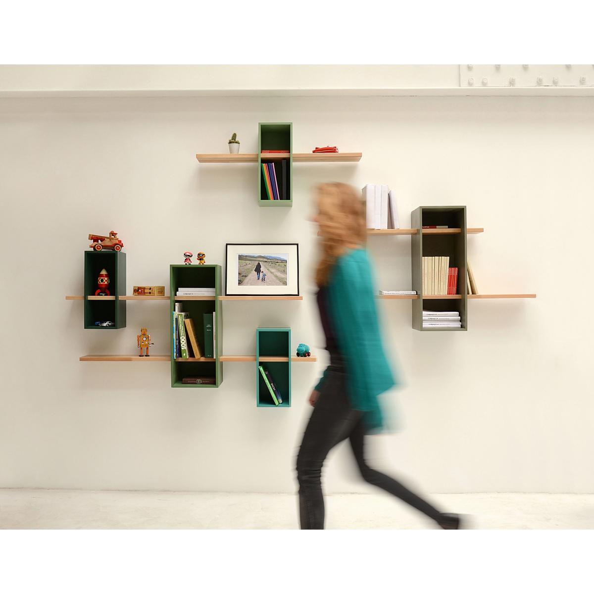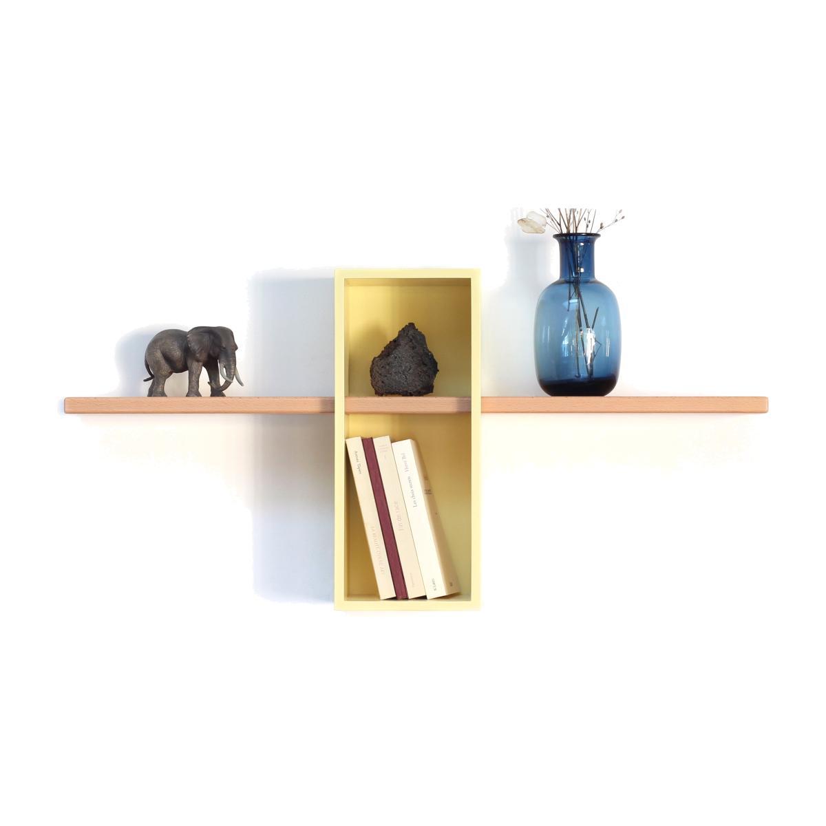 It's in the box! Lots of fun, these destructured shelves feature the interlocking of two elements: a natural solid beech board that slides into a coloured MDF compartment. Designer Olivier Chabaud saw the MAX shelves as pixels of colourful landscapes to place on a wall. The shelf is not fixed: it slides and can be pulled out from both sides of the compartment. This simple and intelligent construction lets you vary the shape of your MAX, giving it a more or less destructured shape. These shelves, based on a subtle play between fantasy and sobriety, are perfect for storing, displaying, exposing. They fit in anywhere: kitchen, bathroom, living room, bedroom or entrance. The MAX shelf is made in France, in the Jura. This set consists of a coloured compartment with a slot and a shelf made of natural beechwood (L 90 cm). MAX is also available in a double version with two compartments (one small and one large) and two shelves. The large unit has two slots, which means you can slide two shelves in and create beautiful tree-like wall compositions.