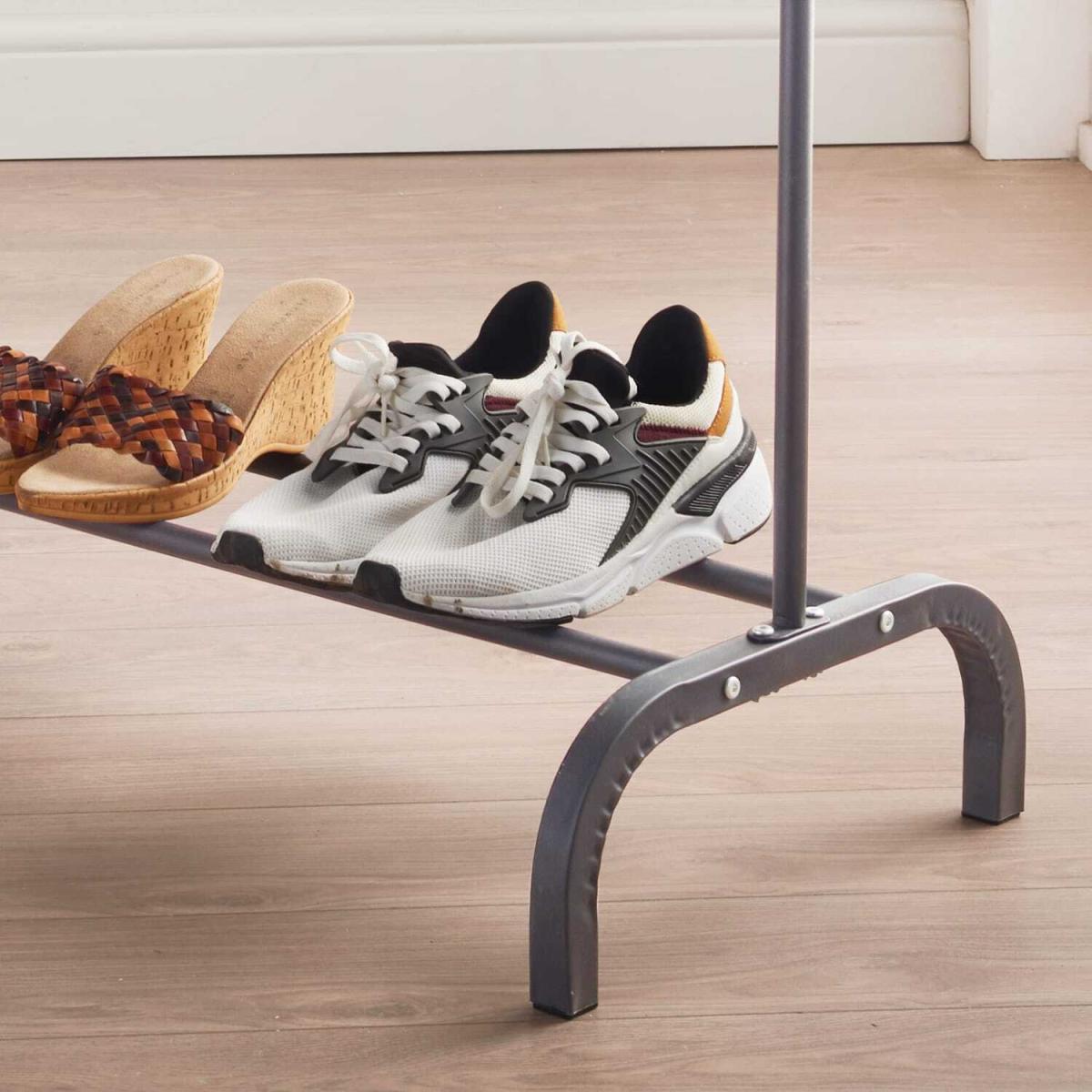 This midi clothing rail is ideal for the busy home, offering a convenient yet stylish way to store clothing. Miniature by design, heavy duty construction makes it ideal for heavy jackets and coats, with the sleek design making it perfect if you are in a rush. Just slide you garment across the rail and the built in stoppers will keep them secure while you find the perfect outfit. A built in shoe rack offers convenience, keeping your shoes off of the floor in an easy to find place, whilst offering an all round storage solution, with additional space for storage boxes. This allows you to keep your porch or hall clear of trip hazards, whilst keeping everything exactly where you need it. Handy hooks on either side complete the rail, perfect for hanging hats, scarves and bags. With everything all in one place, you are unlikely to forget anything if you are in a rush.