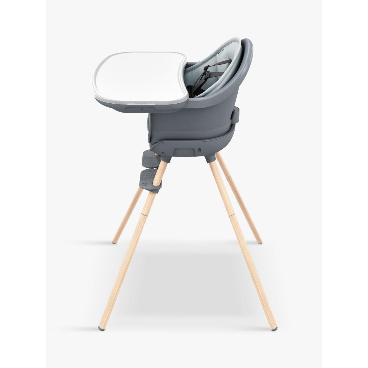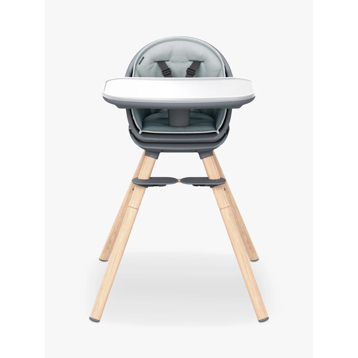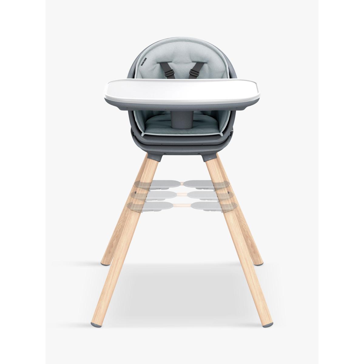 For a versatile piece that saves on space and grows with your child without having to compromise on style, choose this Moa highchair from Maxi-Cosi. A stylish 8-in-1, multi-use highchair designed for your child over their first 5 years. As they develop, MOA adapts and transforms from a highchair, to a low stool, booster seat, toddler stool, then a handy desk and seat. The perfect place for your child to eat, discover & grow. Uniquely changeable, MOA reconfigures in 8 different ways, so rather than having to buy 8 separate space-hogging products, you only need one highchair. Every Mum or Dad knows feeding time is a messy business but with its water-repellant machine-washable inlay, dishwasher-safe tray insert and washable harness, MOA is super-quick & easy to keep squeaky-clean. With its contemporary lines, minimal design and elegant colourways, MOA looks super-sleek whatever mode it's in. There are no hidden crevices for food to get stuck in and with luxurious finishes and performance fabrics, MOA is a design piece that you'll want to show off, not hideaway. You don't need any screws or a degree in engineering to reconfigure it. The MOA's modularity means it's easy to transform to suit your baby's next development stage. The easily adjustable footrest and harness ensures your baby's comfort. Constantly reinventing itself over five years, MOA grows with your child.