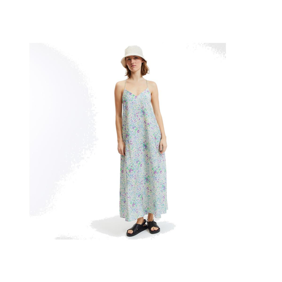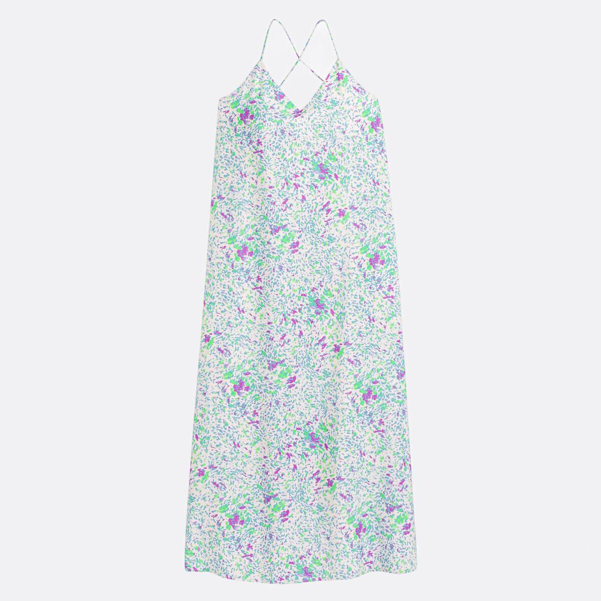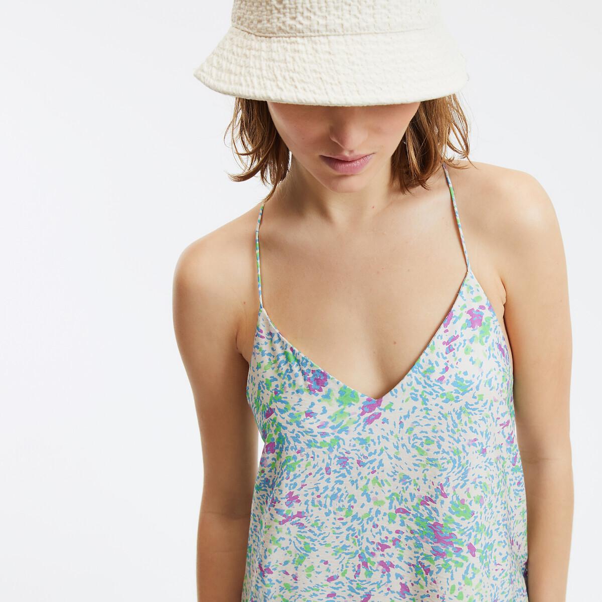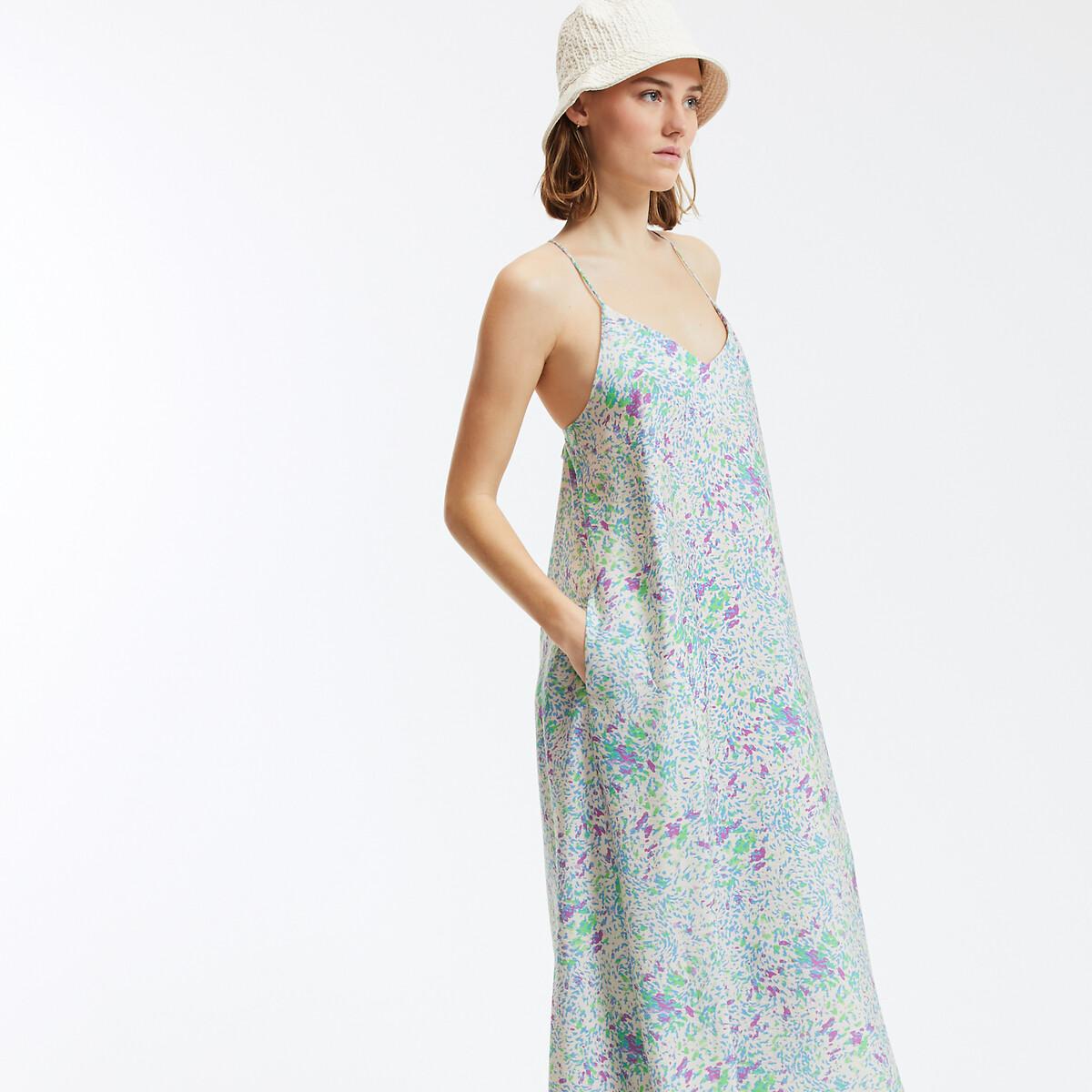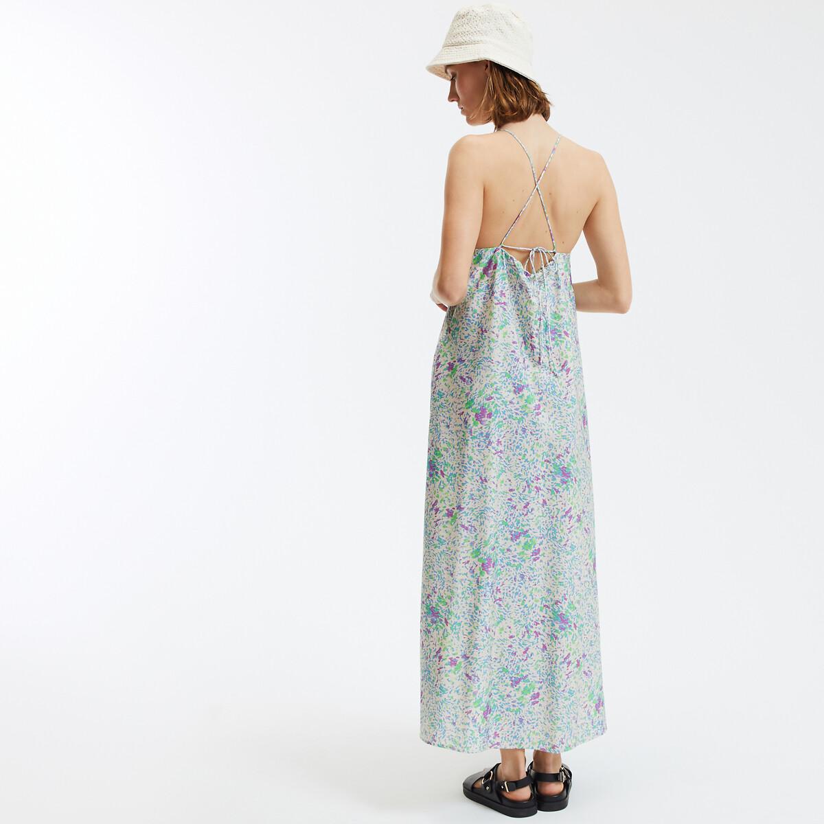 An extremely feminine flowing maxi dress with shoestring straps, a V-neck and a flared cut highlighted by a side slit. The extra detail : its unobstructed back, where the crossed and the shoestring straps are tied together. A dress in a refined print. Product details • Style: full • Maxi • Shoestring straps • V-neck • Graphic print • Side slit at the hem • Open back with crossed straps. Fabric content and care advice • 88% viscose, 12% polyamide • Machine washable at 30°C on a delicate cycle • Iron at low temperature • Do not bleach • Do not tumble dry • Do not dry clean • Textile sourced from sustainably managed forests. Lenzing™ Ecovero™ viscose fibres are textile fibres produced from FSC® or PEFC™-certified wood pulp derived from responsibly managed forests. Reforestation is achieved by replanting trees in these forests at a sustainable rate.
