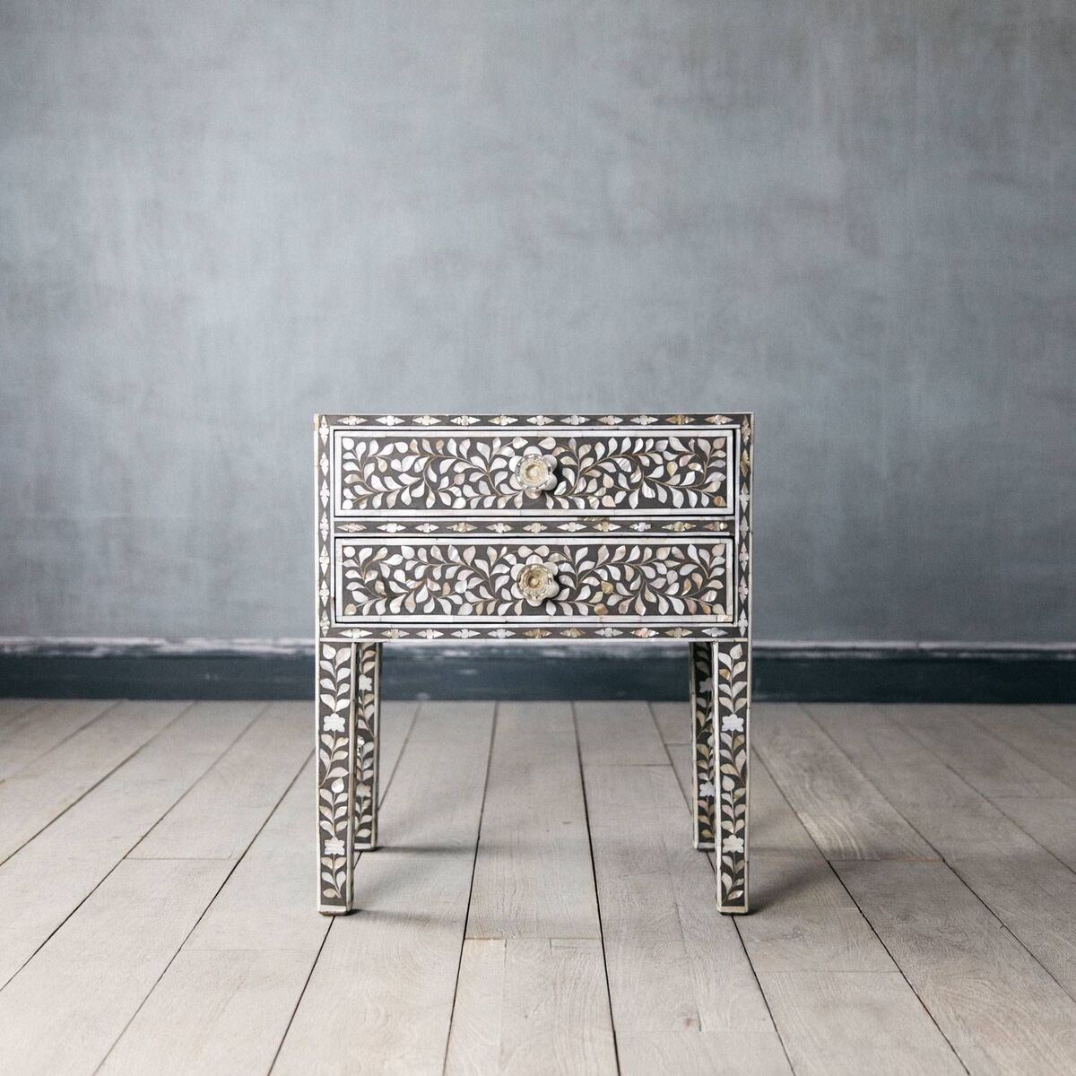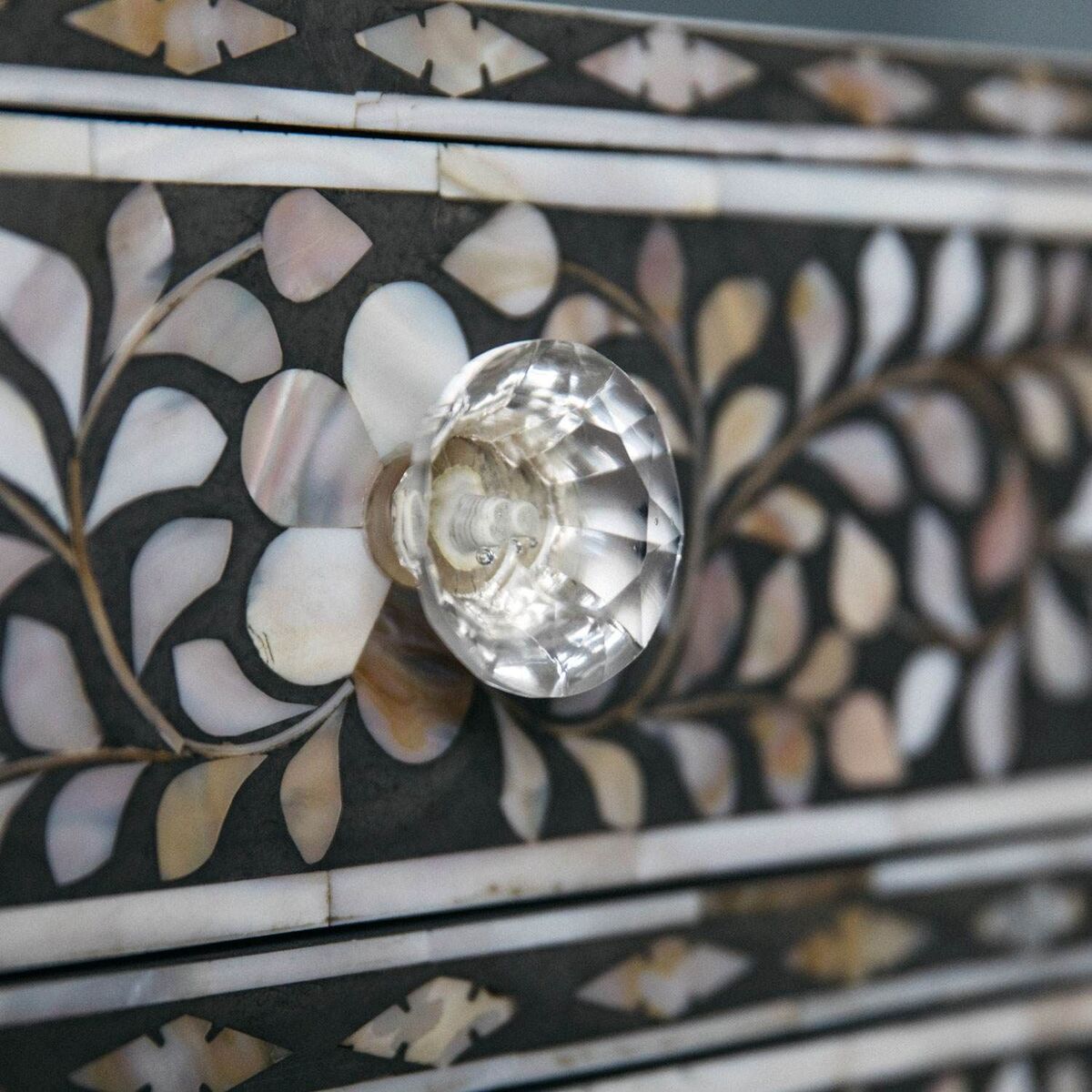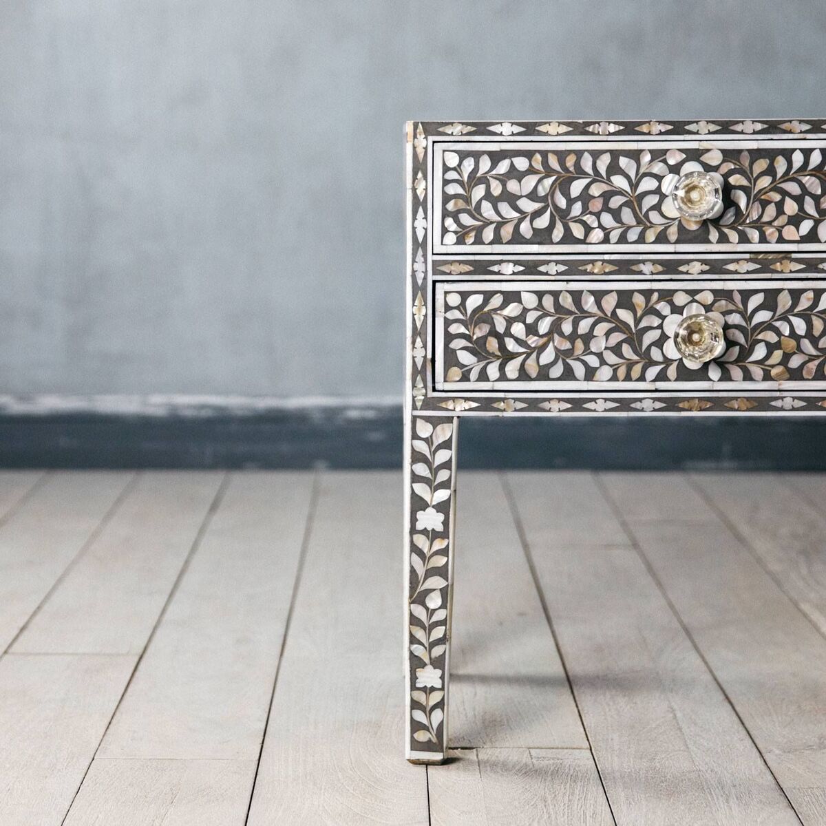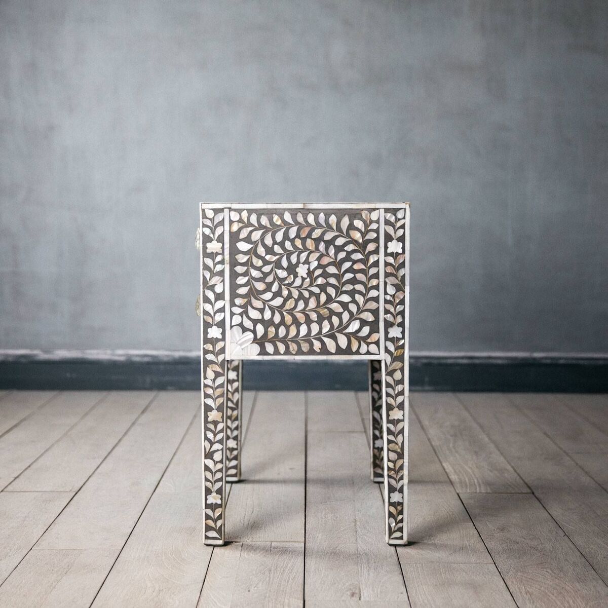 Our wonderfully whimsical Maxi Grey floral Mother of Pearl bedside table is designed exclusively by Jamie Graham and is destined for stardom. The frame is built from durable sal wood, with an MDF backing board to prevent warping.