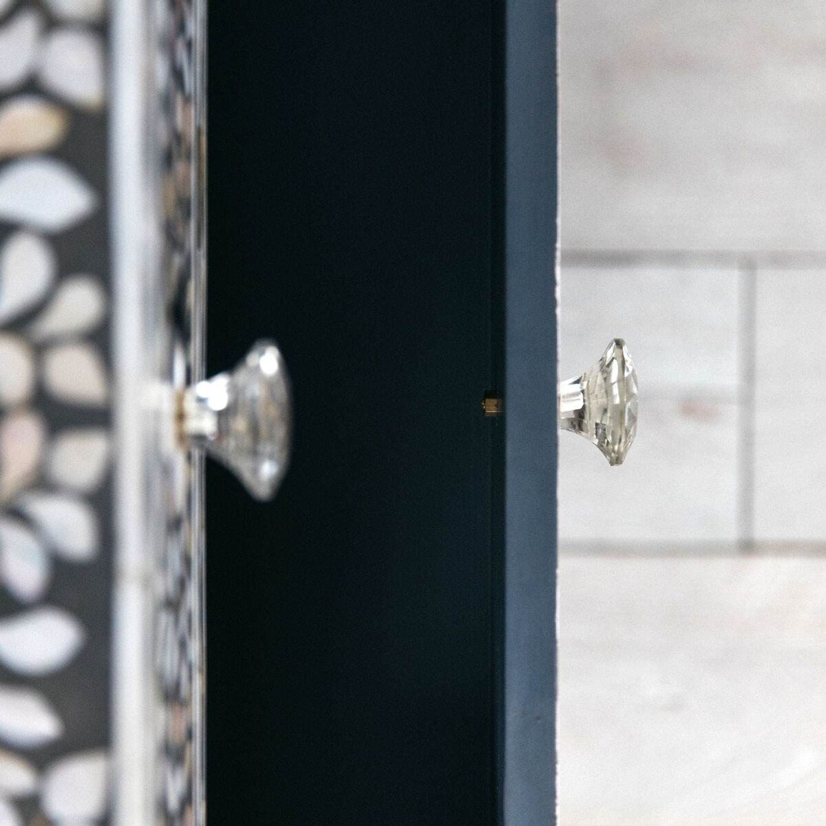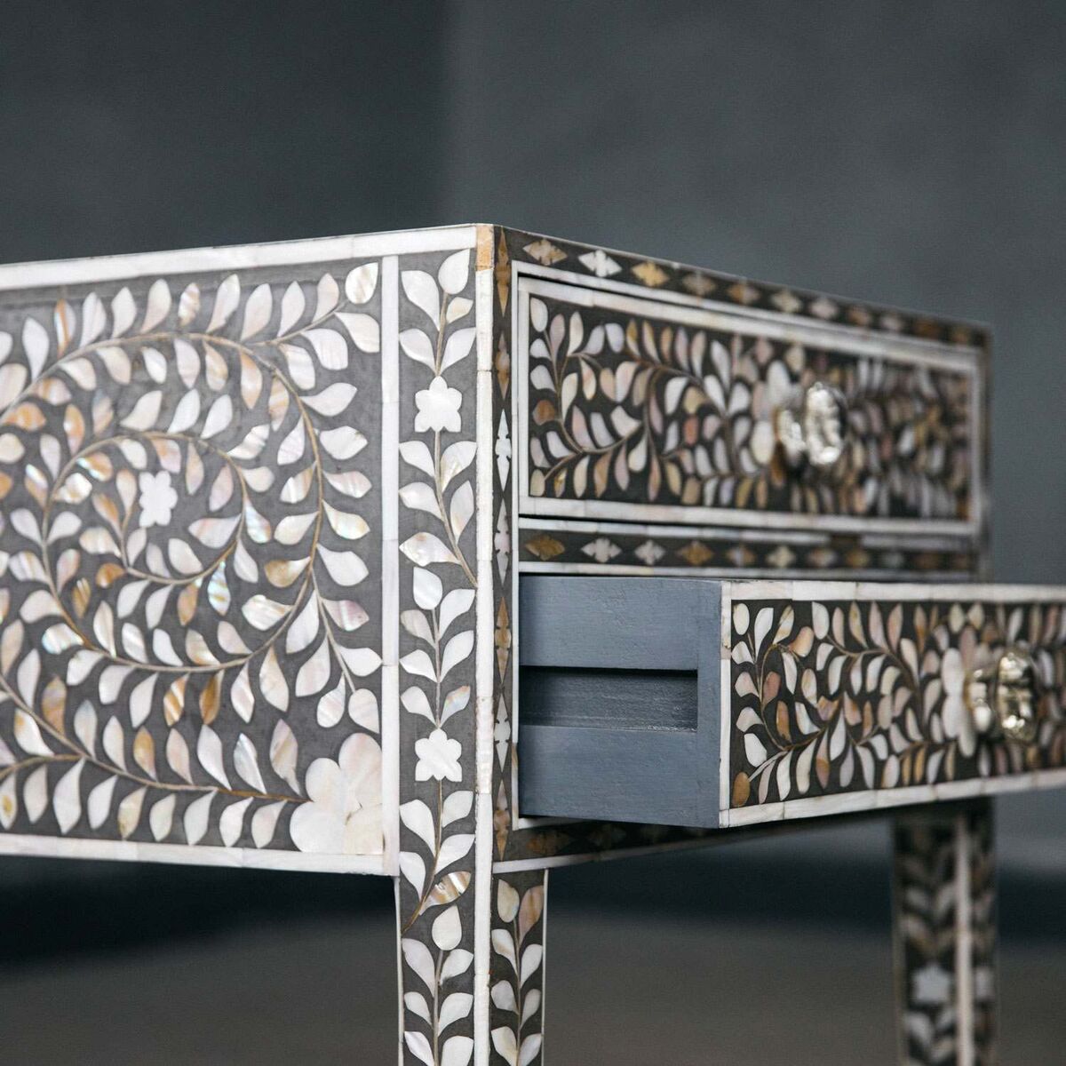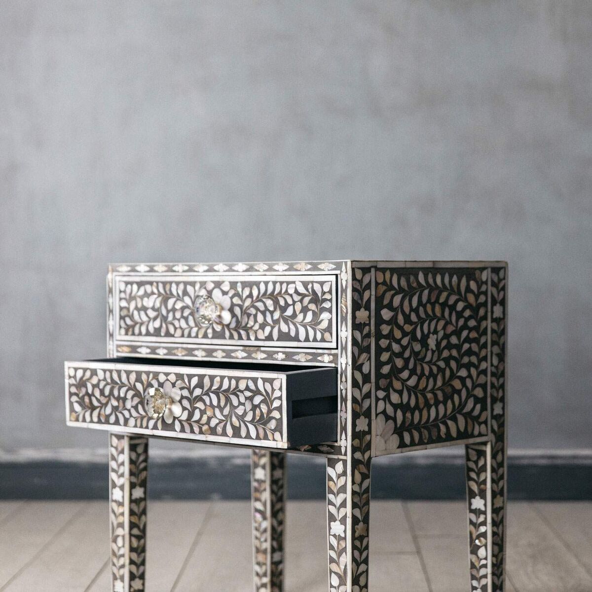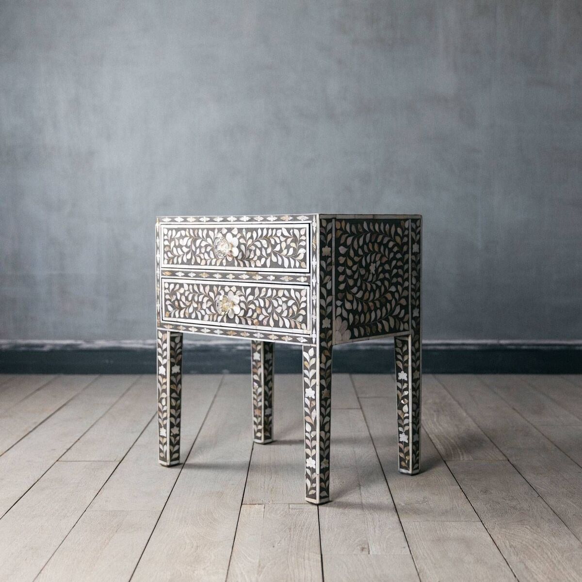 Our wonderfully whimsical Maxi Grey floral Mother of Pearl bedside table is designed exclusively by Jamie Graham and is destined for stardom. The frame is built from durable sal wood, with an MDF backing board to prevent warping.