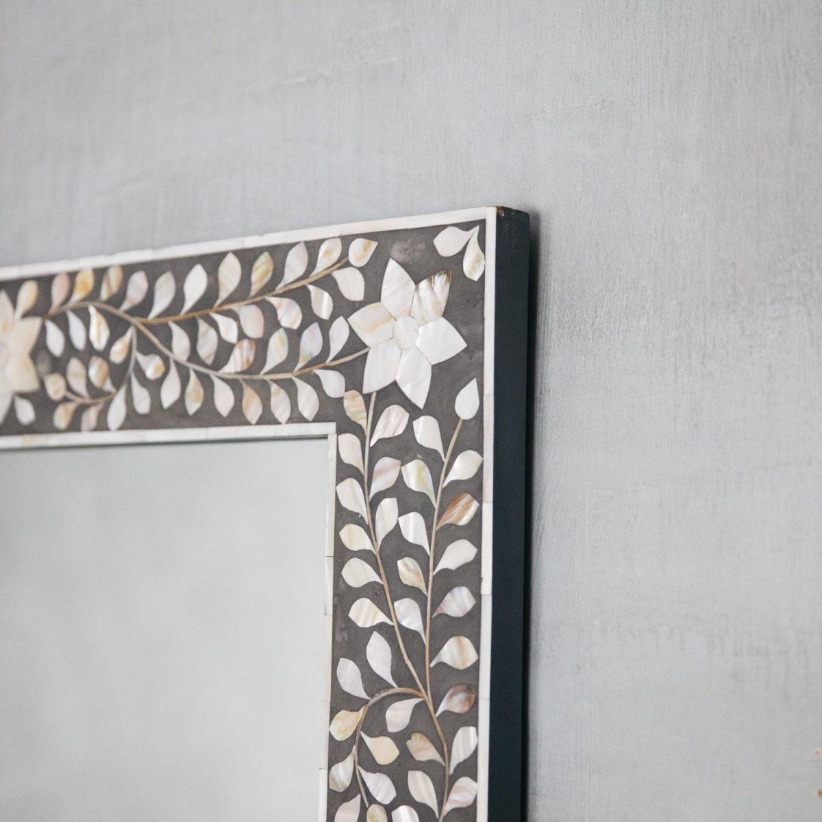 Exquisitely hand crafted in Jaipur by a team of skilled craftsmen. Individual pieces of mother-of-pearl have been lovingly hand carved and fixed into grey resin, on a sustainable mango wood frame, to create a beautiful floral design in sophisticated neutrals.