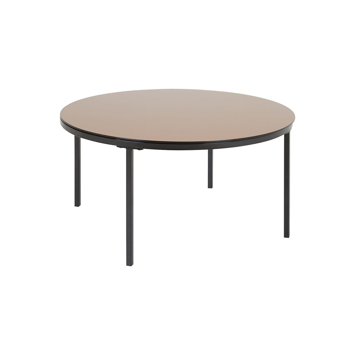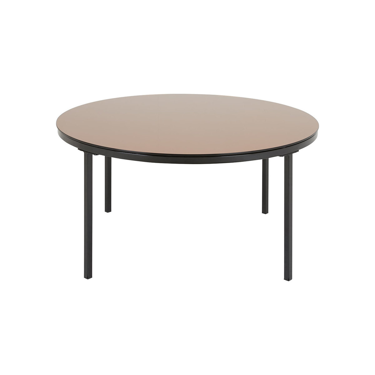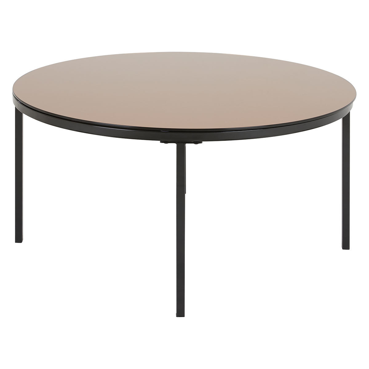 The Maxim bronze mirrored glass coffee table combines clean lines with an angular form to make a bold statement in the living room. Sophisticated and on-trend, this coffee table is supported by a sturdy, minimalist powder coated metal frame that lends style to your space. A black smoked glass round top provides the perfect place for magazines and TV remotes. With a small footprint, Maxim provides a great focal point and is perfect for modern spaces. Part of the Maxim range, a matching side table is available as well as with a black glass top.