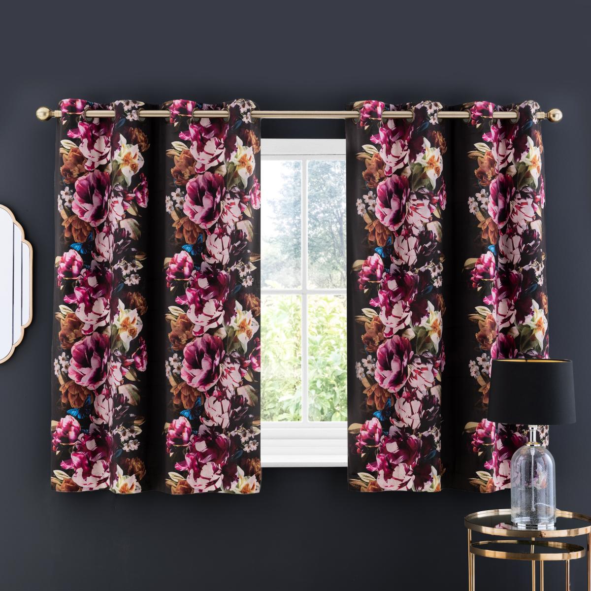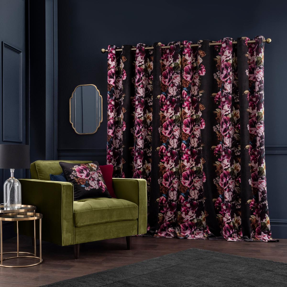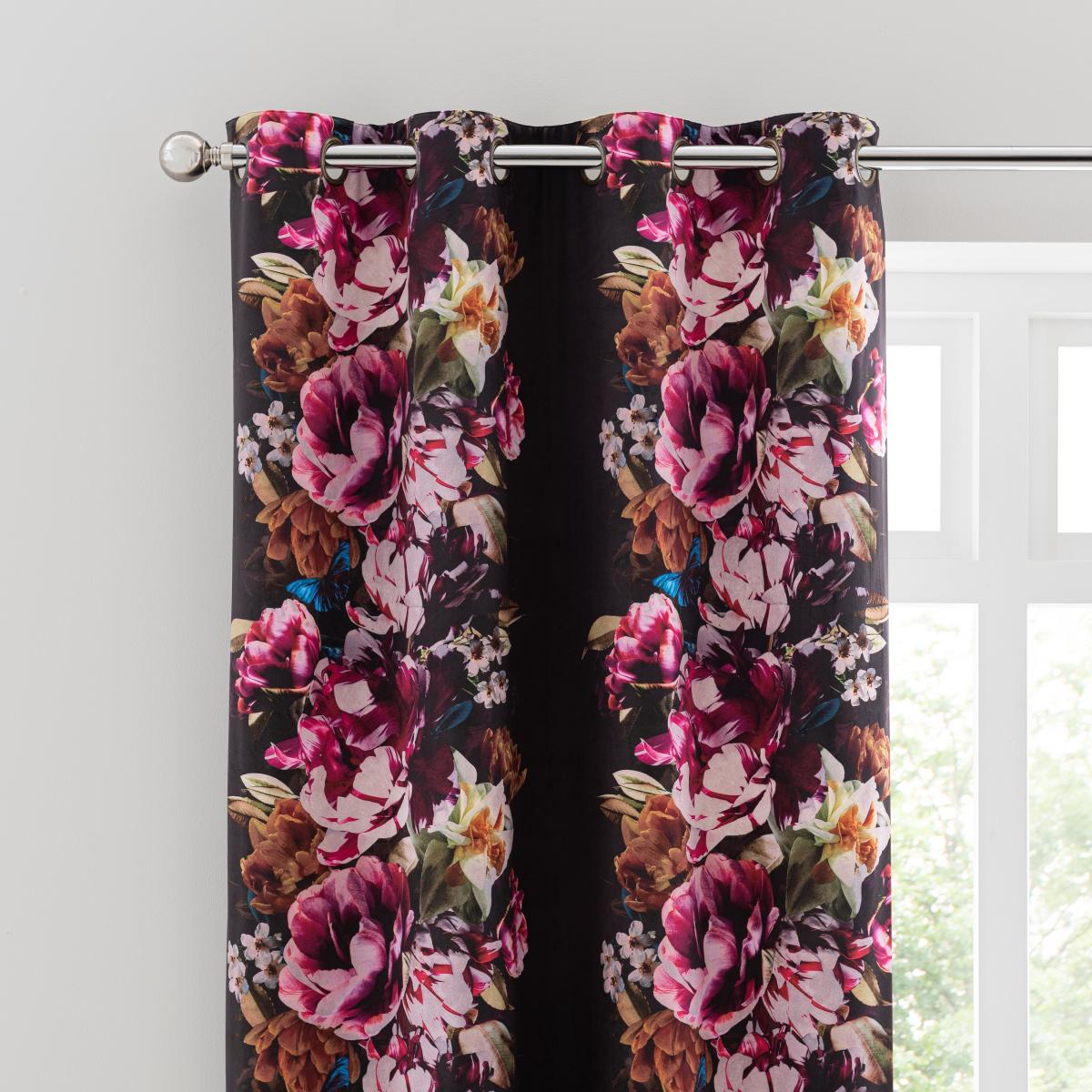 For maximum impact, dress your room with these luxurious velour curtains featuring a colourful print of realistic looking large florals. Fully lined to protect your curtain fabric, the lining provides fullness and drape at the same time. These curtains come with an easy to hang eyelet header and are available in a variety of sizes. Pair with coordinating cushions in the same design for real drama. Please note:. Pattern matching can not be guaranteed across multiple pairs of curtains. This collection is verified by OEKO-TEX® and independently tested for harmful substances as well as manufactured using sustainable processes under socially responsible working conditions.