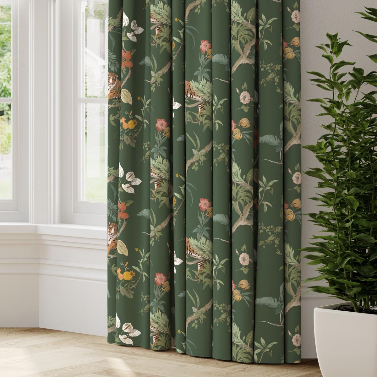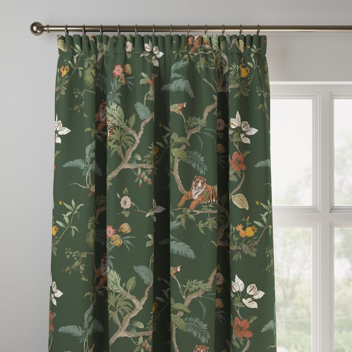 Perfect for those who think less does not mean more, this beautiful statement design is digital printed on a luxurious velvet fabric and showcases a jungle-inspired design and features a hand drawn tiger. The Maximalist Bengal print is presented on a sophisticated olive or slate ground for a subtle contrast. Our Web Exclusive Maximalist range features 12 stunning, unique designs for curtains, upon a beautiful velvet fabric base, and includes a wide range of styles. Introducing wildlife and storytelling into your décor, with designs like Bengal, Cockatoo, Wagtail and Passion, will create a stunning focal point in any room. Inspired by nature, Maximalist also includes ‘full of life’ wildflower scenery fabrics such as Magnolia, Iris, Jacobean, Tropical and Palm. Displaying bright and wonderful colours upon soft velvet fabric bases will add drama and movement to any room. For windows that cannot wait, shop our range of. Ready Made Curtains. Please note: you measure for pinch pleat curtains in the same way as pencil pleat curtains. Online Only:. This product is only available to order online. Our expert virtual consultants can provide advice on measuring/fitting and style tips and our free samples can be ordered online to be delivered straight to your home to help you choose a fabric that's right for you. Once you're happy, simply place your order online and we'll do the rest.