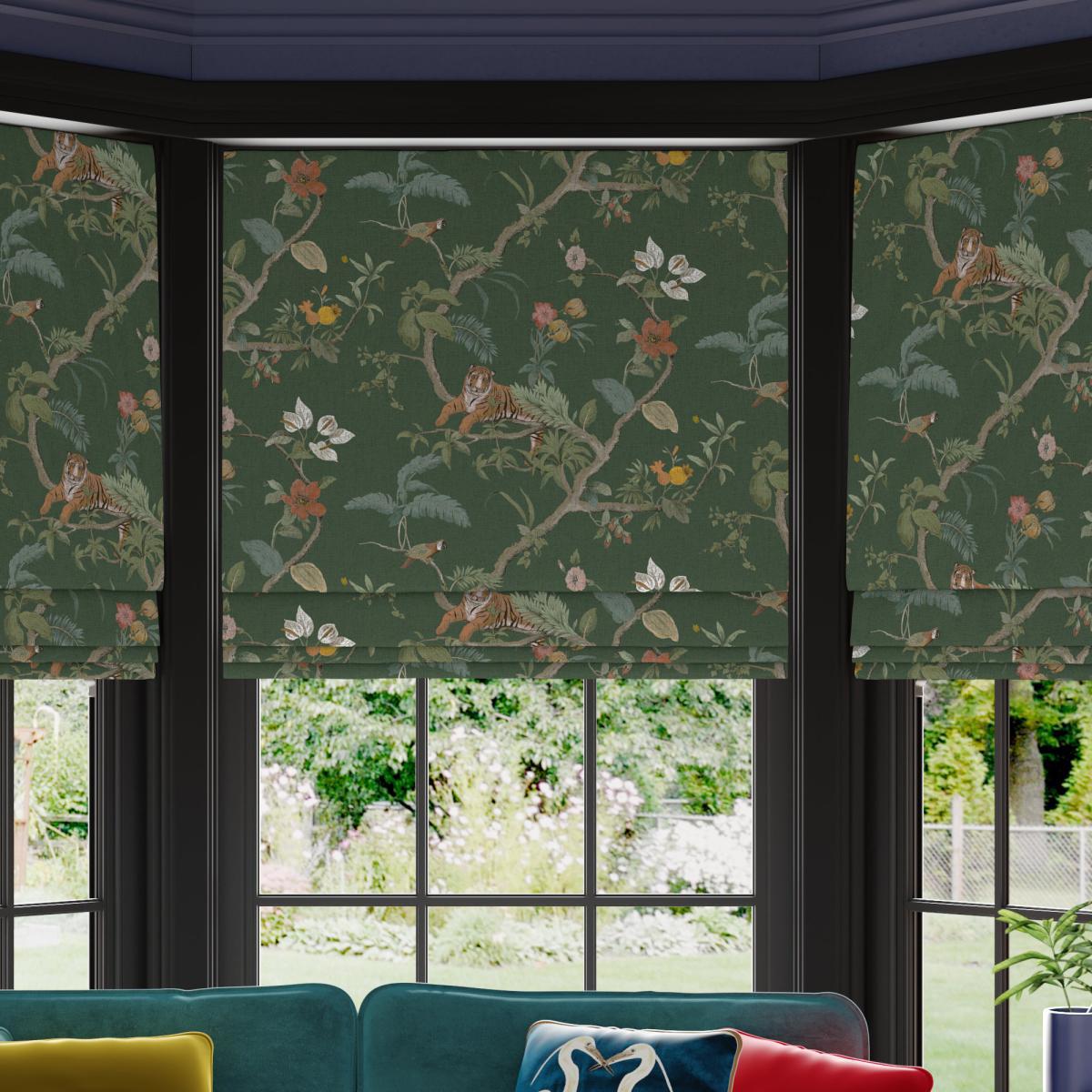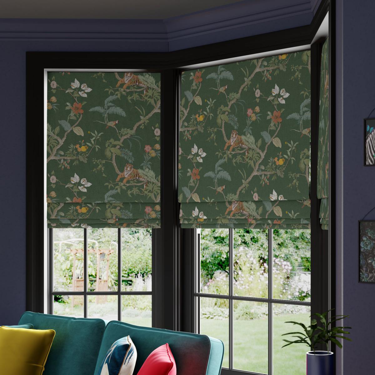Perfect for those who think less does not mean more, this beautiful statement design is digital printed and showcases a jungle-inspired design and features a hand drawn tiger. The Maximalist Bengal print is presented on a sophisticated olive or slate ground for a subtle contrast. Our Web Exclusive Maximalist range features 12 stunning, unique designs for curtains, upon a beautiful velvet fabric base, and includes a wide range of styles. Introducing wildlife and storytelling into your décor, with designs like Bengal, Cockatoo, Wagtail and Passion, will create a stunning focal point in any room. Inspired by nature, Maximalist also includes ‘full of life’ wildflower scenery fabrics such as Magnolia, Iris, Jacobean, Tropical and Palm. Displaying bright and wonderful colours upon soft velvet fabric bases will add drama and movement to any room. Choosing your lining:. Choosing your fitting type:. ;. Choosing which side you’d like the operating chain:. Child Safety:. We add clips to the back of our roman blinds to attach the cords to the fabric. They also double up as a child safety feature. If pressure is exerted the clips will detach to prevent the risk of strangulation. Please read our. Blinds Safety Guide. For more information. If the clips detach accidentally during normal use, they can be easily re-clipped back into place. Online Only:. This product is only available to order online. Our expert virtual consultants can provide advice on measuring/fitting and style tips and our free samples can be ordered online to be delivered straight to your home to help you choose a fabric that's right for you. Once you're happy, simply place your order online and we'll do the rest.