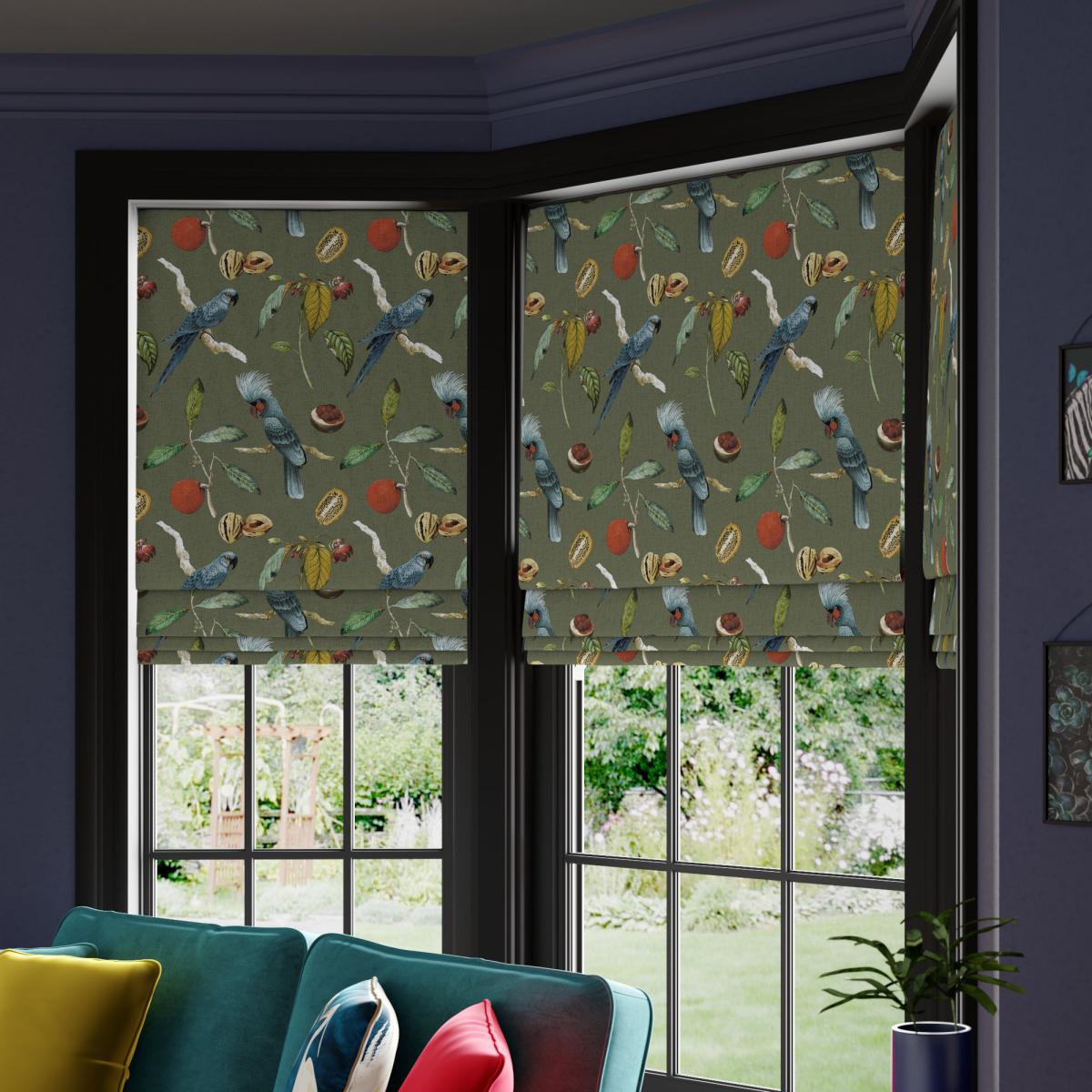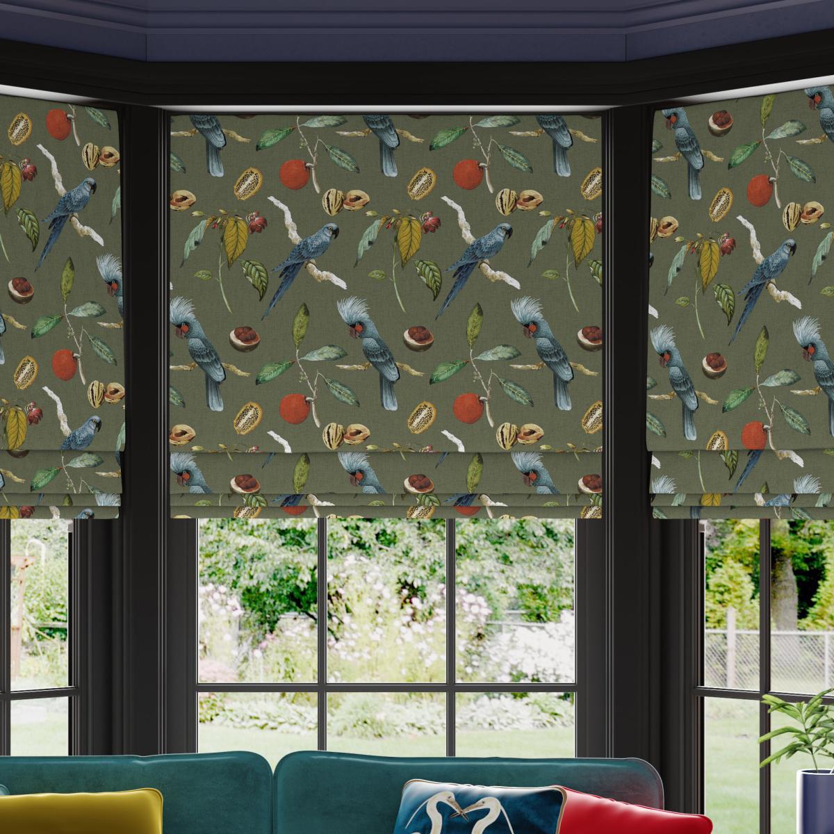 The digitally printed design features an intricately hand painted cockatoo and foliage placement design elegantly presented on a rich ink or sophisticated olive ground. The Maximalist Cockatoo design is bold, fun, and perfect for a truly showstopping look in your home. Our Web Exclusive Maximalist range features 12 stunning, unique designs for curtains, upon a beautiful velvet fabric base, and includes a wide range of styles. Introducing wildlife and storytelling into your décor, with designs like Bengal, Cockatoo, Wagtail and Passion, will create a stunning focal point in any room. Inspired by nature, Maximalist also includes ‘full of life’ wildflower scenery fabrics such as Magnolia, Iris, Jacobean, Tropical and Palm. Displaying bright and wonderful colours upon soft velvet fabric bases will add drama and movement to any room. Choosing your lining:. Choosing your fitting type:. ;. Choosing which side you’d like the operating chain:. Child Safety:. We add clips to the back of our roman blinds to attach the cords to the fabric. They also double up as a child safety feature. If pressure is exerted the clips will detach to prevent the risk of strangulation. Please read our. Blinds Safety Guide. For more information. If the clips detach accidentally during normal use, they can be easily re-clipped back into place. Online Only:. This product is only available to order online. Our expert virtual consultants can provide advice on measuring/fitting and style tips and our free samples can be ordered online to be delivered straight to your home to help you choose a fabric that's right for you. Once you're happy, simply place your order online and we'll do the rest.