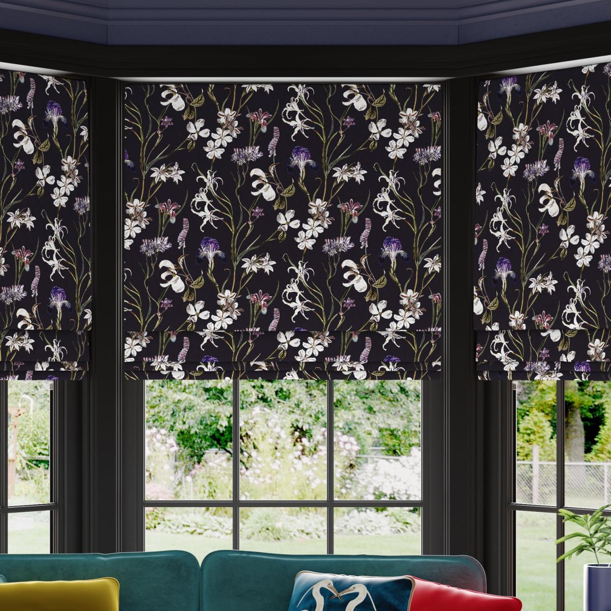 The delightful design of the beautiful hand painted blooms in soft, light colours are placed on an opulent dark ground for a stylish contrast. This subtle, digitally printed design brings about a peaceful atmosphere that will add extra warmth to any home. Our Web Exclusive Maximalist range features 12 stunning, unique designs for curtains, upon a beautiful velvet fabric base, and includes a wide range of styles. Introducing wildlife and storytelling into your décor, with designs like Bengal, Cockatoo, Wagtail and Passion, will create a stunning focal point in any room. Inspired by nature, Maximalist also includes ‘full of life’ wildflower scenery fabrics such as Magnolia, Iris, Jacobean, Tropical and Palm. Displaying bright and wonderful colours upon soft velvet fabric bases will add drama and movement to any room. Choosing your lining:. Choosing your fitting type:. ;. Choosing which side you’d like the operating chain:. Child Safety:. We add clips to the back of our roman blinds to attach the cords to the fabric. They also double up as a child safety feature. If pressure is exerted the clips will detach to prevent the risk of strangulation. Please read our. Blinds Safety Guide. For more information. If the clips detach accidentally during normal use, they can be easily re-clipped back into place. Online Only:. This product is only available to order online. Our expert virtual consultants can provide advice on measuring/fitting and style tips and our free samples can be ordered online to be delivered straight to your home to help you choose a fabric that's right for you. Once you're happy, simply place your order online and we'll do the rest.