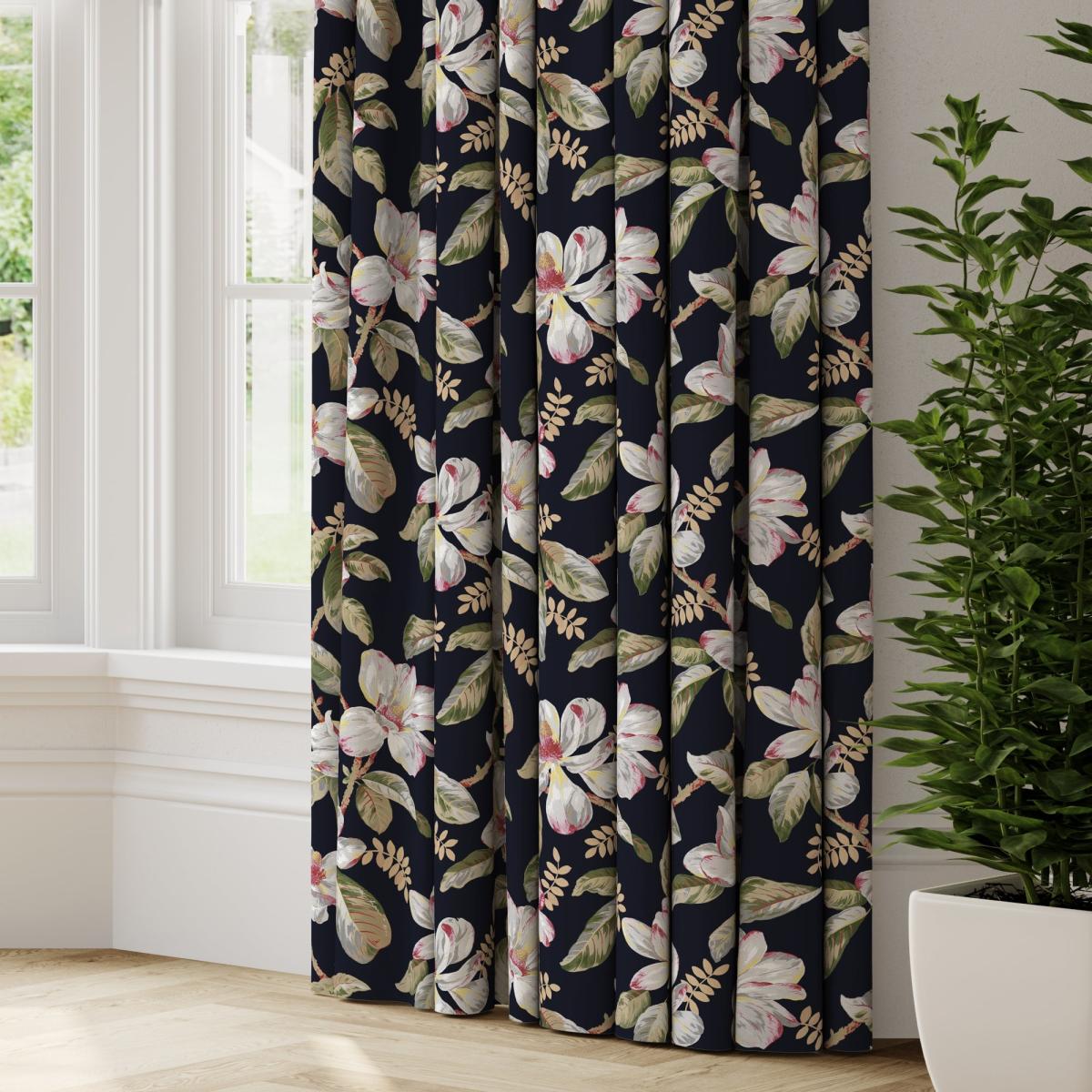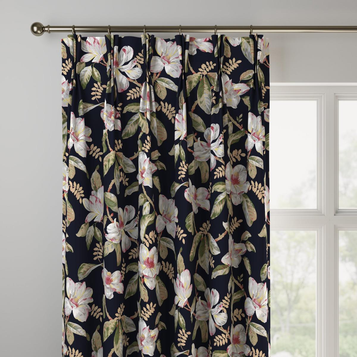A gorgeous, soft magnolia trail design is digitally printed on a rich black ground and soft velvet fabric for an elegant, luxe look. This showstopping delicate floral print makes a statement and brings energy to any room. Our Web Exclusive Maximalist range features 12 stunning, unique designs for curtains, upon a beautiful velvet fabric base, and includes a wide range of styles. Introducing wildlife and storytelling into your décor, with designs like Bengal, Cockatoo, Wagtail and Passion, will create a stunning focal point in any room. Inspired by nature, Maximalist also includes ‘full of life’ wildflower scenery fabrics such as Magnolia, Iris, Jacobean, Tropical and Palm. Displaying bright and wonderful colours upon soft velvet fabric bases will add drama and movement to any room. For windows that cannot wait, shop our range of. Ready Made Curtains. Please note: you measure for pinch pleat curtains in the same way as pencil pleat curtains. Online Only:. This product is only available to order online. Our expert virtual consultants can provide advice on measuring/fitting and style tips and our free samples can be ordered online to be delivered straight to your home to help you choose a fabric that's right for you. Once you're happy, simply place your order online and we'll do the rest.
