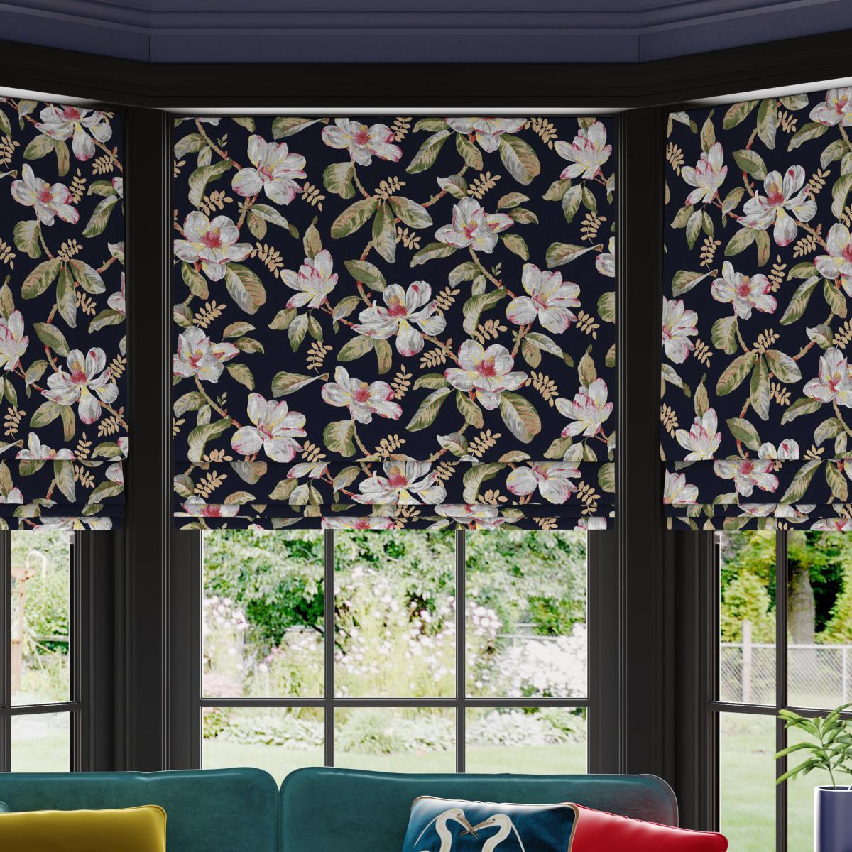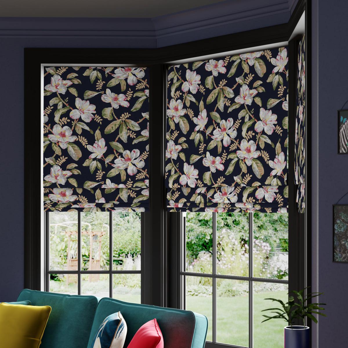 A gorgeous, soft magnolia trail design is digitally printed on a rich black ground for a stunning contrast and luxe look. This showstopping delicate floral print makes a statement and brings energy to any room. Our Web Exclusive Maximalist range features 12 stunning, unique designs for curtains, upon a beautiful velvet fabric base, and includes a wide range of styles. Introducing wildlife and storytelling into your décor, with designs like Bengal, Cockatoo, Wagtail and Passion, will create a stunning focal point in any room. Inspired by nature, Maximalist also includes ‘full of life’ wildflower scenery fabrics such as Magnolia, Iris, Jacobean, Tropical and Palm. Displaying bright and wonderful colours upon soft velvet fabric bases will add drama and movement to any room. Choosing your lining:. Choosing your fitting type:. ;. Choosing which side you’d like the operating chain:. Child Safety:. We add clips to the back of our roman blinds to attach the cords to the fabric. They also double up as a child safety feature. If pressure is exerted the clips will detach to prevent the risk of strangulation. Please read our. Blinds Safety Guide. For more information. If the clips detach accidentally during normal use, they can be easily re-clipped back into place. Online Only:. This product is only available to order online. Our expert virtual consultants can provide advice on measuring/fitting and style tips and our free samples can be ordered online to be delivered straight to your home to help you choose a fabric that's right for you. Once you're happy, simply place your order online and we'll do the rest.