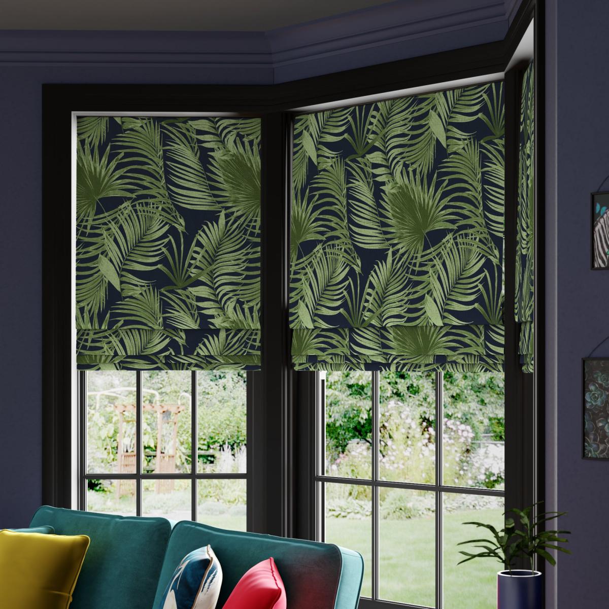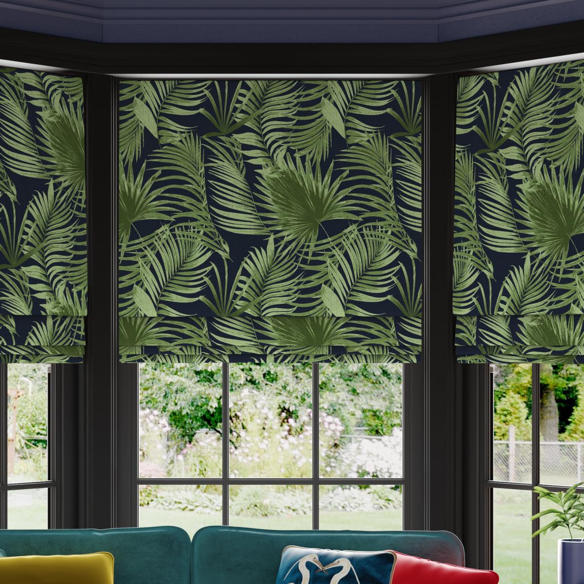 Hand painted palms are beautifully presented on an opulent dark ground, showcasing the soft and light colours of the gorgeous, digitally printed statement design. This trendy design makes a statement and adds an extra oomph to any home. Our Web Exclusive Maximalist range features 12 stunning, unique designs for curtains, upon a beautiful velvet fabric base, and includes a wide range of styles. Introducing wildlife and storytelling into your décor, with designs like Bengal, Cockatoo, Wagtail and Passion, will create a stunning focal point in any room. Inspired by nature, Maximalist also includes ‘full of life’ wildflower scenery fabrics such as Magnolia, Iris, Jacobean, Tropical and Palm. Displaying bright and wonderful colours upon soft velvet fabric bases will add drama and movement to any room. Choosing your lining:. Choosing your fitting type:. ;. Choosing which side you’d like the operating chain:. Child Safety:. We add clips to the back of our roman blinds to attach the cords to the fabric. They also double up as a child safety feature. If pressure is exerted the clips will detach to prevent the risk of strangulation. Please read our. Blinds Safety Guide. For more information. If the clips detach accidentally during normal use, they can be easily re-clipped back into place. Online Only:. This product is only available to order online. Our expert virtual consultants can provide advice on measuring/fitting and style tips and our free samples can be ordered online to be delivered straight to your home to help you choose a fabric that's right for you. Once you're happy, simply place your order online and we'll do the rest.