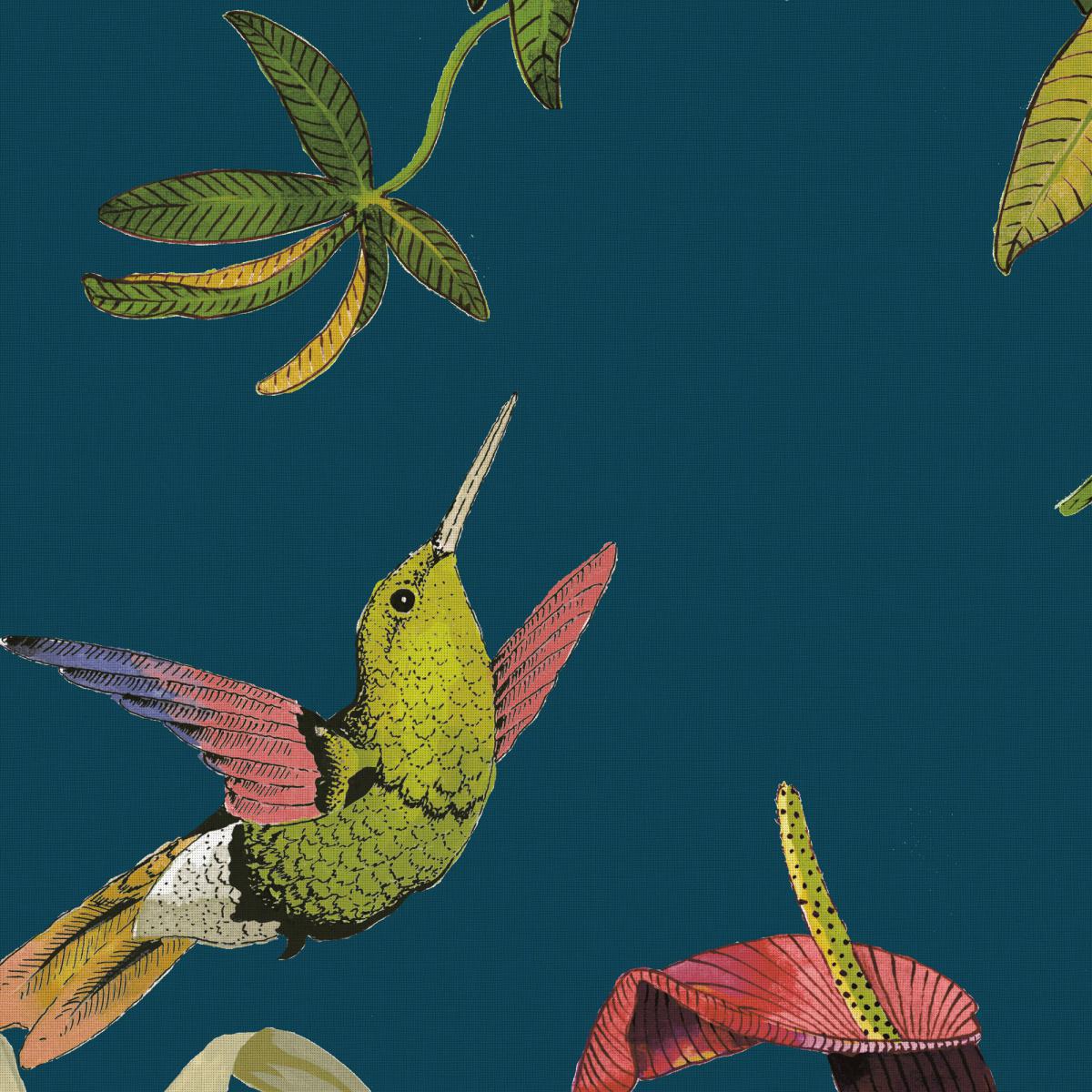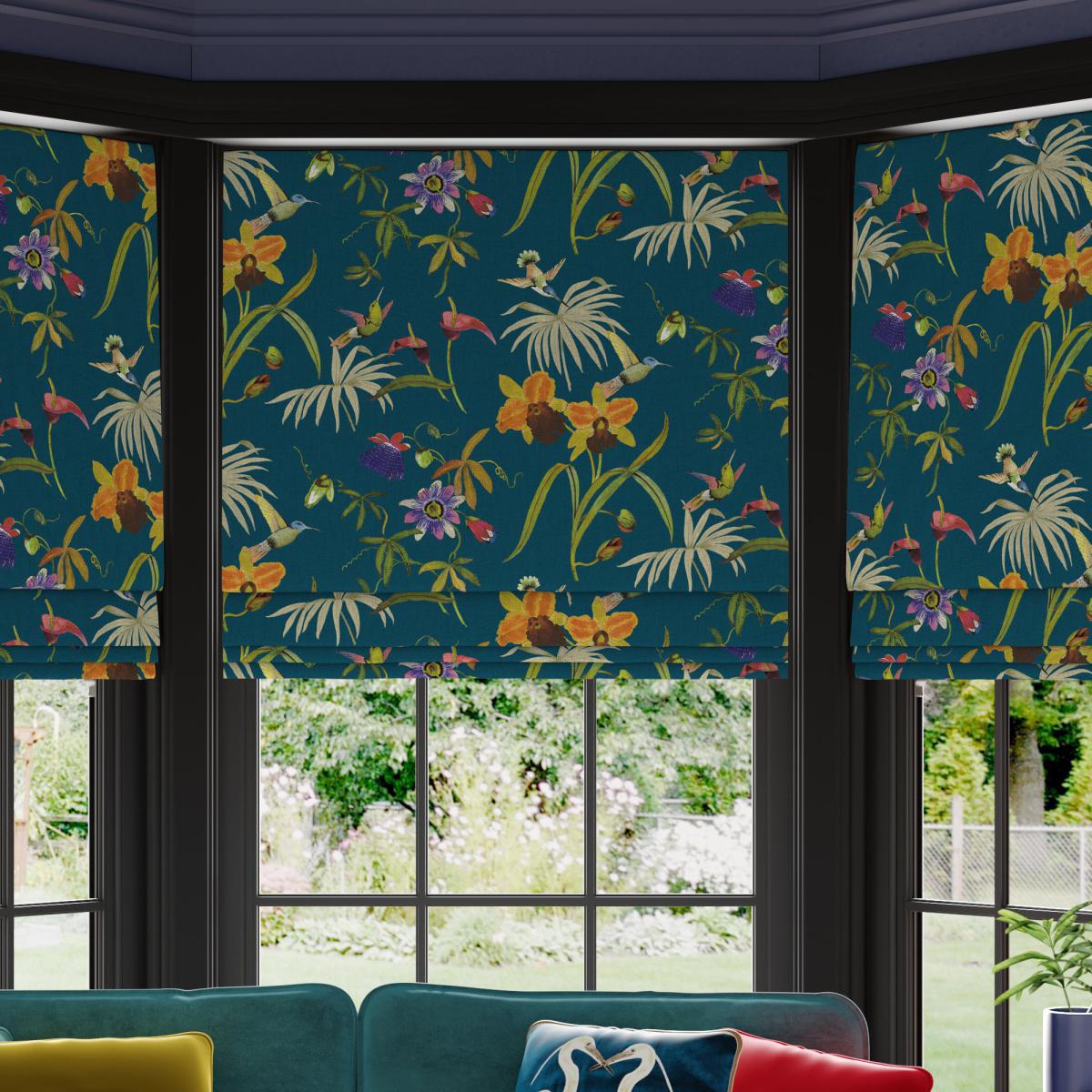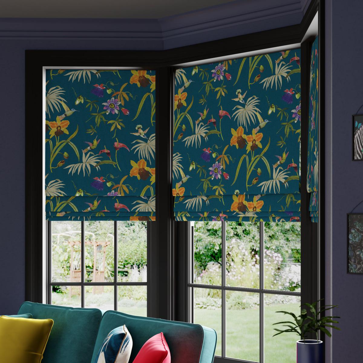 This digitally printed statement fabric features flying hummingbirds and a variety of beautiful, colourful Passiflora flowers on an opulent teal ground. This full of life print adds a stunning statement to your home. Our Web Exclusive Maximalist range features 12 stunning, unique designs for curtains, upon a beautiful velvet fabric base, and includes a wide range of styles. Introducing wildlife and storytelling into your décor, with designs like Bengal, Cockatoo, Wagtail and Passion, will create a stunning focal point in any room. Inspired by nature, Maximalist also includes ‘full of life’ wildflower scenery fabrics such as Magnolia, Iris, Jacobean, Tropical and Palm. Displaying bright and wonderful colours upon soft velvet fabric bases will add drama and movement to any room. Choosing your lining:. Choosing your fitting type:. ;. Choosing which side you’d like the operating chain:. Child Safety:. We add clips to the back of our roman blinds to attach the cords to the fabric. They also double up as a child safety feature. If pressure is exerted the clips will detach to prevent the risk of strangulation. Please read our. Blinds Safety Guide. For more information. If the clips detach accidentally during normal use, they can be easily re-clipped back into place. Online Only:. This product is only available to order online. Our expert virtual consultants can provide advice on measuring/fitting and style tips and our free samples can be ordered online to be delivered straight to your home to help you choose a fabric that's right for you. Once you're happy, simply place your order online and we'll do the rest.