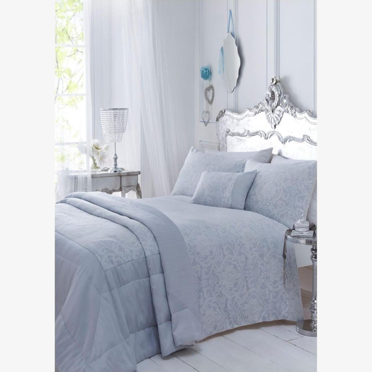 Bring some elegance into your bedroom with this cushion featuring a luxurious detailed jacquard pattern in a sky blue and white colourway. The muted tones of this cushion allows for mixing and matching with other colours and cushions. Small and easy to accessorise with.