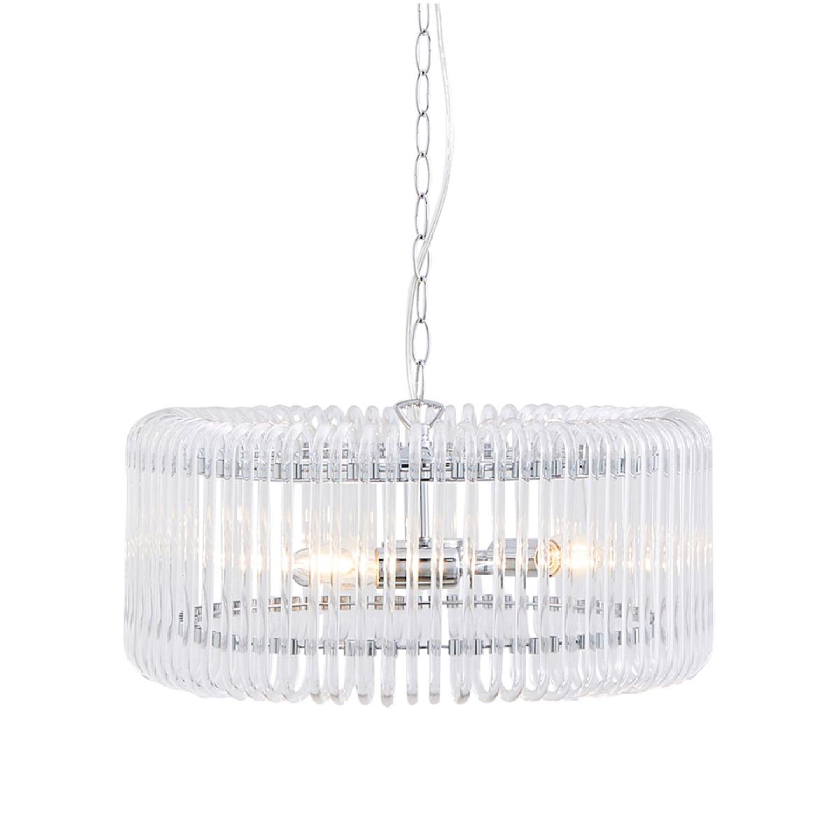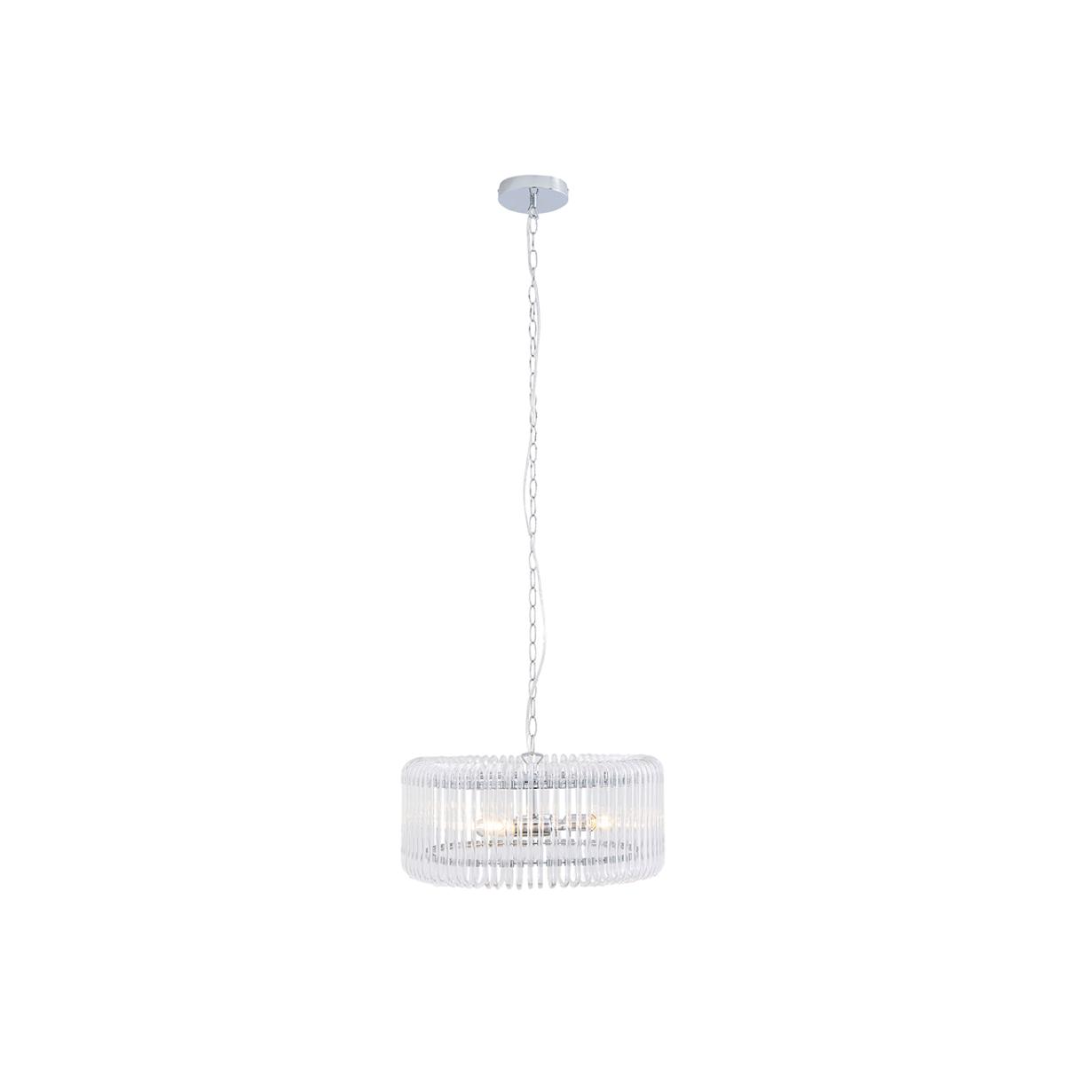 Add timeless elegance to your home with the May 3-Light Chrome Ceiling Pendant, a Pagazzi Lighting exclusive that perfectly balances classic sophistication with modern flair. This stunning pendant combines a traditional chain and cable suspension with a sleek, contemporary clear shade, making it a versatile centrepiece for both modern and transitional interiors. The clear outer shade features a vertical tubular structure that beautifully diffuses light, allowing the three horizontal bulbs within to emit a soft, ambient glow. The result is a harmonious blend of sparkle and subtlety — ideal for enhancing your dining room, living space, or hallway with understated luxury. Crafted in polished chrome, the May pendant delivers a refined shine and exceptional light clarity. It is dimmable when paired with compatible dimmable bulbs and a dimmer switch, allowing you to set the perfect atmosphere for any occasion.
