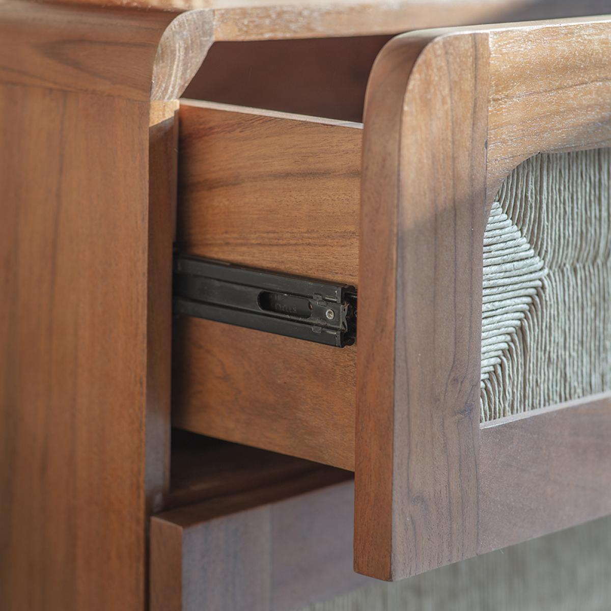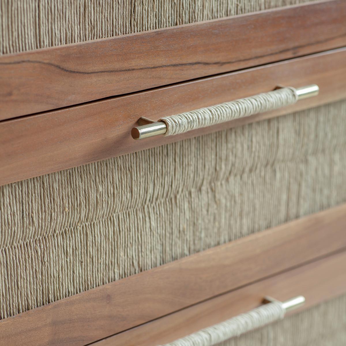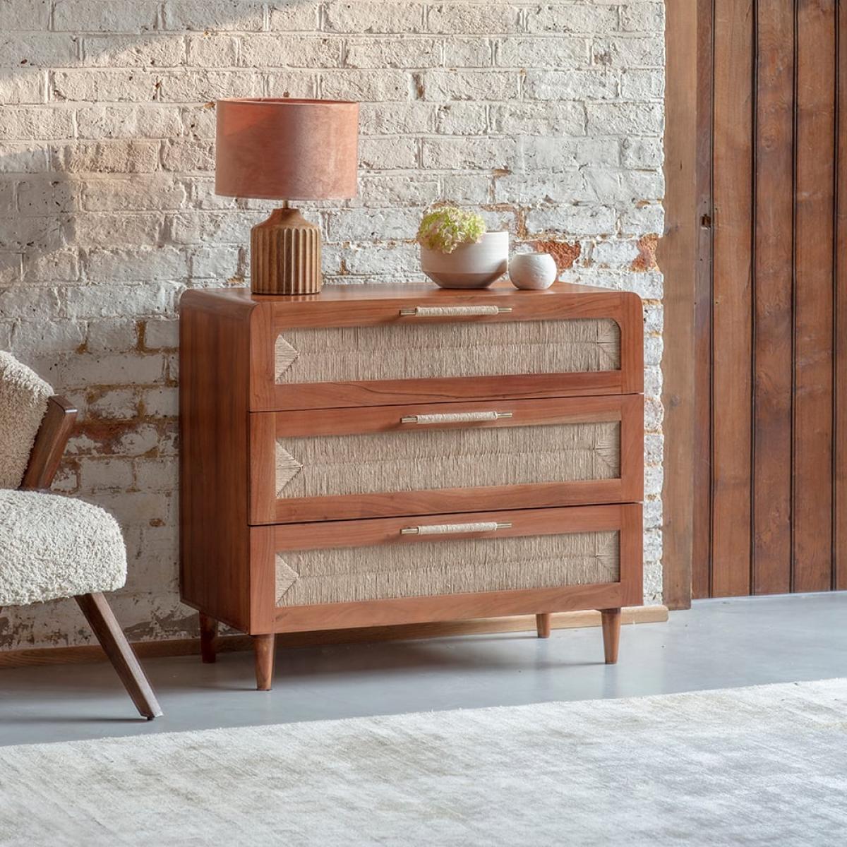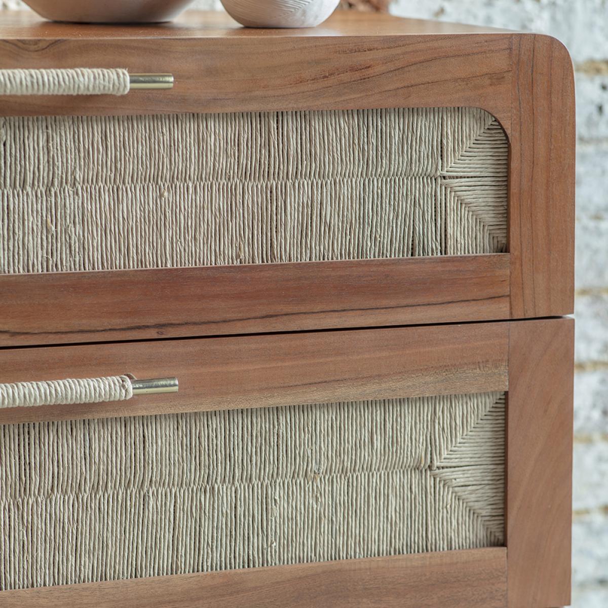 In line with the trend for rattan, wicker and cane furniture with an artisan, handcrafted look, our Maya Chest of Drawers is a contemporary celebration of minimalist silhouettes and natural materials. The design is understated and luxurious, with handcrafted acacia wood and hand woven Danish cord design. The Danish paper cord is a sustainable material made of paper and is biodegradable. The Maya rattan style chest features three drawers for plenty of storage space. The generous proportions of this cord chest of drawers feature distinct wrapped handle details to enhance the modern, minimalist chest of drawers style. Matching bed and bedside tables available.
