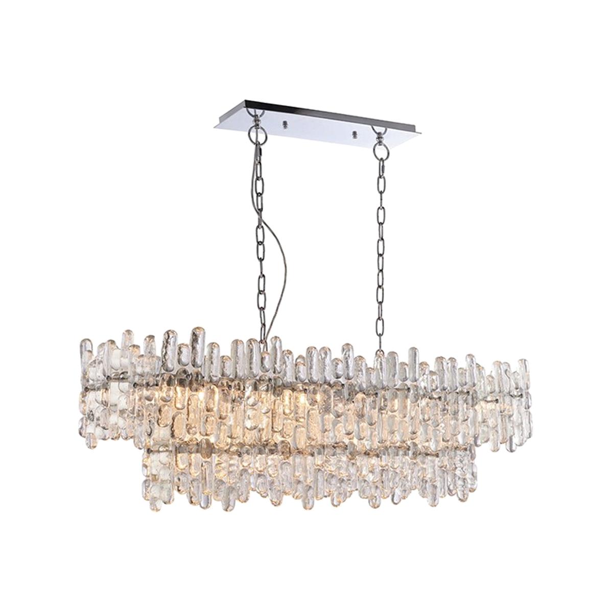 Like delicately melting ice crystals this linear pendant is formed from multiple clear glass decorations that create the most stunning centre piece to hang in your bedroom, suspend over a dining table, or position in any of your most loved interiors. Impressive and beautiful, perfect to pair with LED filament lamps to achieve an enchanting diffused light effect. Finished in chrome plated metal work and suspended from chrome plated chain with clear flex.