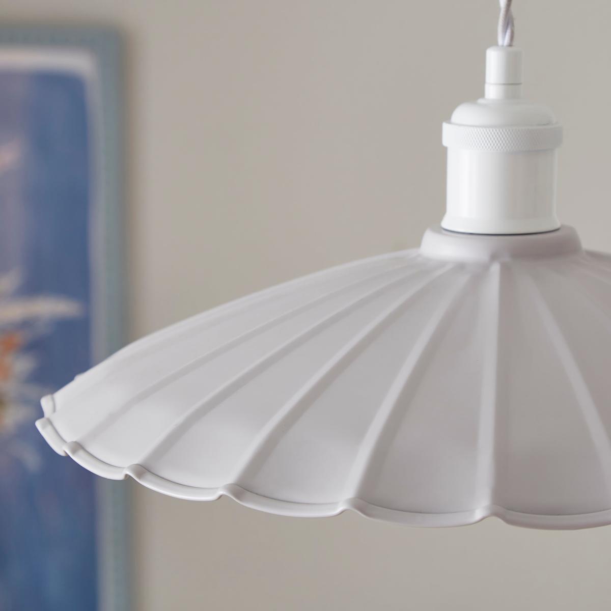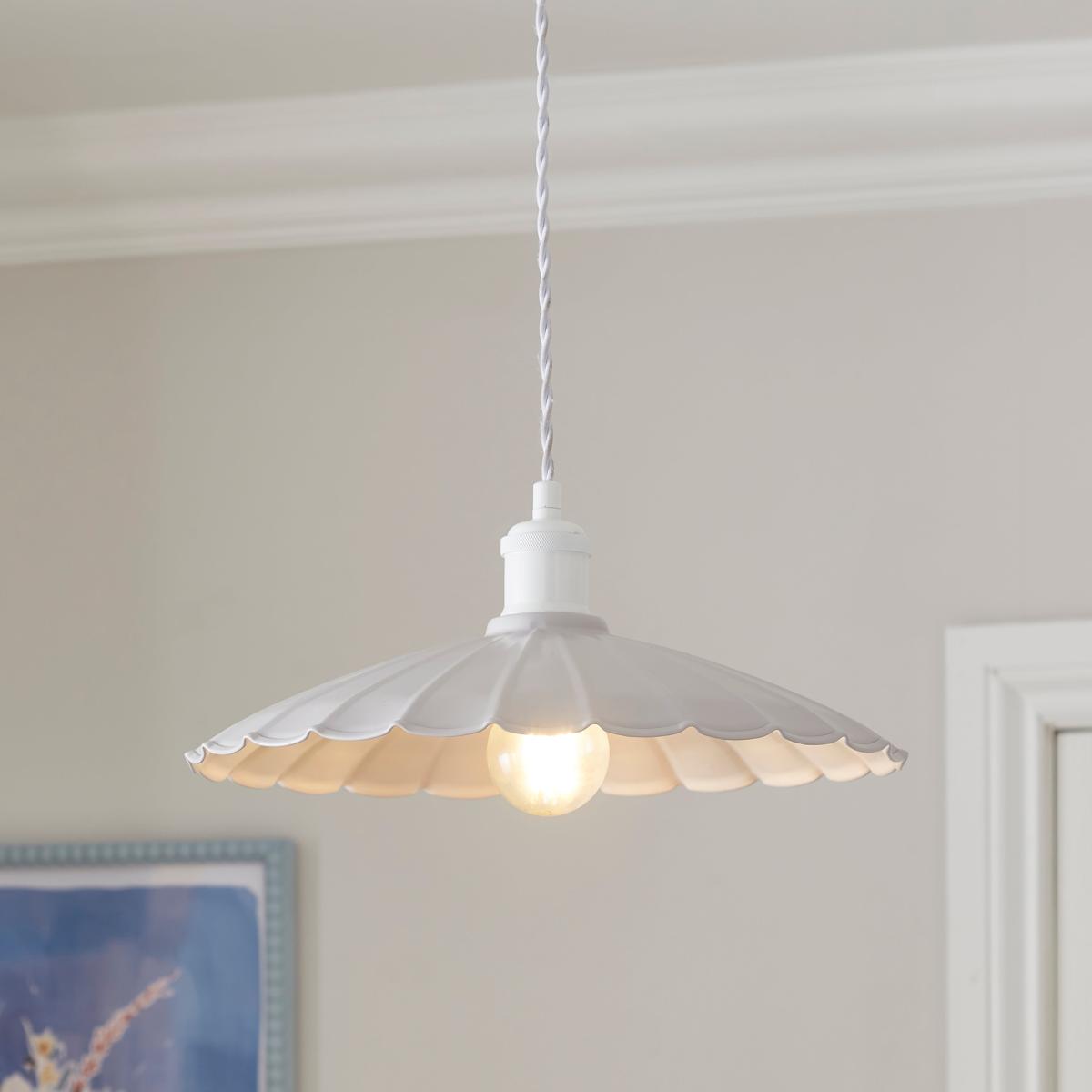 * Feminine, Scalloped Design* Easy Fit - No Electrician Required* Available in Multiple Colourways A beautifully feminine design with an extreme taper, perfect for showcasing an oversized decorative bulb. Available in multiple colourways, this easy-fit pendant shade requires no electrician, making it a stylish and convenient addition to any room.