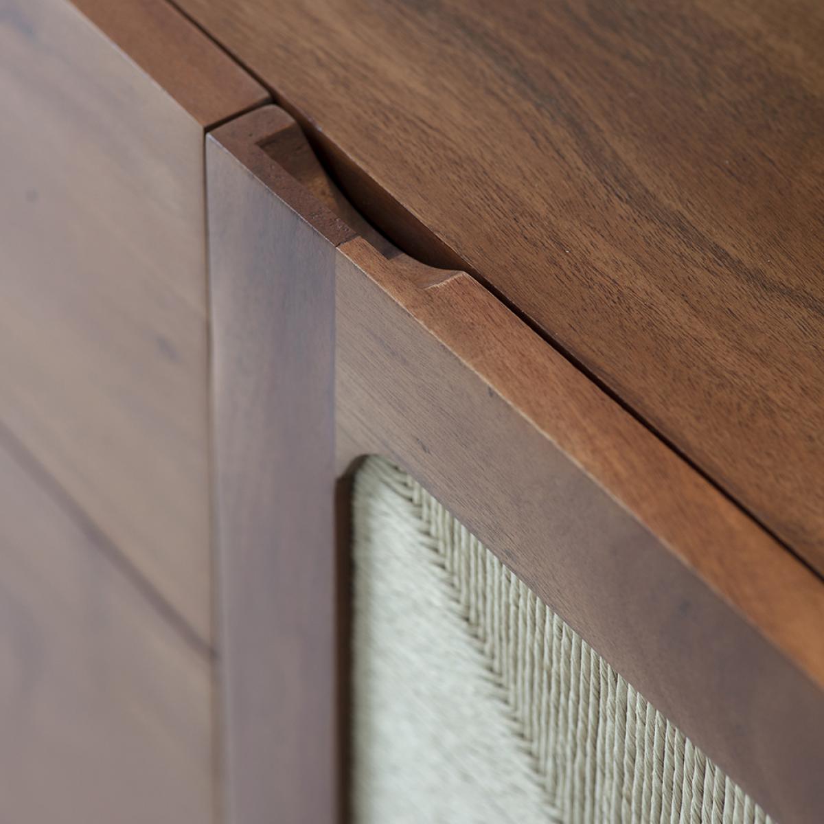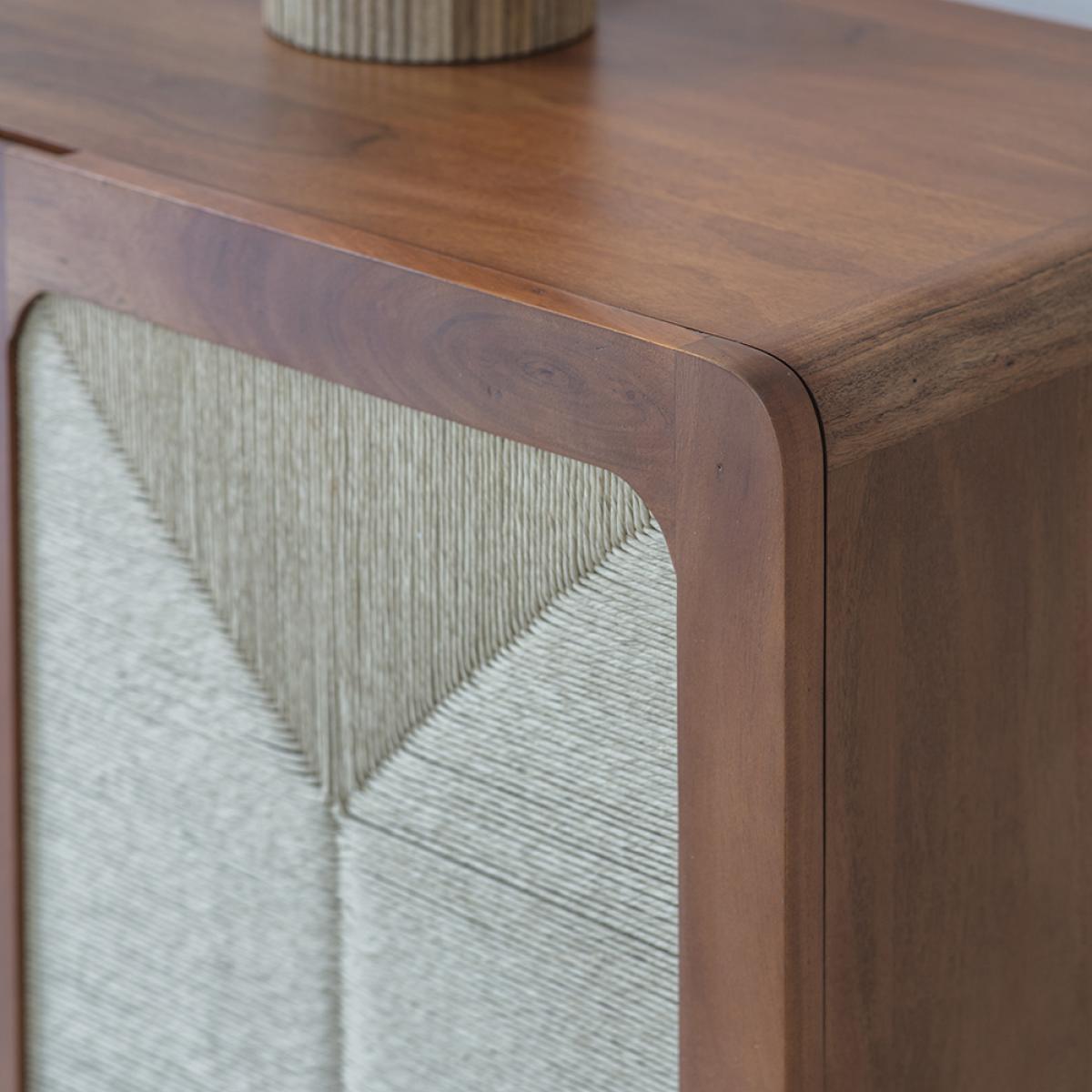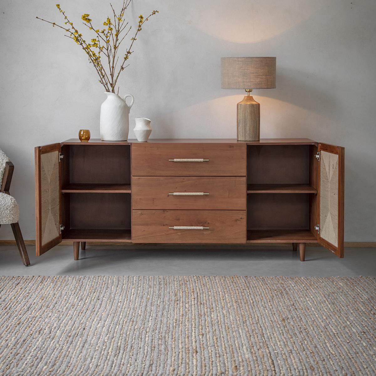 In line with the trend for rattan, wicker and cane furniture with an artisan, handcrafted look, our Maya Sideboard is a contemporary celebration of minimalist silhouettes and natural materials. The design is understated and luxurious, with handcrafted acacia wood and hand woven Danish cord design. The Danish paper cord is a sustainable material made of paper and is biodegradable. Our Maya sideboard is big on storage, with three drawers and two cupboards for plenty of space inside. The generous proportions of this cord sideboard make it ideal for everything from crockery and cookware to drinks and books while the distinct wrapped handle details enhance the modern, minimalist sideboard style.