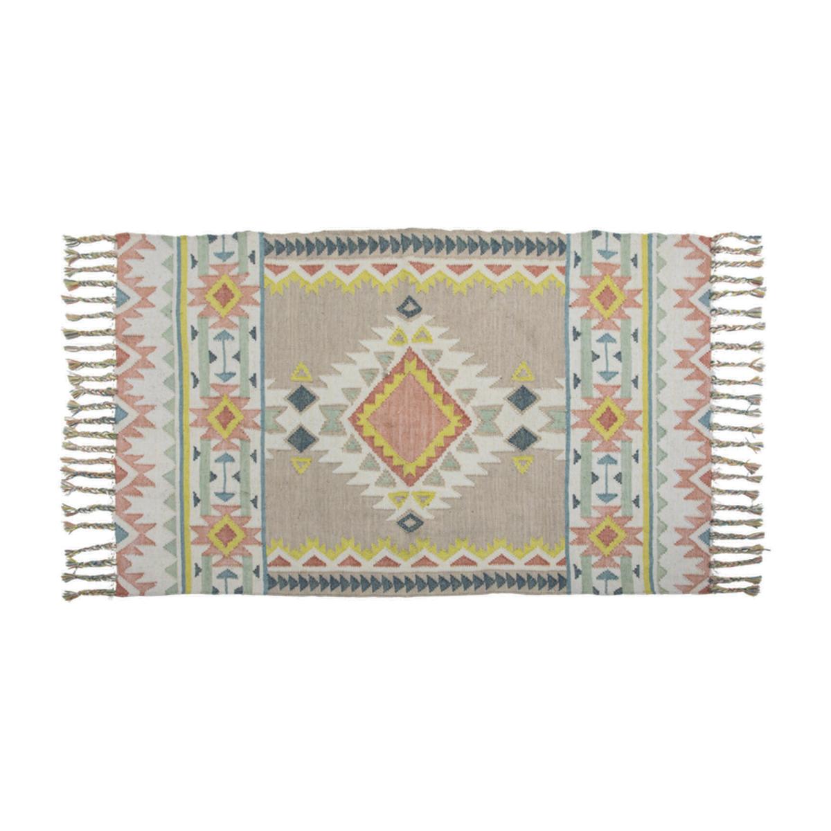 I really like the Mayan Killim rug for its bold geometric pattern and rich history, which can add a striking visual element to both contemporary and bohemian interiors. It works particularly well layered over wooden or concrete flooring, providing warmth and texture without overwhelming the space. Practical styling tips include pairing it with neutral furniture to let the design stand out, or contrasting it with more modern pieces for an eclectic feel. The fringed edges also make it a good choice for layered looks, such as with smaller runners or antique accessories. Overall, this rug is versatile and adds a sense of character and craftsmanship to any room it's placed in.