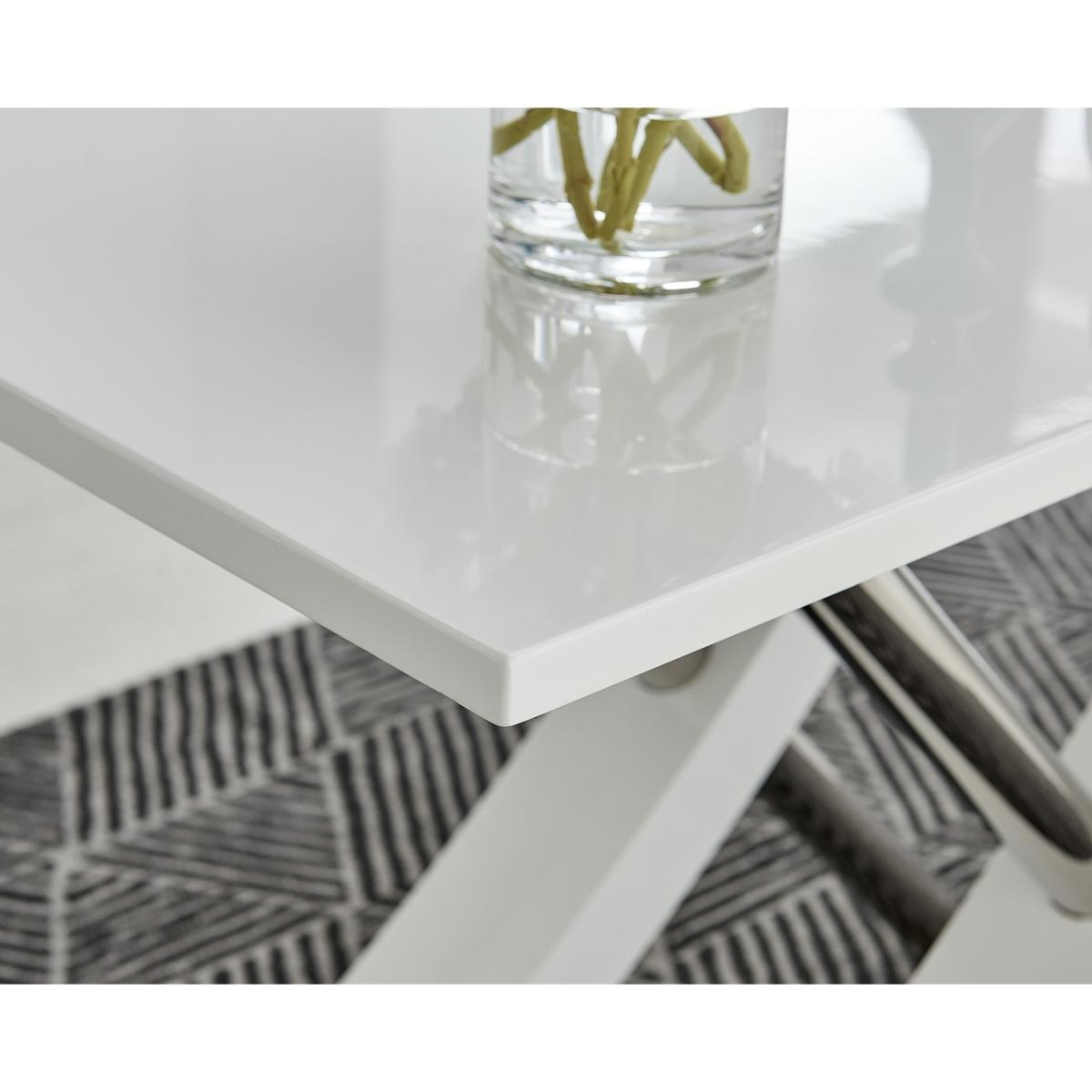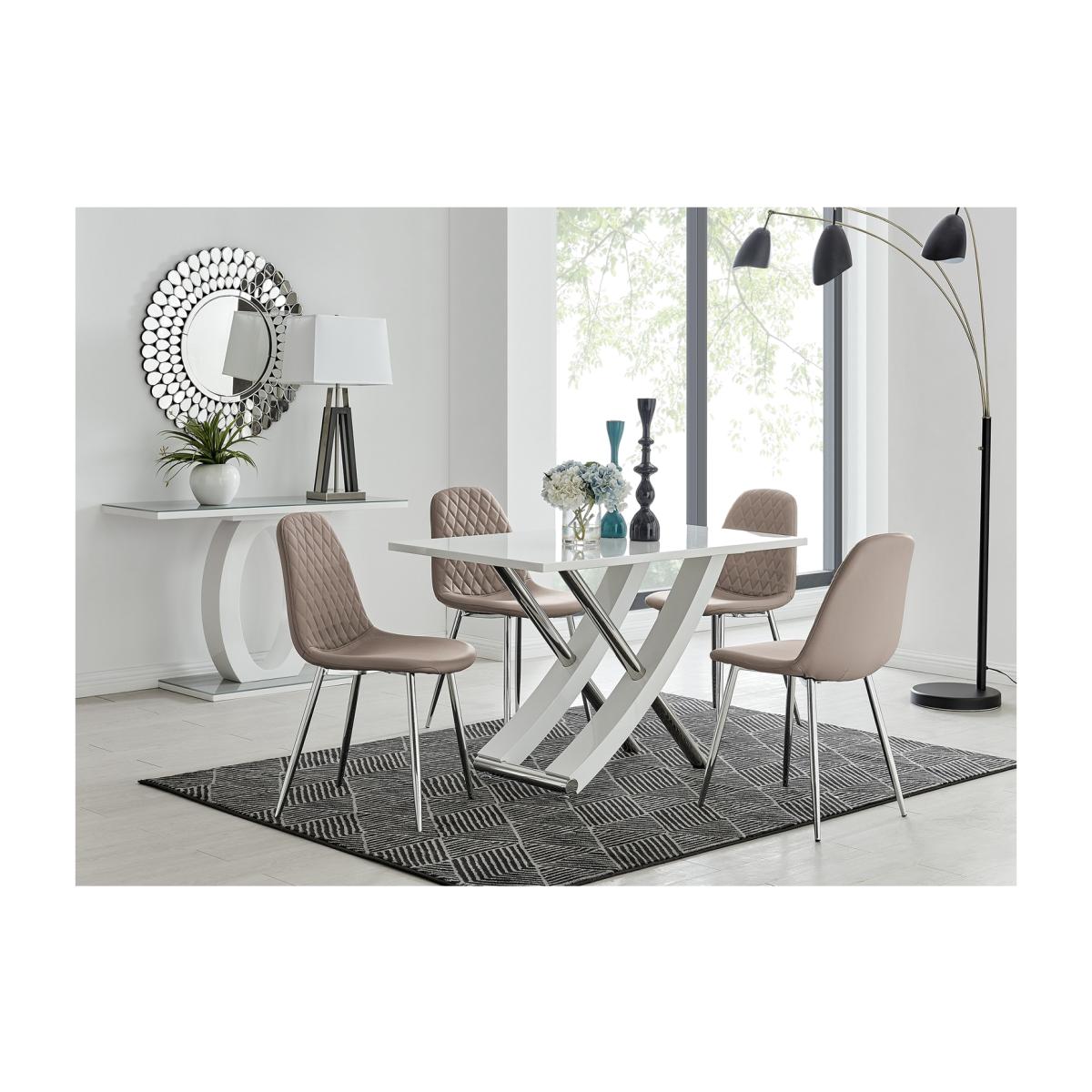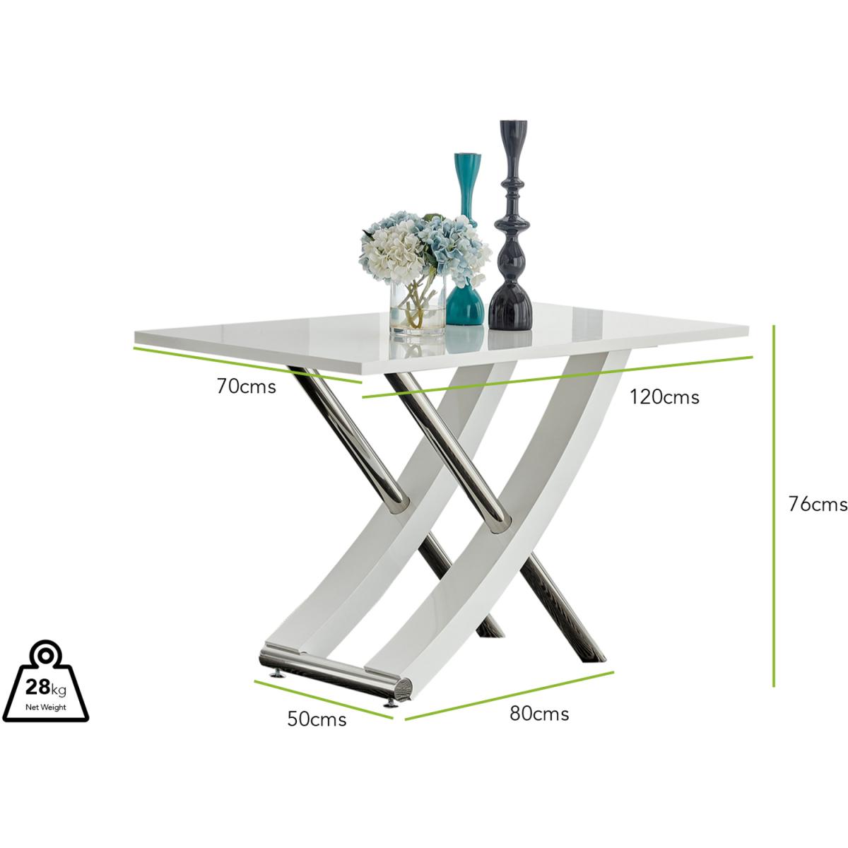 With a unique design and high quality finish throughout the Mayfair dining table really is a must have! The dining table is a stunning combination of high gloss and stainless steel metal boasting a 120x70cm surface, which allows plenty of room for dining with guests. As well as providing style the chrome metal legs act as an extremely strong support for the table and are finished to the highest standards. The table features easy wipeclean surfaces meaning your table will stay looking brand new for years to come! Exuding style and quality the Mayfair table is capable of being a centre piece in any modern home and really is a must have! Styled with our statement Corona dining chairs, this set is a perfect balance of pattern and texture. The trendy chrome legs of the Corona chairs are a great way to add an accent of lustre to your home. The Scandi-style faux leather seat with diamond pattern stitching is a unique take on a classic design offering comfort and durability for everyday use.