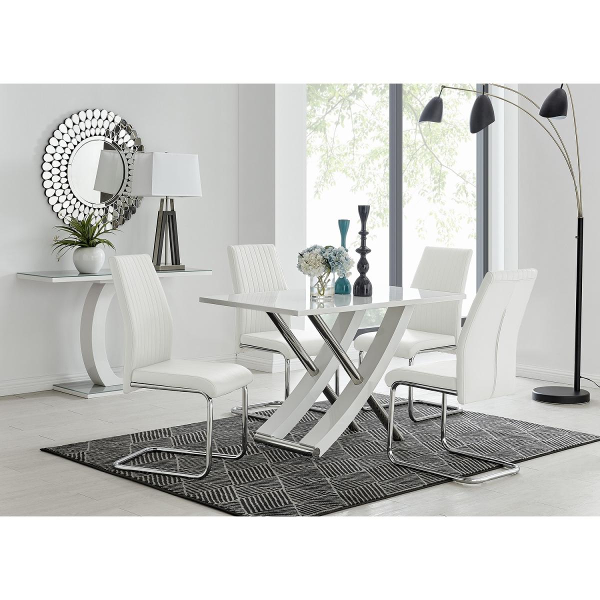 With a unique design and high quality finish throughout the Mayfair dining table really is a must have! The dining table is a stunning combination of high gloss and stainless steel metal boasting a 120x70cm surface, which allows plenty of room for dining with guests. As well as providing style the chrome metal legs act as an extremely strong support for the table and are finished to the highest standards. The table features easy wipeclean surfaces meaning your table will stay looking brand new for years to come! Exuding style and quality the Mayfair table is capable of being a centre piece in any modern home and really is a must have!Pair it with our Lorenzo chairs for the complete look. Featuring on trend chrome cantilevered legs and supportive seat pads, these are eye catching chairs, that don't compromise on comfort.