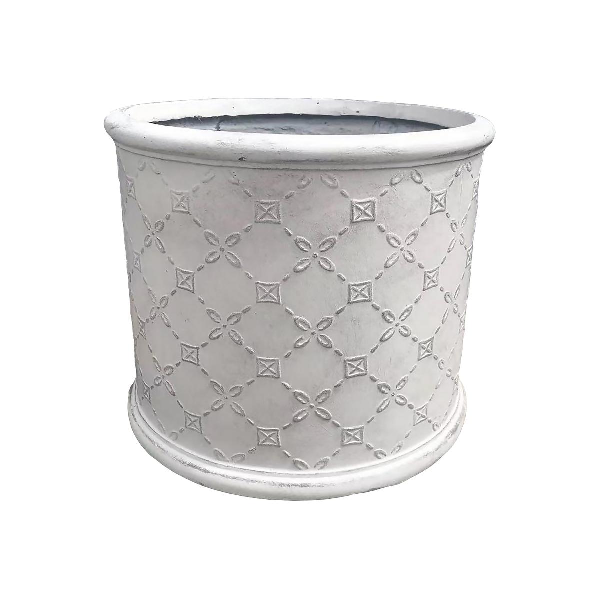 This patterned metal effect planter will age naturally, giving it the lasting charm and character of a vintage painted metal planter. Made from fibre clay cement, this allows the planter to be lighter than a traditional metal planter whilst having very fine details.